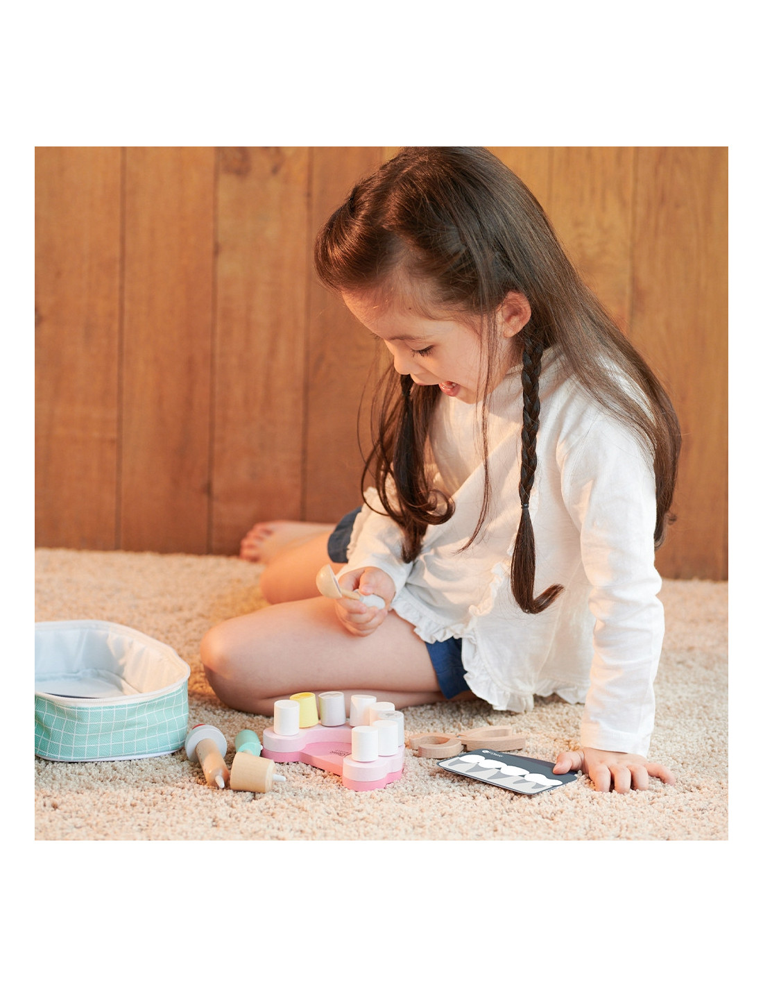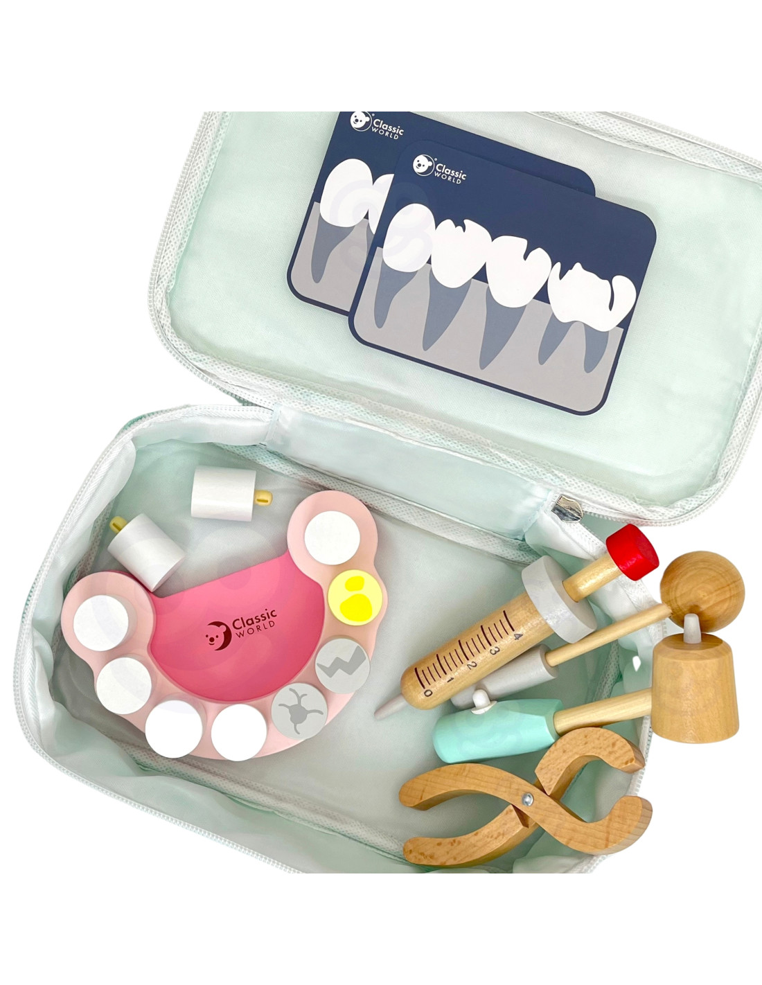 Drewniane narzędzia w torbie dla małego dentysty od marki CLASSIC WORLD. Ten zestaw zawiera wszystko, czego potrzebuje Twój mały Lekarz do zabawy w dentystę. Przyszli lekarze mogą robić zastrzyki, wyrywać oraz sprawdzać stan zębów u swoich pacjentów. Zabawa w Dentystę to nie tylko jedna z zabaw na odgrywanie ról, to również nauka dbania o higienę oraz skutki jej braku. Uczy także empatii i współodczuwania, co bardzo ważne w relacjach społecznych. Wspiera rozwój wyobraźni i uczy rozwiązywania problemów.