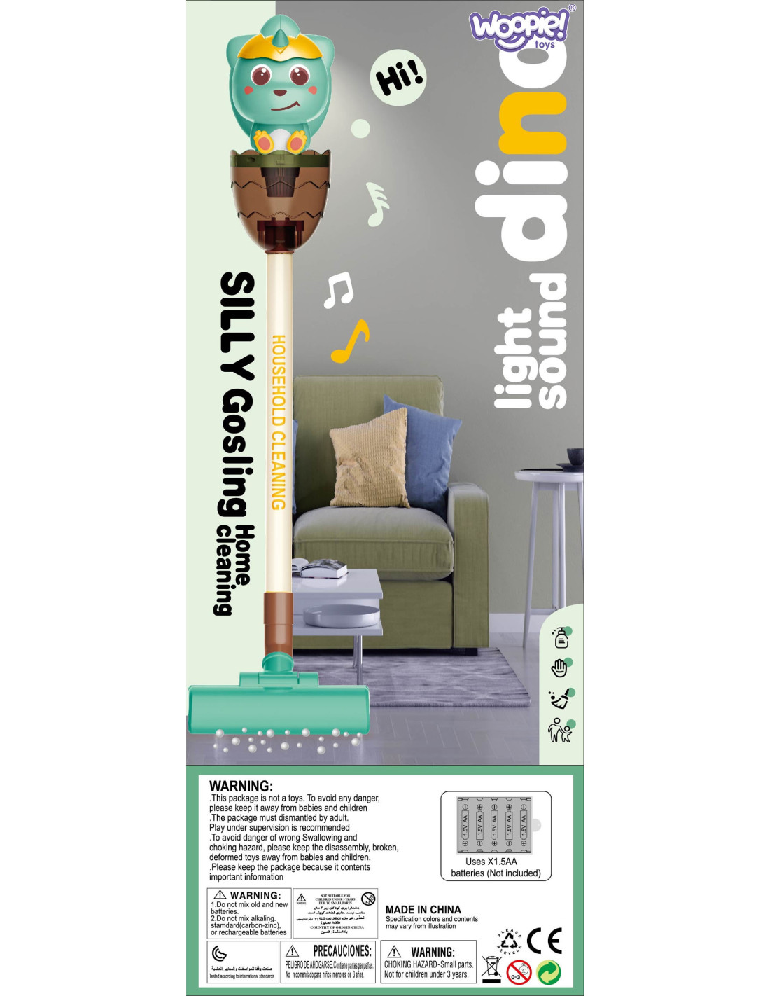 Odkurzacz 3w1 Dino od marki Woopie to idealna propozycja dla małych pomocników domowych. Funkcja ssania dźwięk i światła sprawią, że zabawa w sprzątanie będzie jeszcze bardziej realistyczna i atrakcyjna. Pierwsze kliknięcie na rączce uruchamia odkurzacz, drugie włącza wesołą melodię, a trzecie wyłącza odkurzacz. Wyjmowany pojemnik na sztuczne śmieci z łatwością można opróżnić. Odkurzacz Dinuś posiada 3 szczotki, dzięki czemu dziecko samo może wykorzystać odkurzacz w 3 trybach. Zabawka została wykonana z wysokiej jakości materiałów bezpiecznych dla dzieci. Odkurzacz posiada wygodny uchwyt, dzięki któremu dziecko może przenosić odkurzacz z miejsca na miejsce. Idealnie sprawdzi się jako prezent, by pomóc dziecku w naśladowaniu swojego rodzica, bo które dziecko nie chciałoby być dorosłym?