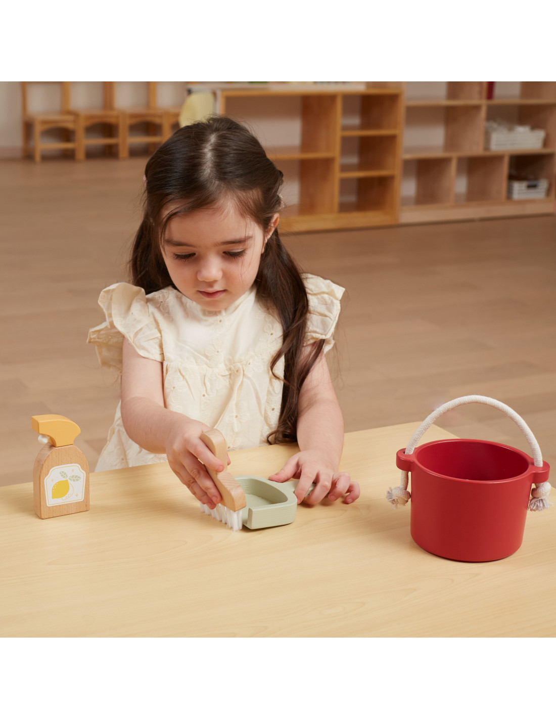 Drewniana butelka imitująca spray do czyszczenia: Twoje dziecko może wyobrazić sobie jak spryskuje meble i powierzchnie, aby nadać im świeży zapach cytryny. To świetny dodatek do zabawy!
