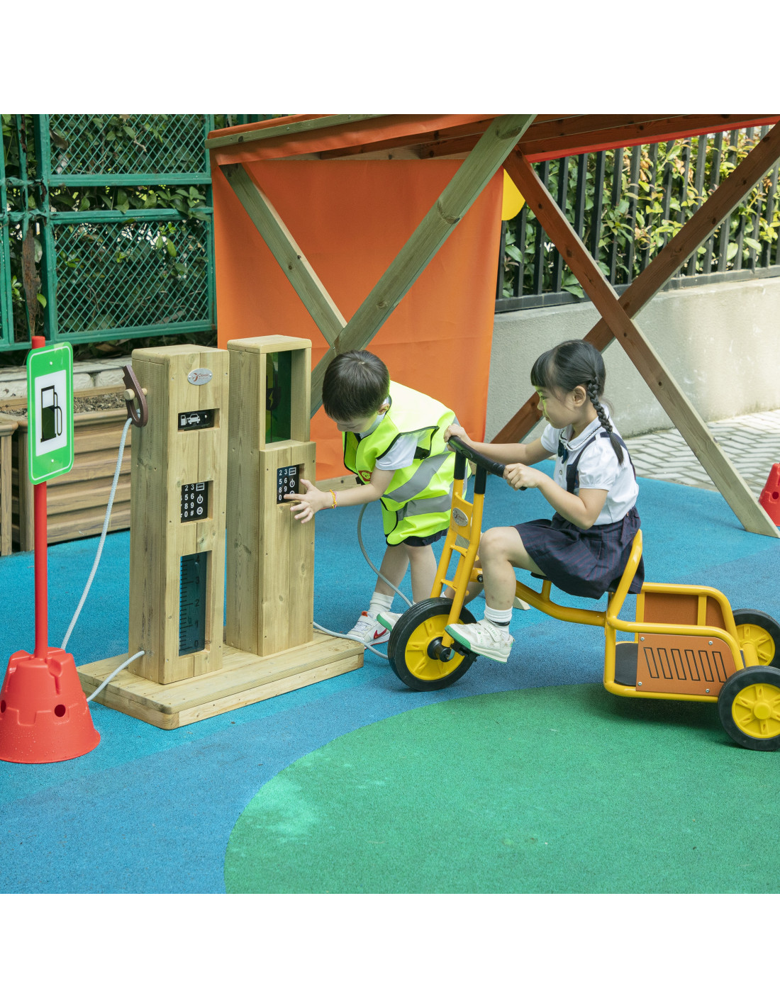 Stacja ładowania 2 w 1 marki CLASSIC WORLD jest wszechstronnym urządzeniem, które z jednej strony służy do ładowania paliwa, a z drugiej do ładowania pojazdów elektrycznych. Dzieci mogą brać przewód ładujący, podłączać go do wózków trójkołowych i ładować je przed wyruszeniem w podróż. Funkcje takie jak tankowanie, konserwacja i płatność można symulować, obracając przycisk funkcyjny.