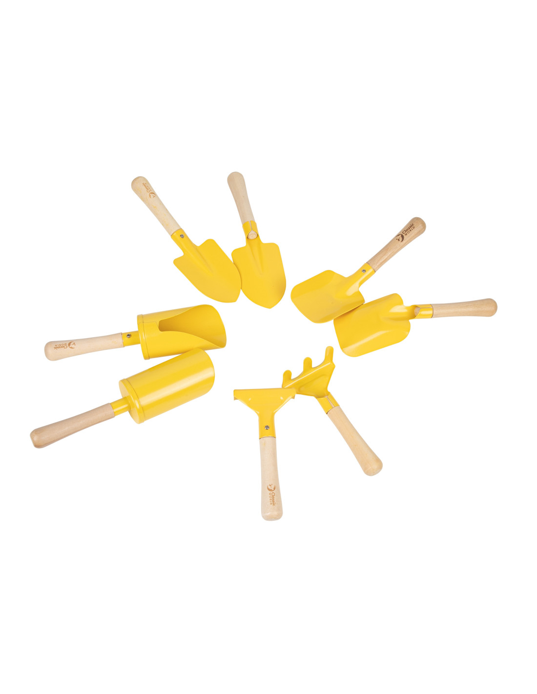 - - Narzędzia wykonane z wytrzymałego metalu w intensywnym żółtym kolorze oraz drewnianych uchwytów
