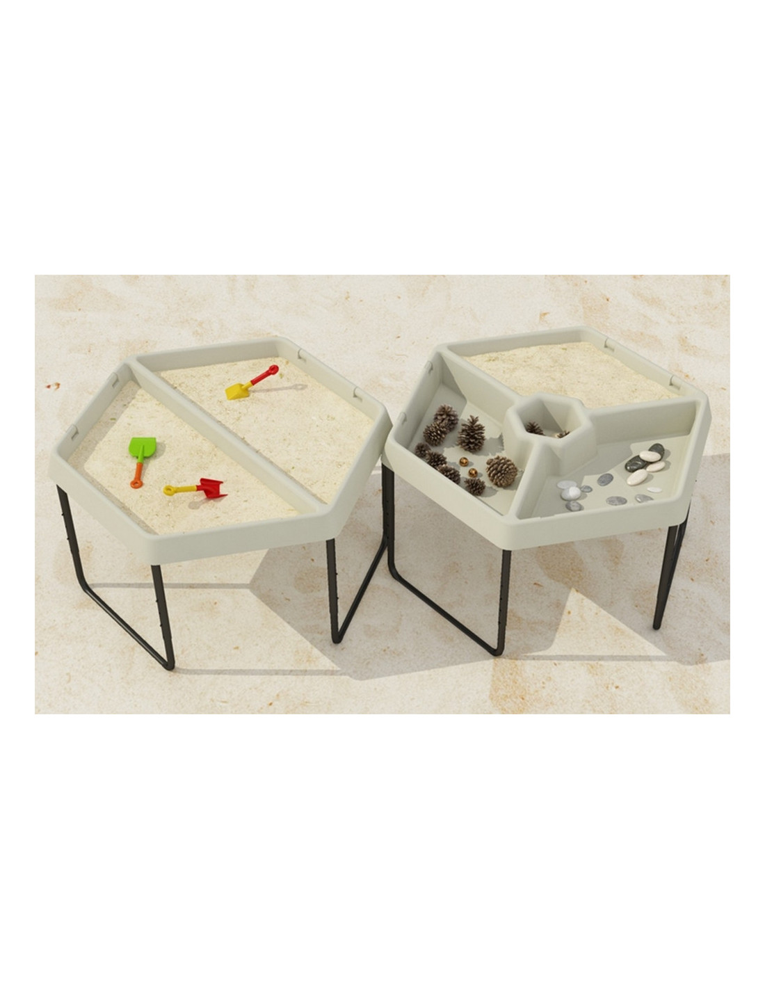 Sześciokątna taca do zabawy to doskonałe narzędzie do rozwijania wyobraźni i kreatywności u dzieci. Powierzchnia do zabawy z trzema przegrodami umożliwia jednoczesne wykonywanie trzech różnych aktywności, na przykład zabawy piaskiem po jednej stronie, wodą po drugiej, a porównywanie i odkrywanie różnych materiałów w trzeciej. Ta taca to doskonały wybór dla rodziców i opiekunów, którzy szukają wszechstronnej i praktycznej zabawki, która zapewni dzieciom godziny kreatywnej zabawy i edukacji. Taca może być używana na ziemi lub umieszczona na regulowanym stojaku, którego nogi mają regulowaną wysokość (45/55/65 cm), co pozwala dostosować się do wzrostu małych dzieci w miarę ich rozwoju. Zestaw nie zawiera stojaka na tacę.