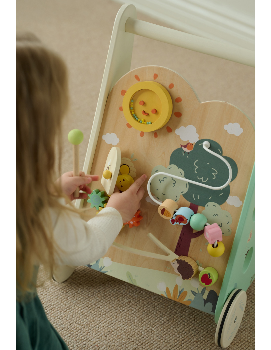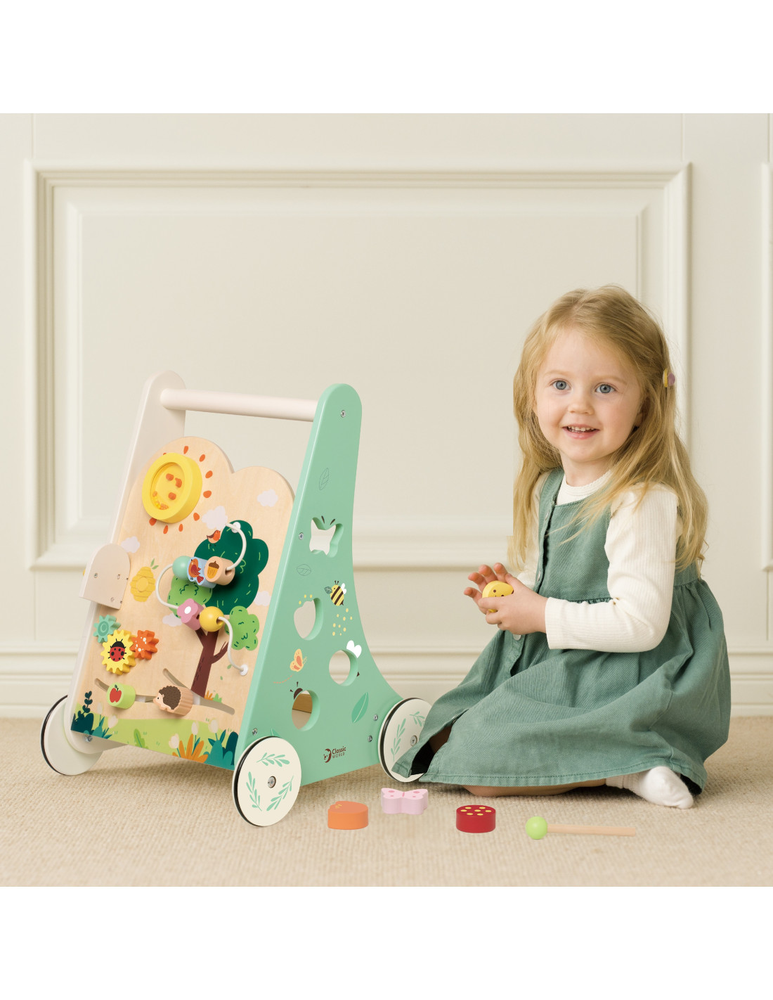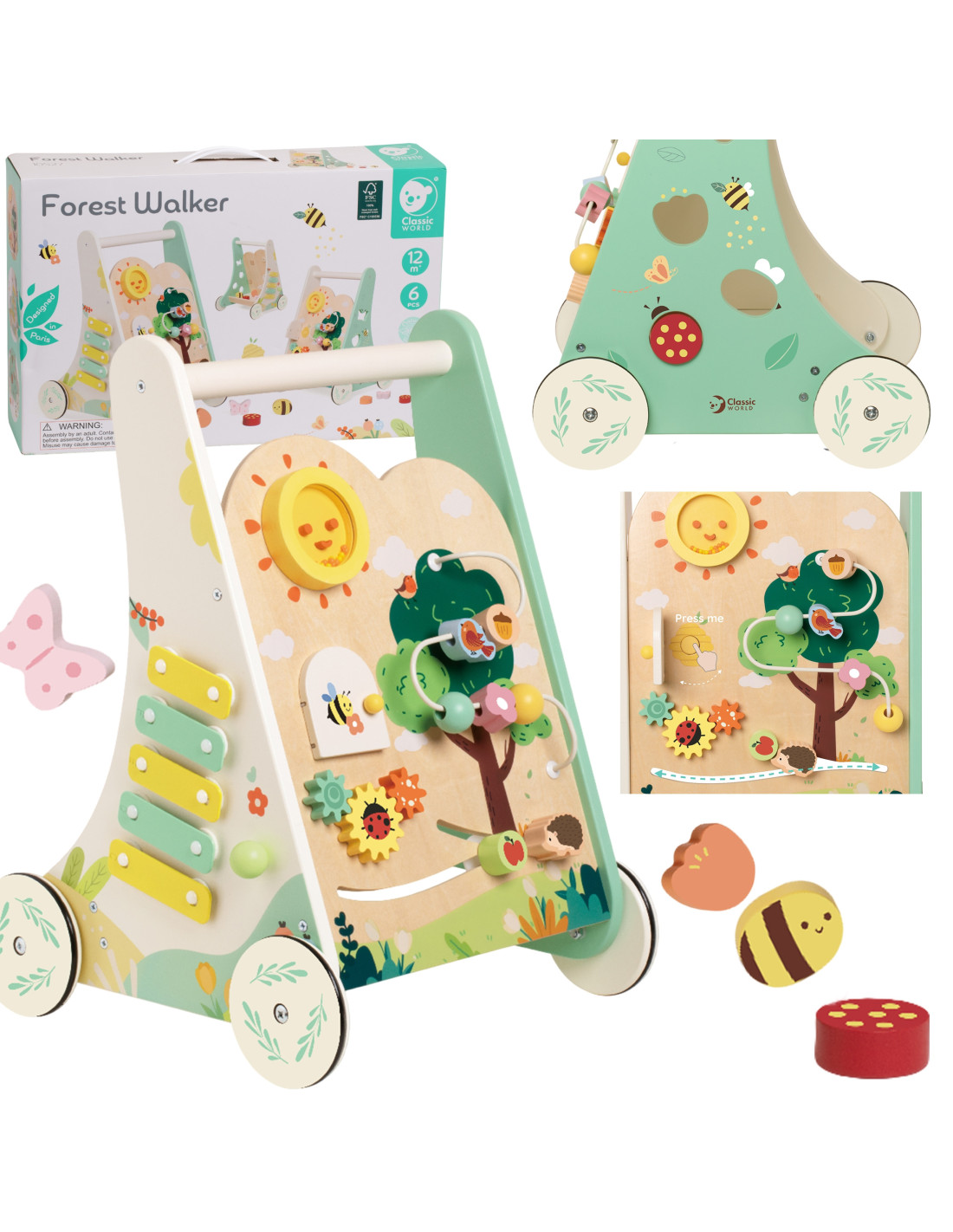 Pozwól odkrywać swojemu dziecku świat pełen magii i nauki, z "Leśnym Chodzikiem" od renomowanej marki Classic World. Drewniany pchacz zaprojektowano tak, aby wspierać pierwsze kroki dziecka, jednocześnie rozwijając jego zmysły i zdolności motoryczne. Z każdym przesunięciem koralika, obrotem zębatki czy uderzeniem w cymbałki - maluch poznaje, jak działa otaczający go świat, a jednocześnie wzmacnia swoje rączki i koordynację. Chodzik będzie towarzyszył Twojemu dziecku w stawianiu pierwszych kroków. Dzięki temu, że zabawka została wykonana z drewna jest stabilna, co daje poczucie bezpieczeństwa. Pchacz posiada gumowe uszczelki na kółkach, które umożliwiają łatwe i ciche prowadzenie. Elementy zostały pomalowane bezpiecznymi dla dziecka farbami w piękne kolory, które zadowolą każdego użytkownika i dadzą mnóstwo radości z zabawy.