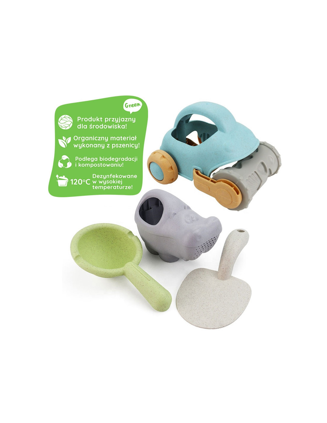 Zestaw do Piasku od marki WOOPIE to świetny dodatek do piaskownicy, a nawet ogrodu. Zestaw zawiera 10 elementów: konewkę, 6 foremek, 2 łopatki i samochód. Konewka ma wygodny uchwyt do przenoszenia. Zestaw ma najmodniejszy pastelowy design oraz został wykonany z organicznego i biodegradowalnego (podlegającemu samoistnemu rozkładowi) materiału. Dodatkowo podlega kompostowaniu. Produkt bezpieczny dla dzieci - dezynfekowany w 120 stopniach. Gwarancja super zabawy w piaskownicy, na plaży, a nawet w ogrodzie! Produkt przyjazny środowisku!