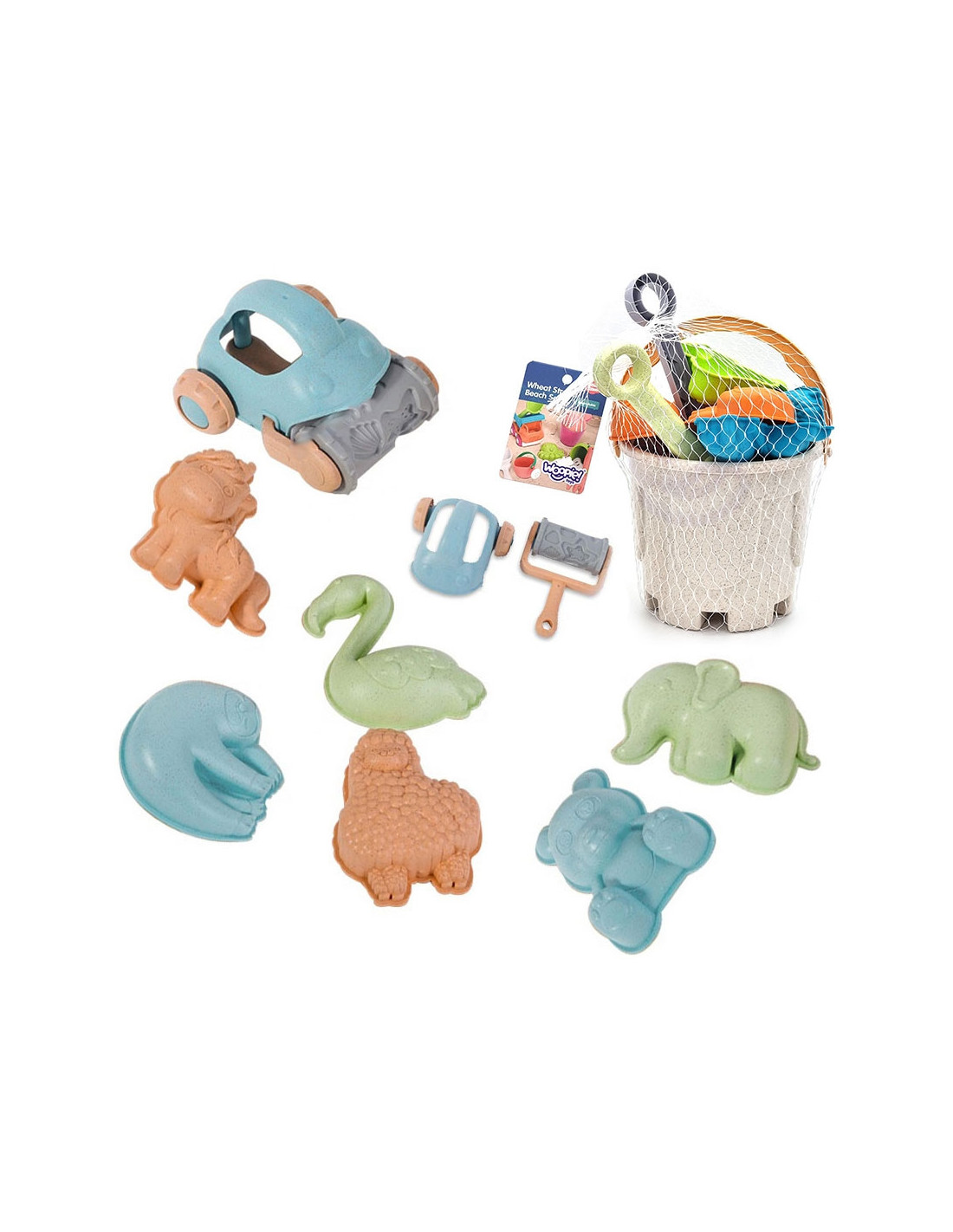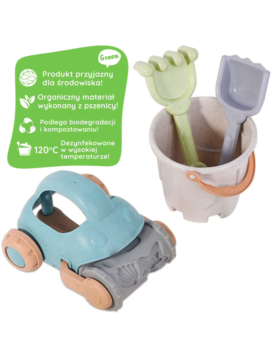 Zestaw do Piasku w Wiaderku od marki WOOPIE z serii GREEN to świetny dodatek do piaskownicy, a nawet ogrodu. Zestaw zawiera 10 elementów: wiaderko, 6 foremek, łopatkę i grabki oraz samochodzik. Wiaderko ma wygodny uchwyt do przenoszenia. Zestaw ma najmodniejszy pastelowy design oraz został wykonany z organicznego i biodegradowalnego (podlegającemu samoistnemu rozkładowi) materiału. Dodatkowo podlega kompostowaniu. Produkt bezpieczny dla dzieci - dezynfekowany w 120 stopniach. Gwarancja super zabawy w piaskownicy, na plaży, a nawet w ogrodzie! Produkt przyjazny środowisku!