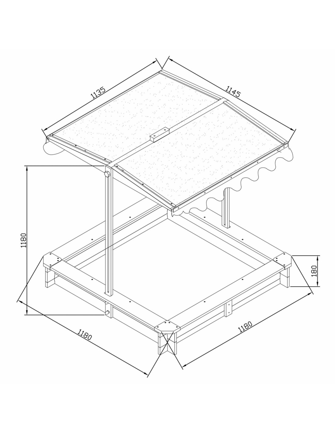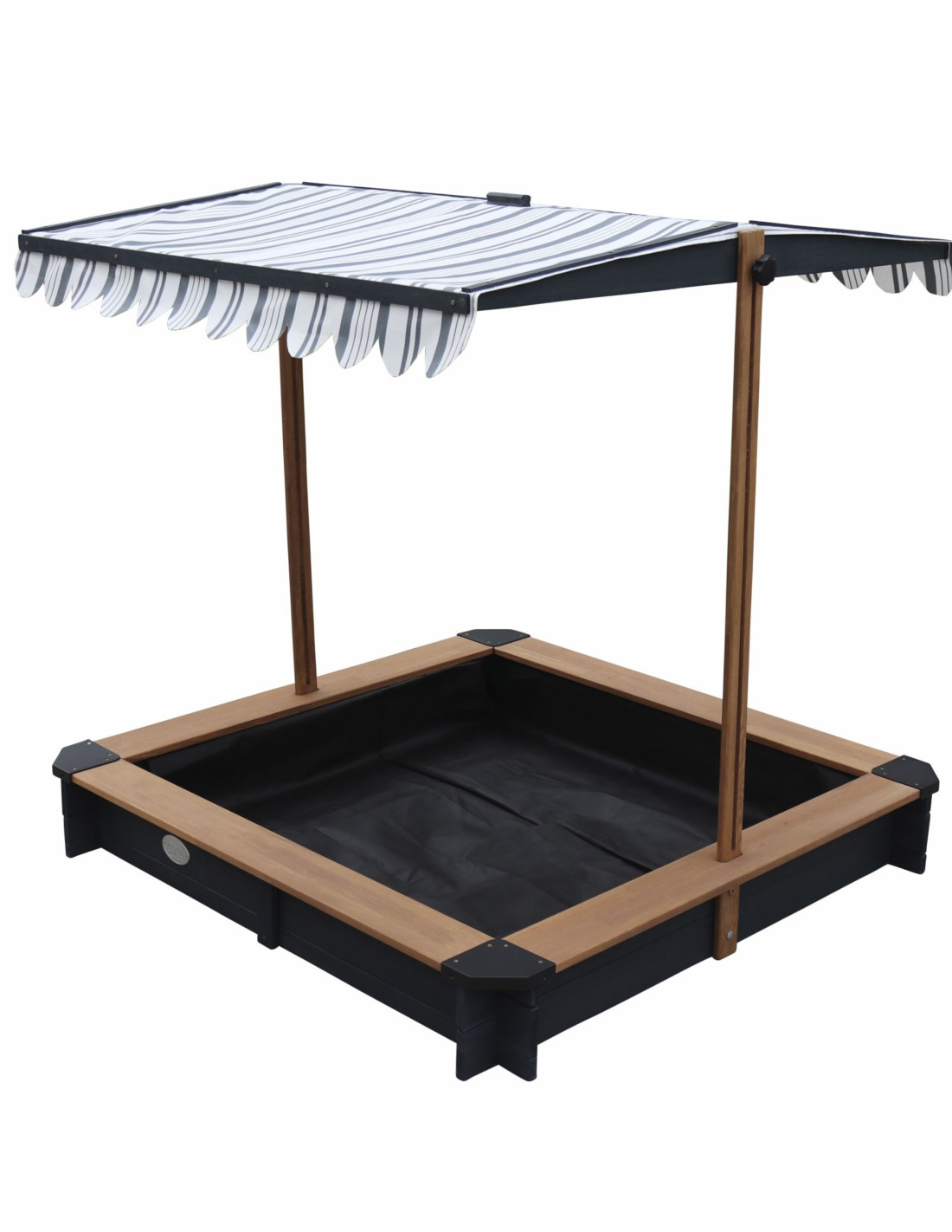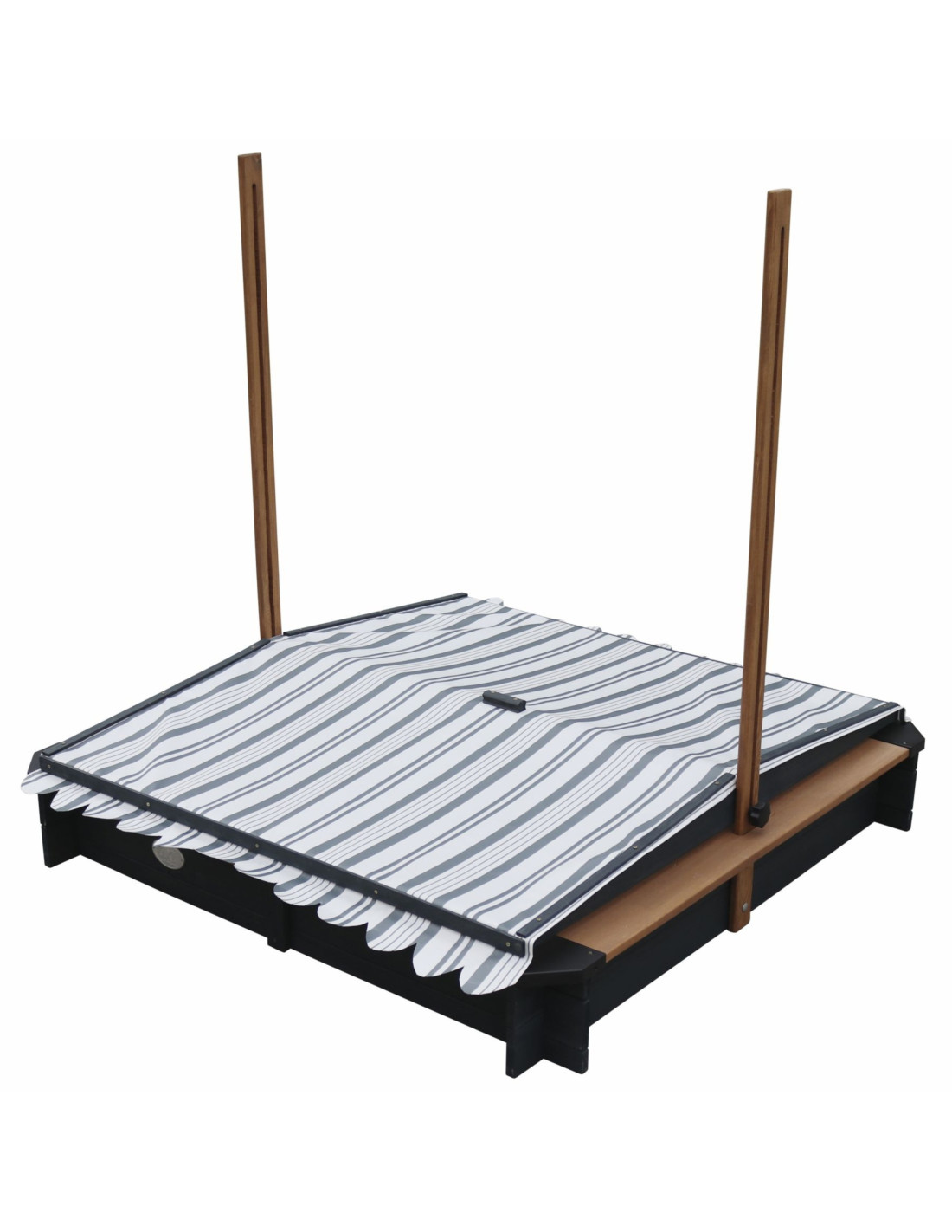 - Regulowany daszek 2w1 – wykonany z wodoodpornego poliestru (280 g/m²) z ochroną UV50, który chroni dzieci przed słońcem i deszczem. Można go łatwo regulować, dostosowując kąt nachylenia, a po zakończeniu zabawy – opuścić, zamieniając go w ochronną pokrywę piaskownicy.