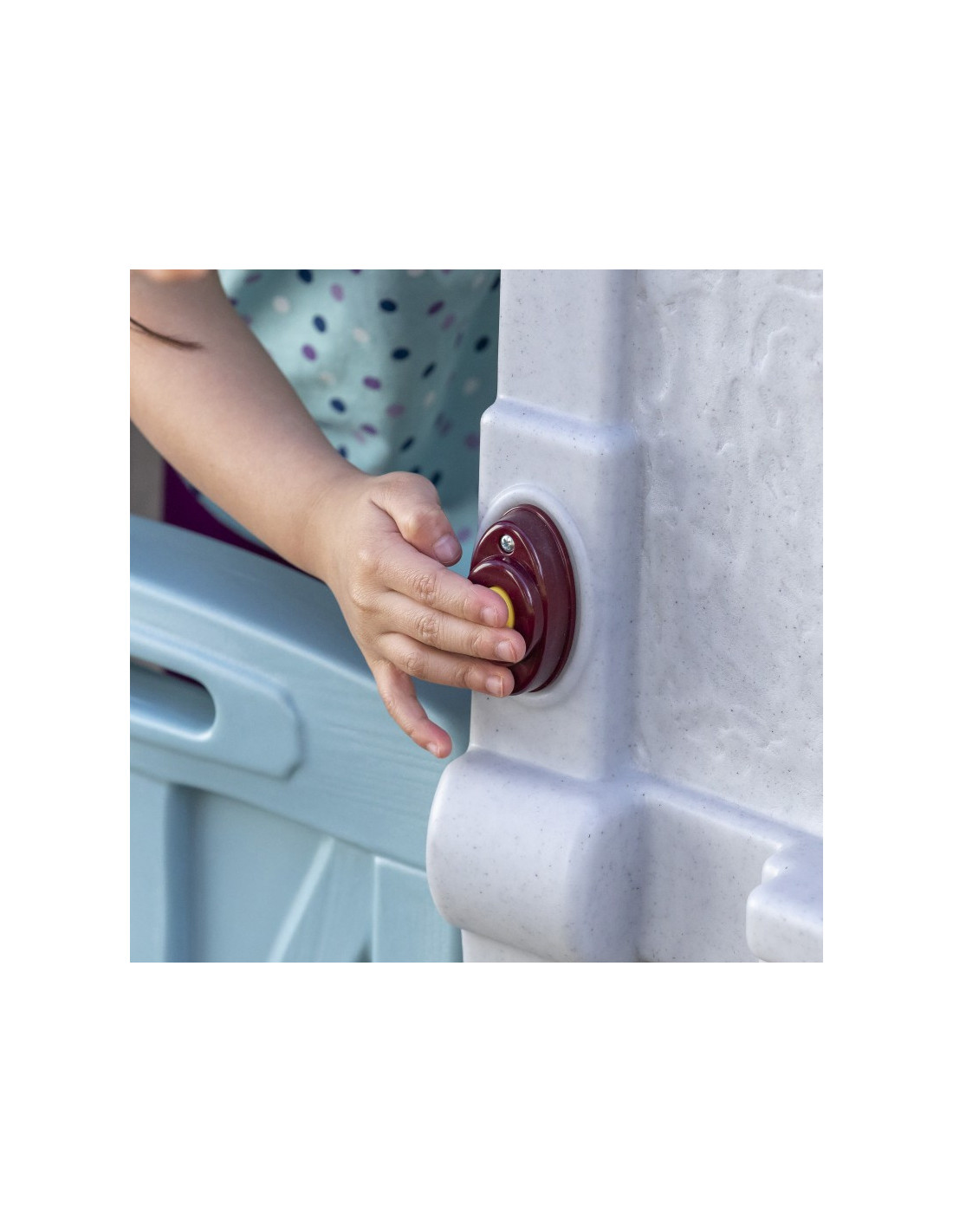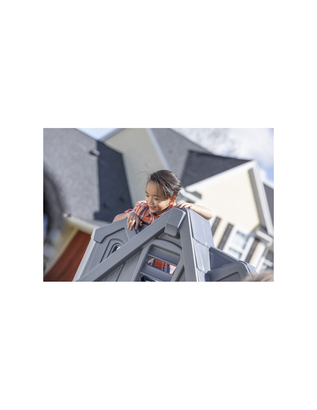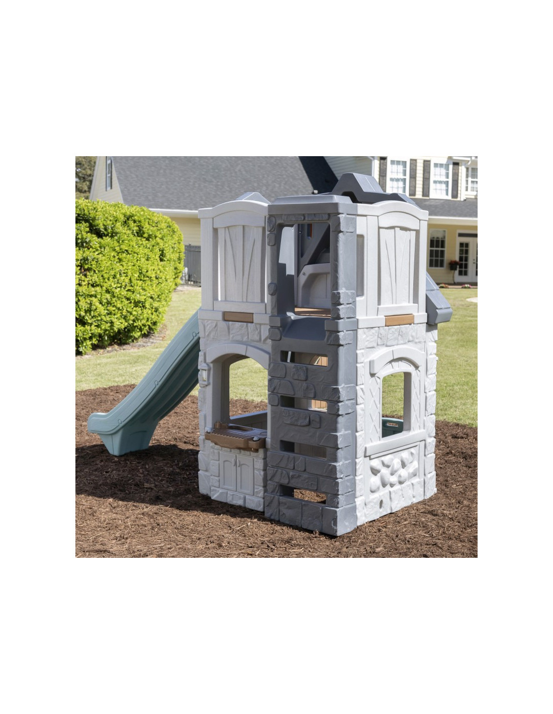 Ten uroczy domek do zabawy i zjeżdżalnia zapewnia nieograniczone możliwości! Może to być zamek lub cokolwiek, co chcą sobie wyobrazić! Ten stylowy zestaw do zabawy na podwórku wykorzystuje mieszane materiały, aby uzyskać niepowtarzalny wygląd. Całość tworzy stonowany klasyczny wygląd. Kolorowe plastikowe elementy są przyjazne dla dzieci i wytrzymają wiele godzin zabawy! Ten plac zabaw pozwoli maluchom bawić się cały dzień!