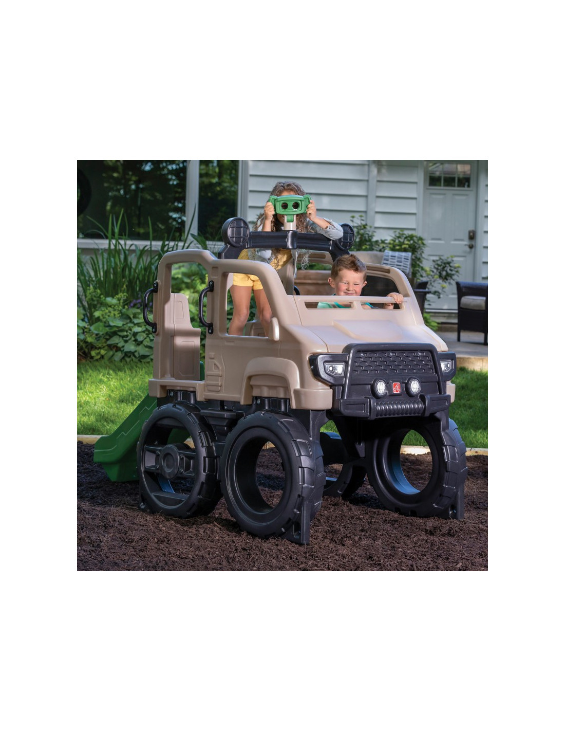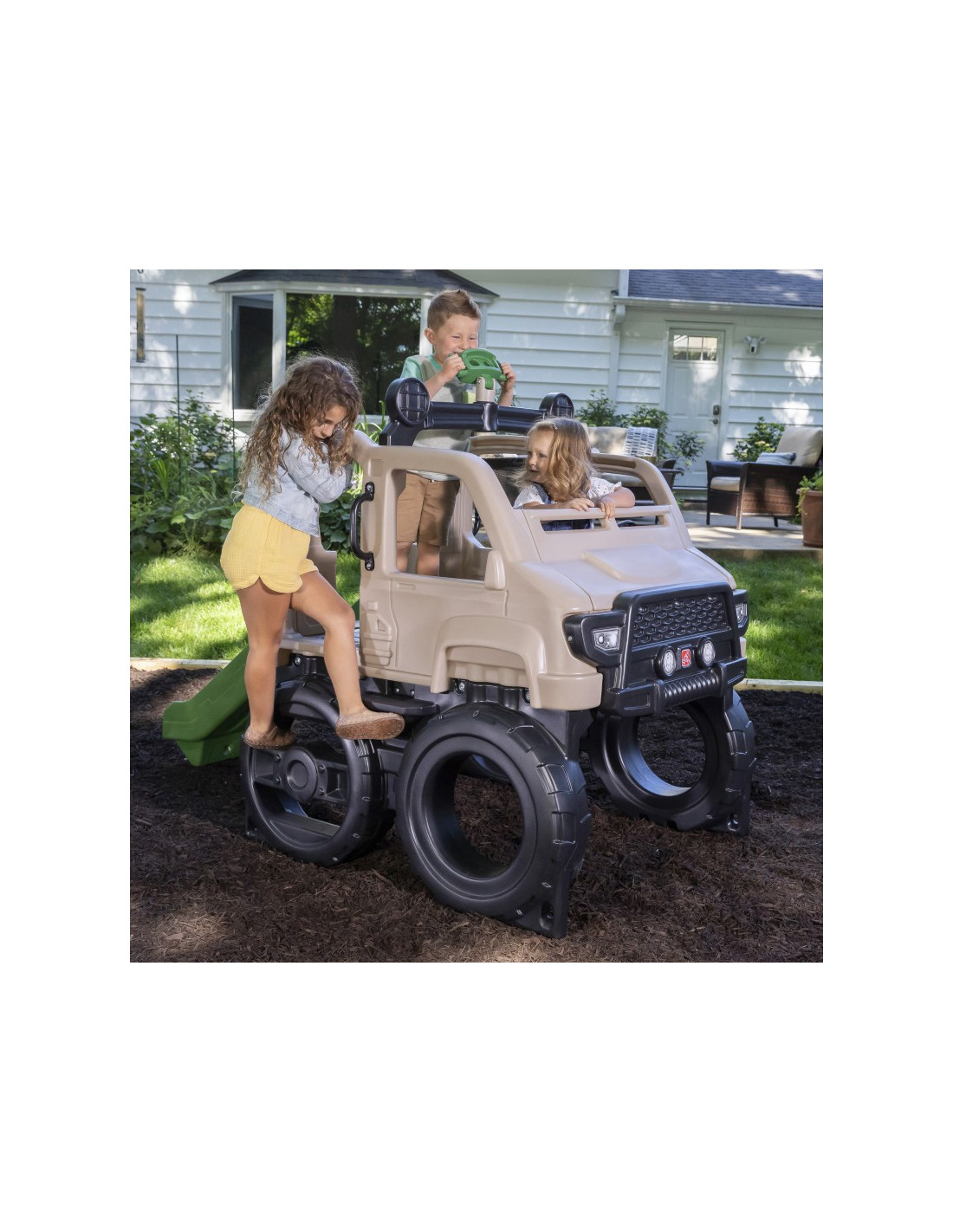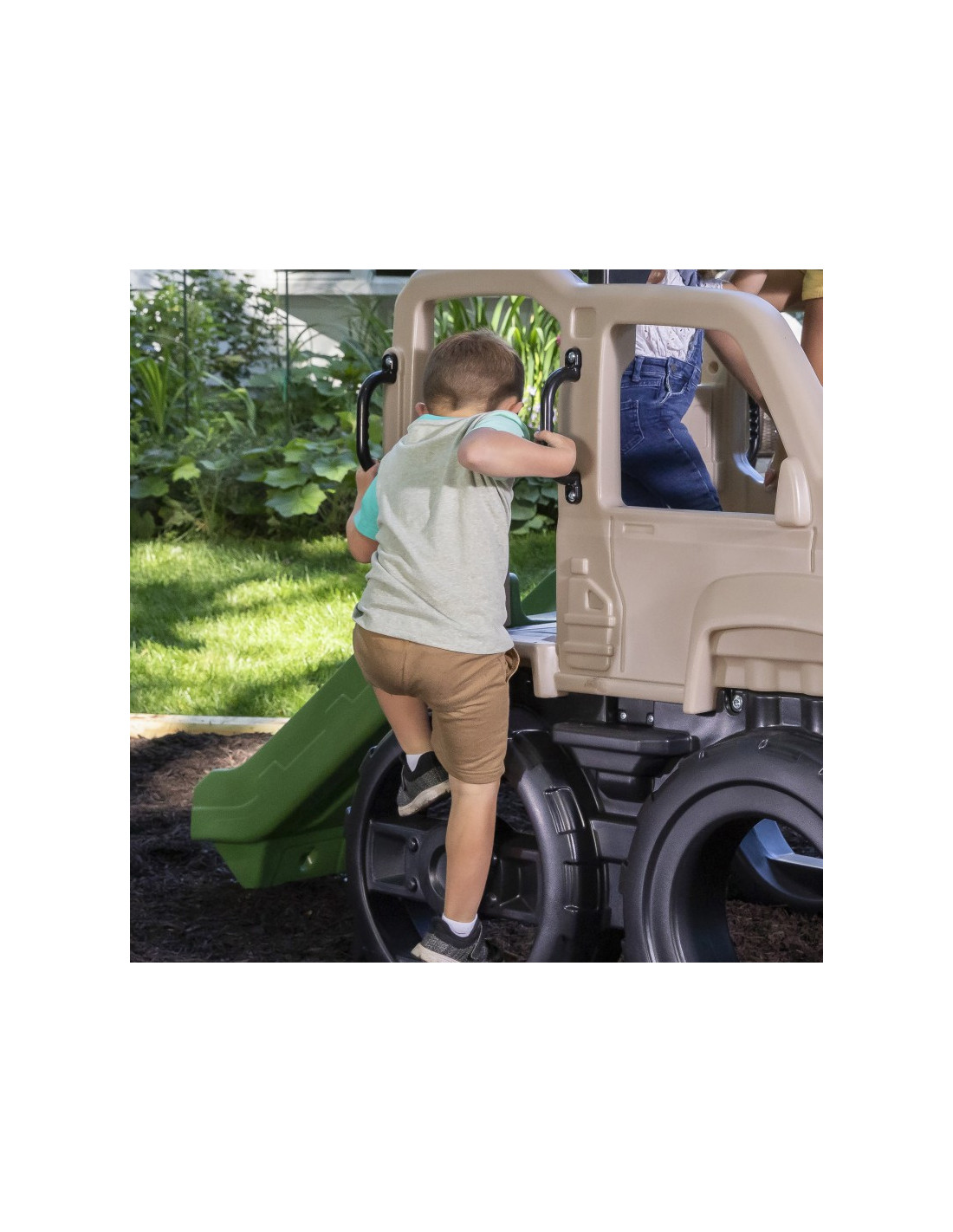 Safari Truck od marki Step2 to solidna platforma wspinaczkowa ze zjeżdżalnią w kształcie samochodu terenowego. Realistyczny wygląd pojazdu, duże koła oraz otwarty dach zachęca dziecko do zabawy w ogrodzie. Mali poszukiwacze przygód mogą wspiąć się na ogromne koła, jak po schodach, na najwyższą platformę, gdzie znajduje się lornetka przez którą mogą dostrzec dziką przyrodę. Plac zabaw wykonany jest z wysokiej jakości bezpiecznego tworzywa sztucznego, wytrzymałe i trwałe.