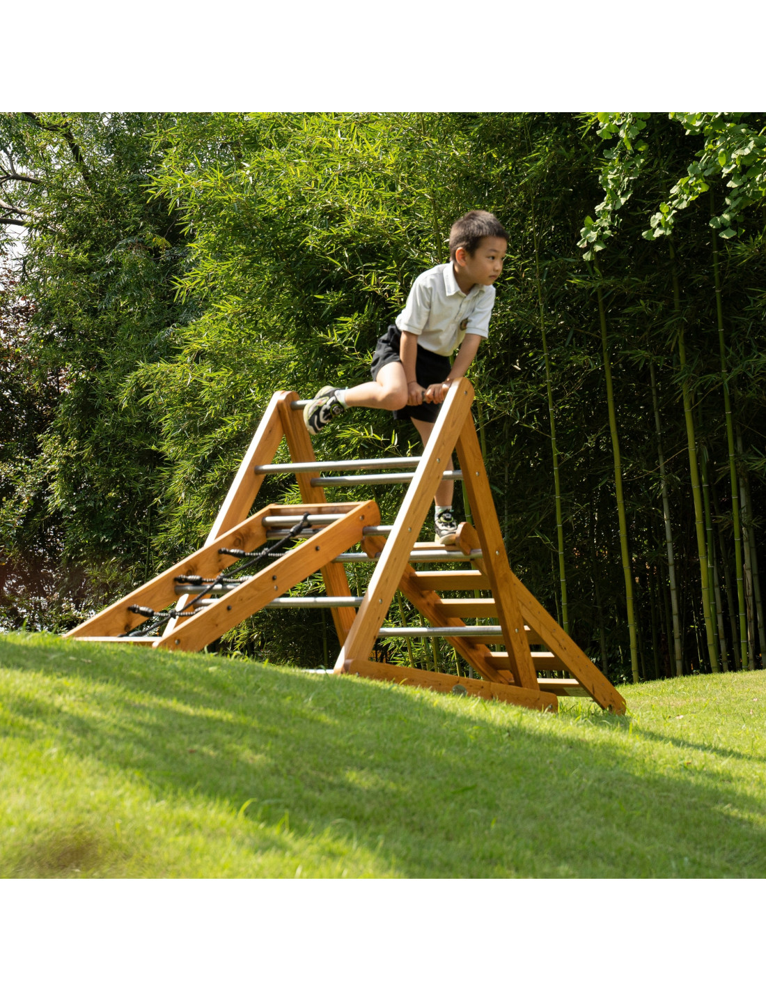 - - Pełna swoboda konfiguracji: Dzięki regulowanej wysokości i możliwości dowolnego ułożenia dwóch bocznych drabinek, możesz dostosować zestaw do wieku i umiejętności dziecka, zaczepiając je na różnych poziomach.
