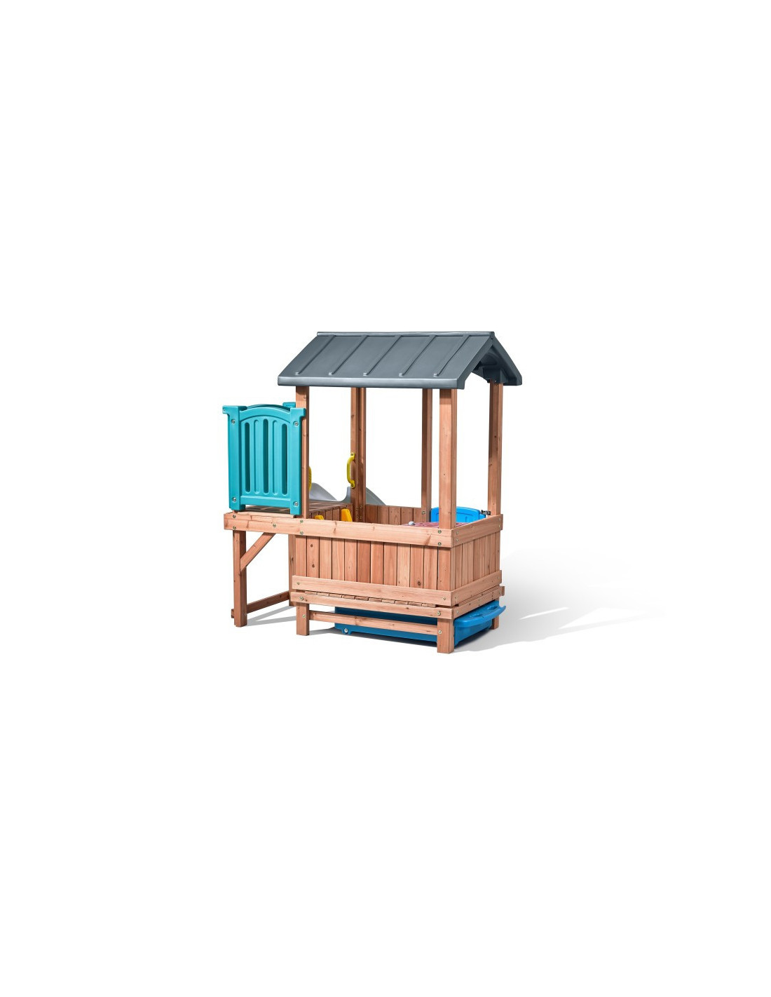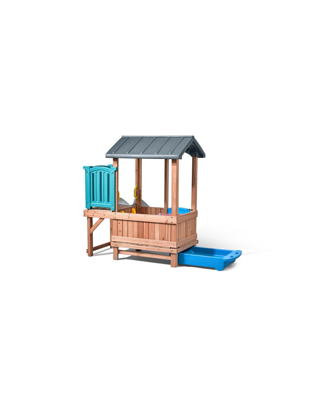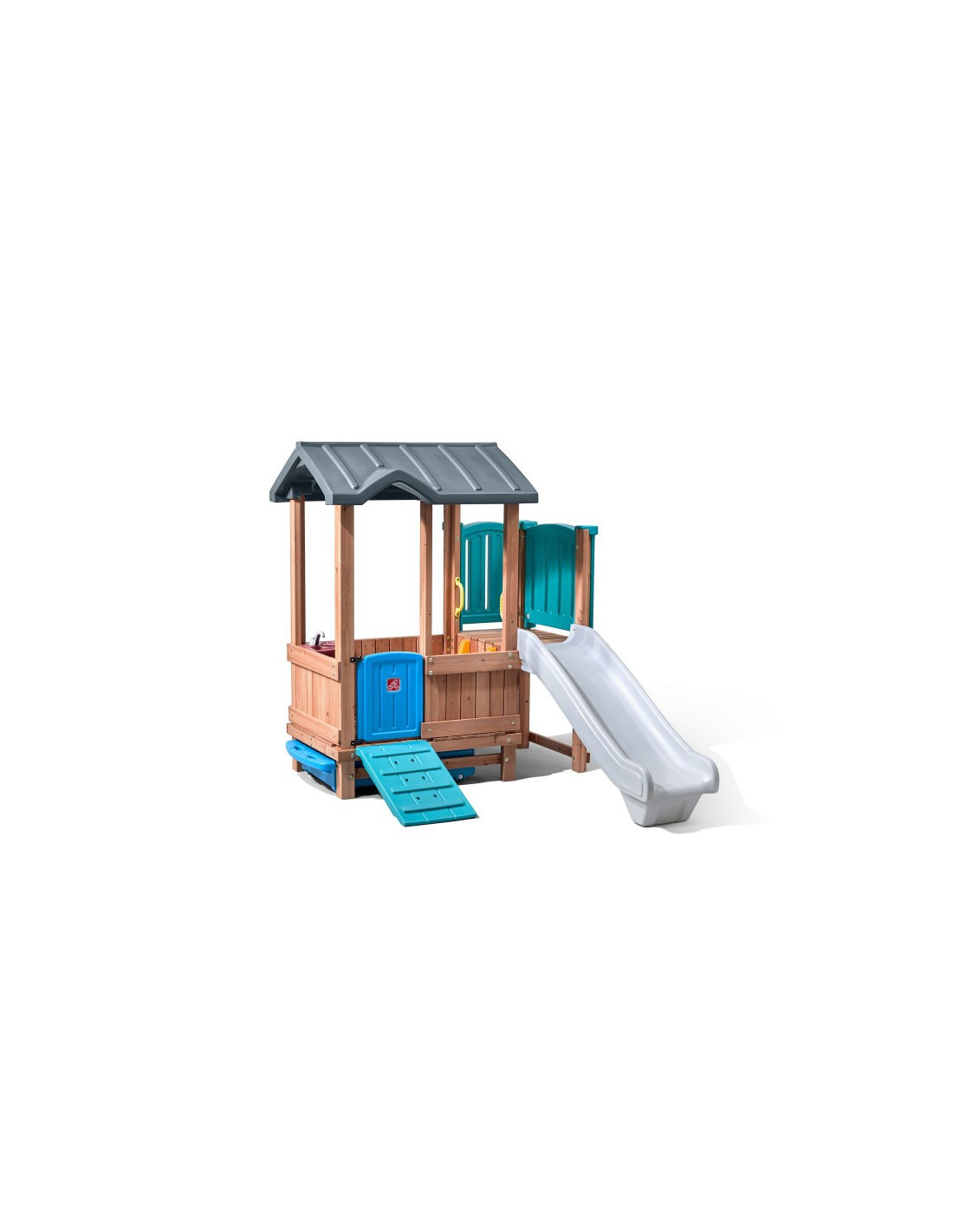 Ten uroczy domek do zabawy i zjeżdżalnia zapewnia nieograniczone możliwości! Może to być zamek, chata, statek piracki lub cokolwiek, co chcą sobie wyobrazić! Ten stylowy zestaw do zabawy na podwórku wykorzystuje mieszane materiały, aby uzyskać niepowtarzalny wygląd. Konstrukcja wykonana głównie z drewna tworzy klasyczny wygląd. Kolorowe plastikowe elementy są przyjazne dla dzieci i wytrzymają wiele godzin zabawy! Ten drewniany i plastikowy domek do zabawy pozwoli maluchom bawić się cały dzień!