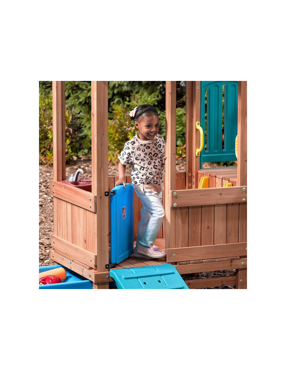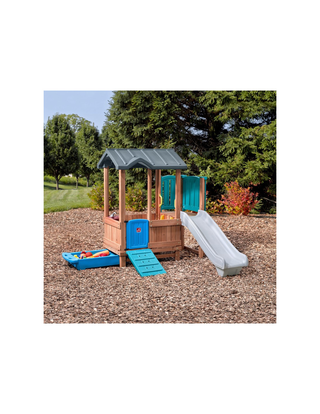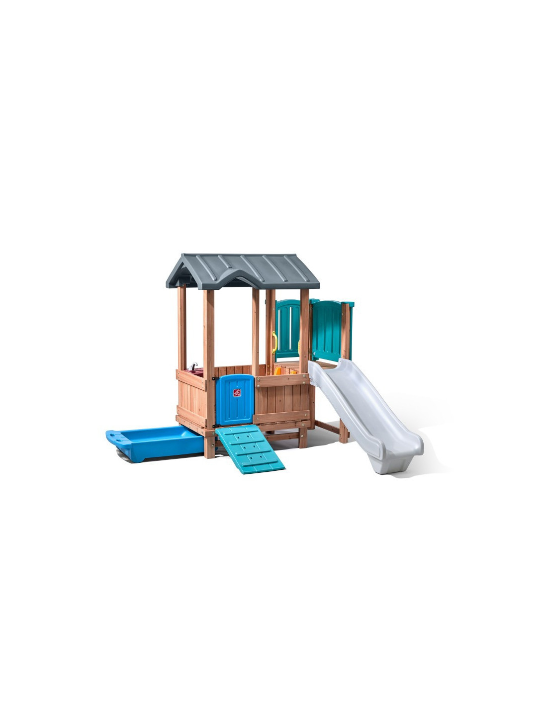 Ten uroczy domek do zabawy i zjeżdżalnia zapewnia nieograniczone możliwości! Może to być zamek, chata, statek piracki lub cokolwiek, co chcą sobie wyobrazić! Ten stylowy zestaw do zabawy na podwórku wykorzystuje mieszane materiały, aby uzyskać niepowtarzalny wygląd. Konstrukcja wykonana głównie z drewna tworzy klasyczny wygląd. Kolorowe plastikowe elementy są przyjazne dla dzieci i wytrzymają wiele godzin zabawy! Ten drewniany i plastikowy domek do zabawy pozwoli maluchom bawić się cały dzień!