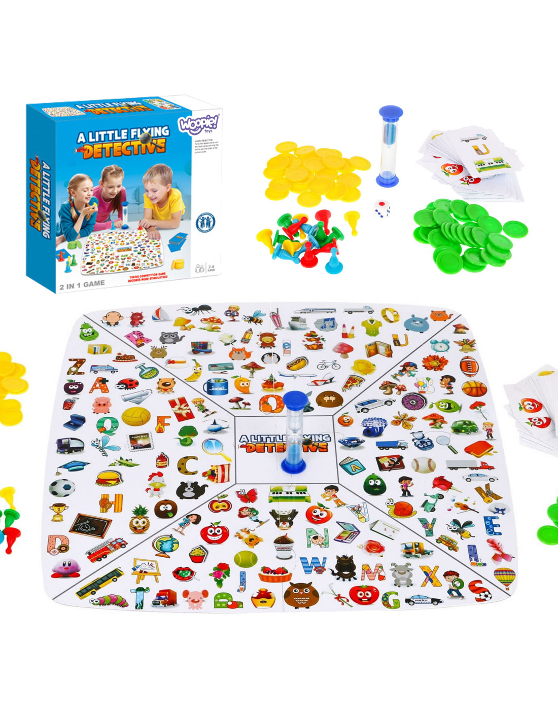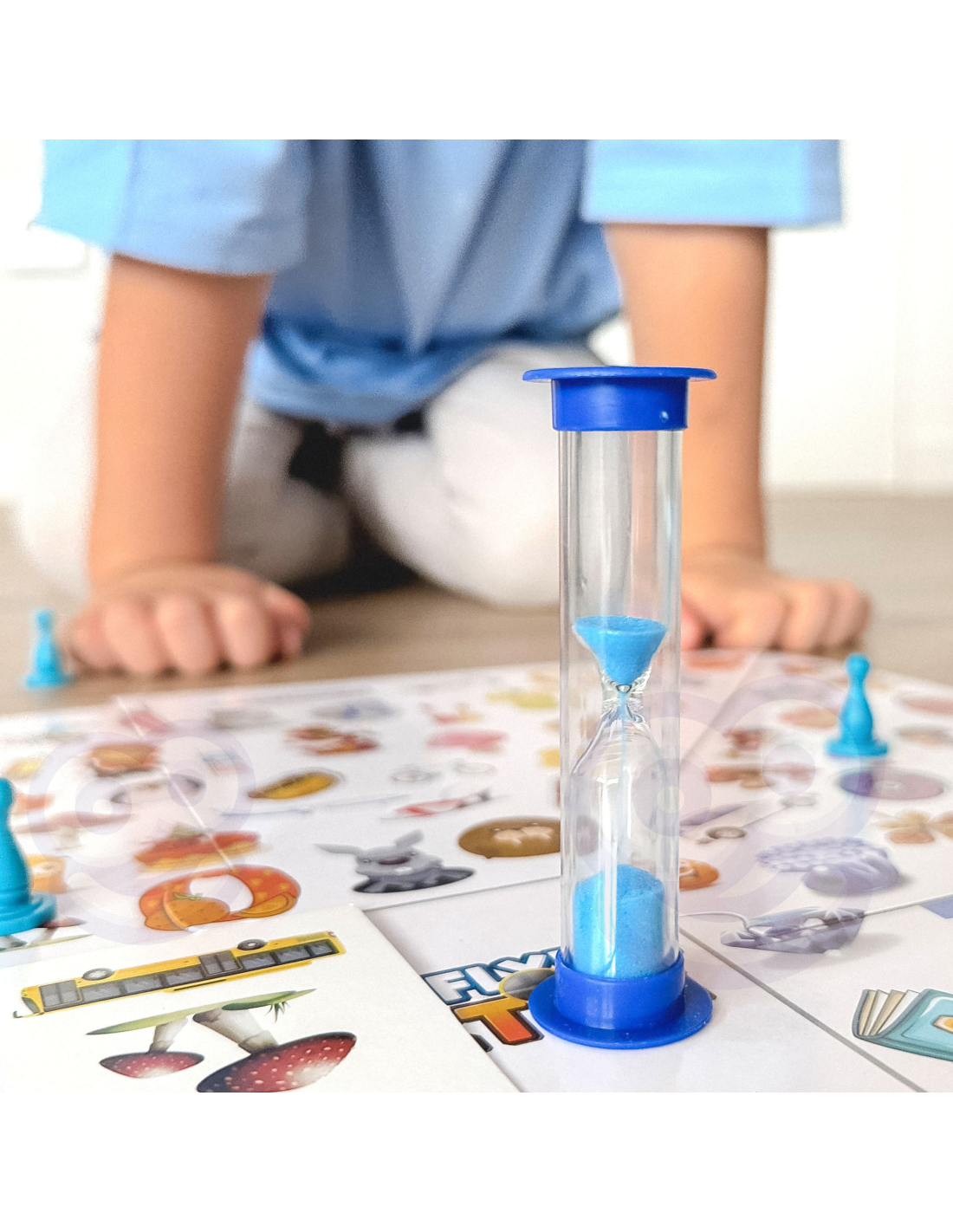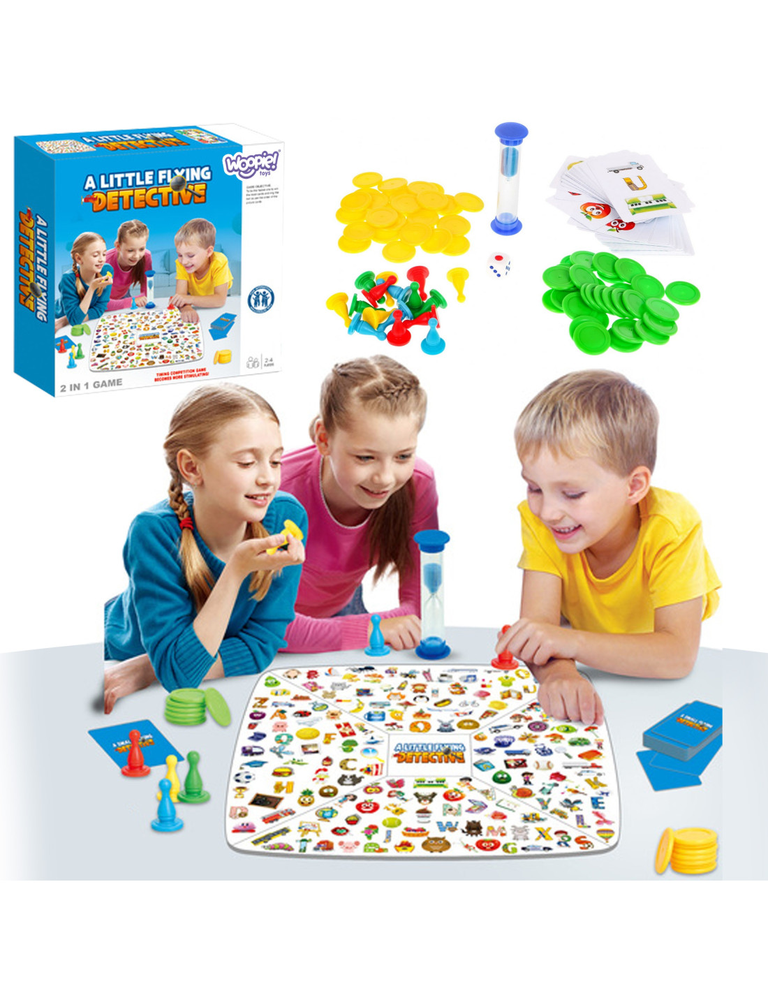 - Mały Detektyw: Przygotuj planszę, karty (wskazówki) i monety. Podziel karty w następujący sposób: dwóch graczy po 8 kart, trzech graczy po 6 kart i czterech graczy po 5 kart. Nie można podglądać kart. Każdy gracz wybiera jedną kartę. Zaczynamy od najmłodszego gracza. Odwróć swoją kartę (wskazówki) i połóż ją na środku planszy. Na karcie wskazówki pojawią się trzy wzory. Gracz powinien odnaleźć wzór jak najszybciej i zakryć go. Jeśli zostaną znalezione 3 wzory runda się kończy. Za każde dobre wskazanie wzoru gracz dostanie monetę detektywa. Jeśli zaś zaznaczy źle wzór musi oddać monetę. Klepsydra służy do pomiaru czasu, jak czas upłynie runda kończy się.