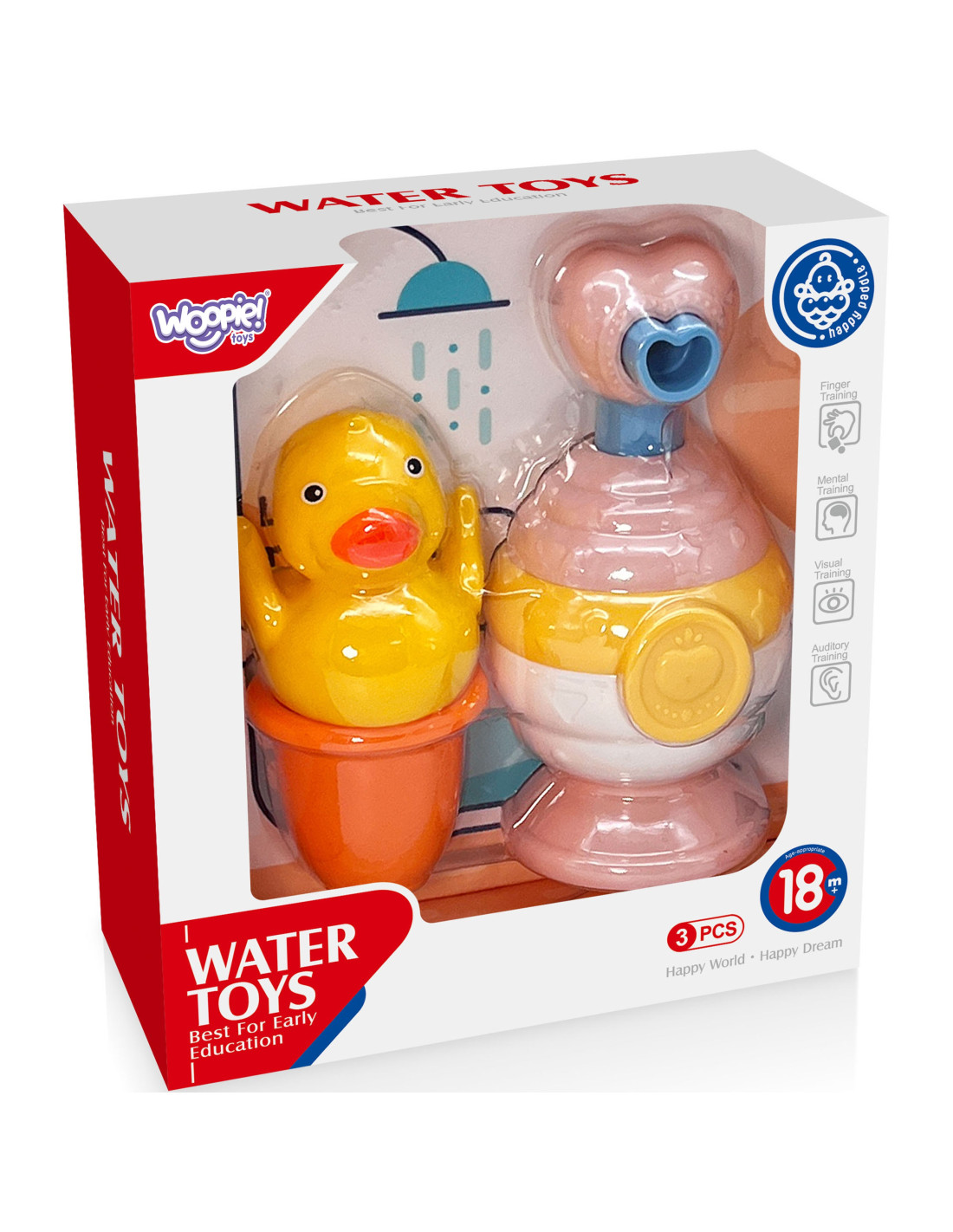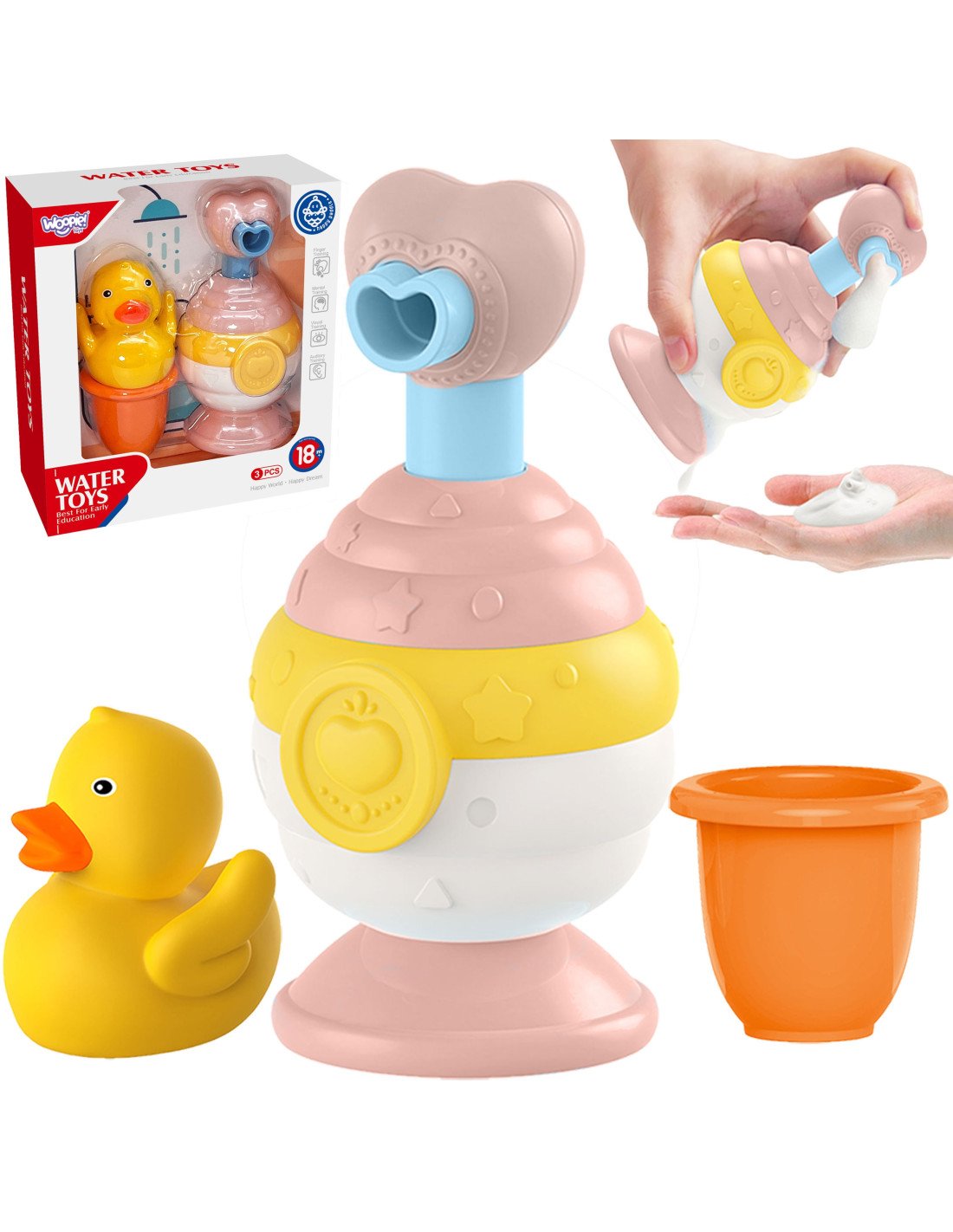 Zestaw Zabawek do Kąpieli od marki WOOPIE to nie tylko zabawka, ale i sposób na zamienienie codziennej kąpieli w prawdziwą przygodę! Zestaw składa się z: uroczej kaczuszce, ślicznemu dozownikowi mydła i kolorowemu kubeczkowi.Ta innowacyjna mydelniczka to coś więcej niż zwykły dozownik mydła! Wyposażona w funkcję spieniania, zamienia zwykłe mydło w delikatną, puszystą pianę, która nie tylko świetnie myje, ale też tworzy mnóstwo zabawy dla malucha. Kaczuszka beztrosko unosząca się na wodzie zachęci każde dziecko do kreatywnej zabawy, a kubeczek przelewowy to kolejny magiczny element zestawu, który pozwala dzieciom na niekończącą się zabawę z wodą – maluch może przelewać wodę z jednego miejsca do drugiego, obserwując, jak zmienia się jej przepływ.