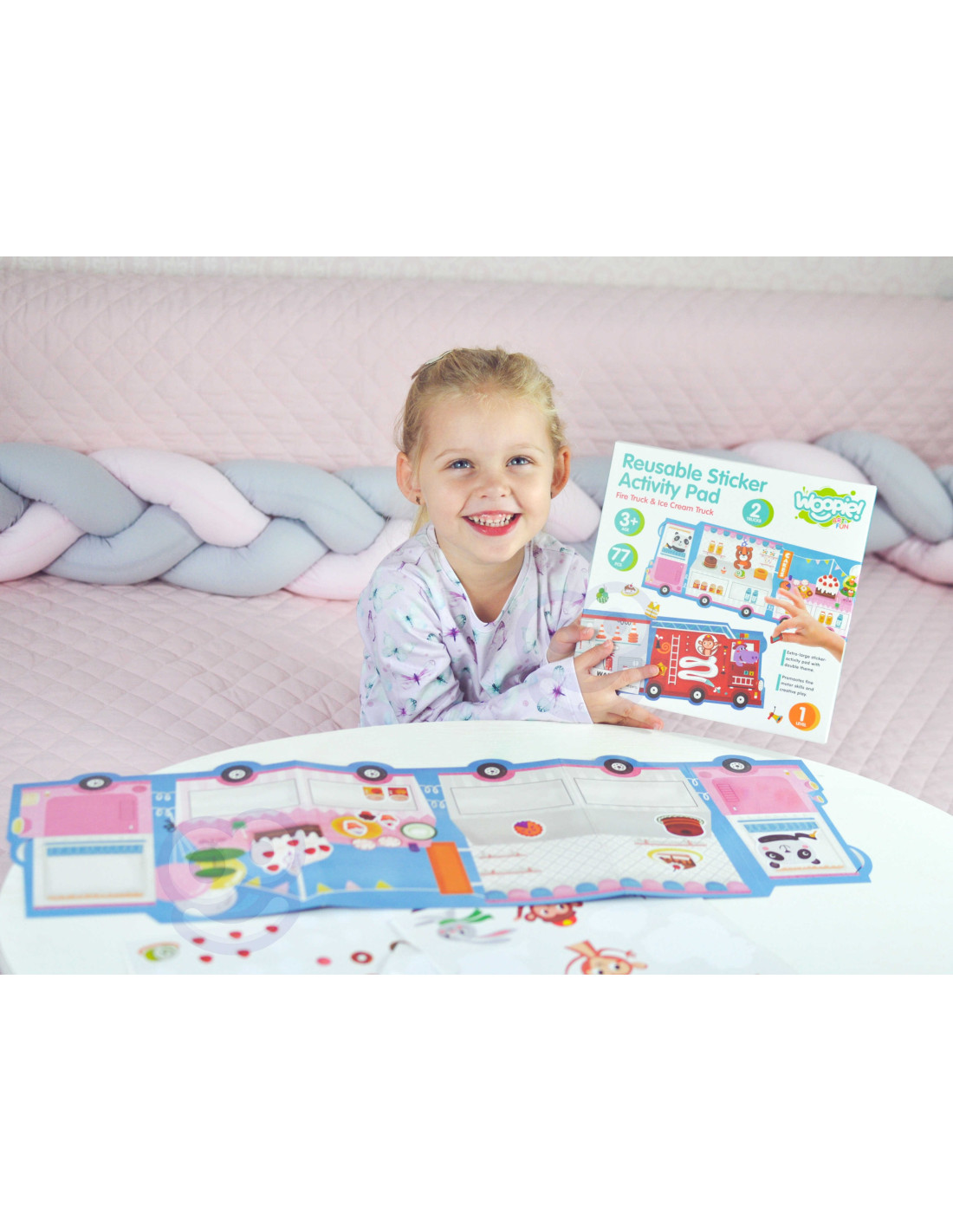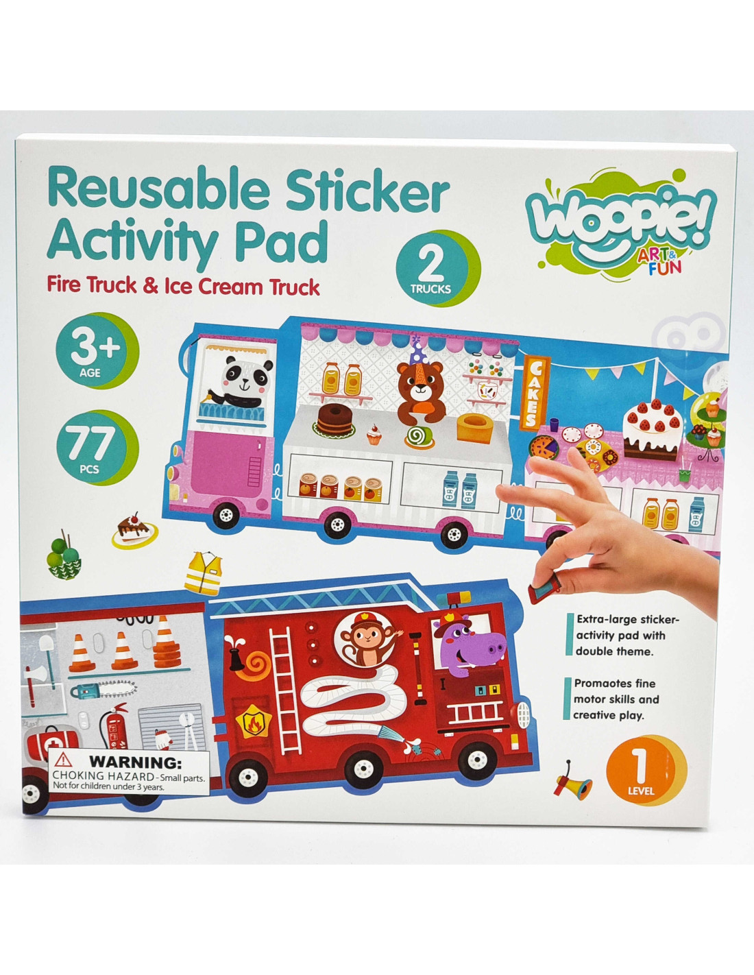Zestaw Kreatywny Wyklejanka od marki WOOPIE z serii ART&FUN pobudzi kreatywność do granic możliwości! Stwórz swoje własne obrazy! Zestaw zawiera dwustronną plansze do oklejenia oraz 76 naklejek. Jedna strona planszy to wóz strażacki, a druga to lodziarnia. Do wozu można dokleić takie elementy jak wyposażenie wozu np. gaśnica, apteczka czy małpka strażak, a na lodziarnie różnego rodzaju desery i nie tylko. Dziecko samo decyduję, gdzie umieścić dany element - wyobraźnia jest jedynym ograniczeniem! Naklejki są do wielokrotnego użytku, łatwo umieścić i zdjąć naklejkę z planszy - bez kleju i nożyczek. Zabawka w tworzenie własnego obrazu rozwinie zdolności motoryczne oraz pobudzi kreatywność i wyobraźnie!