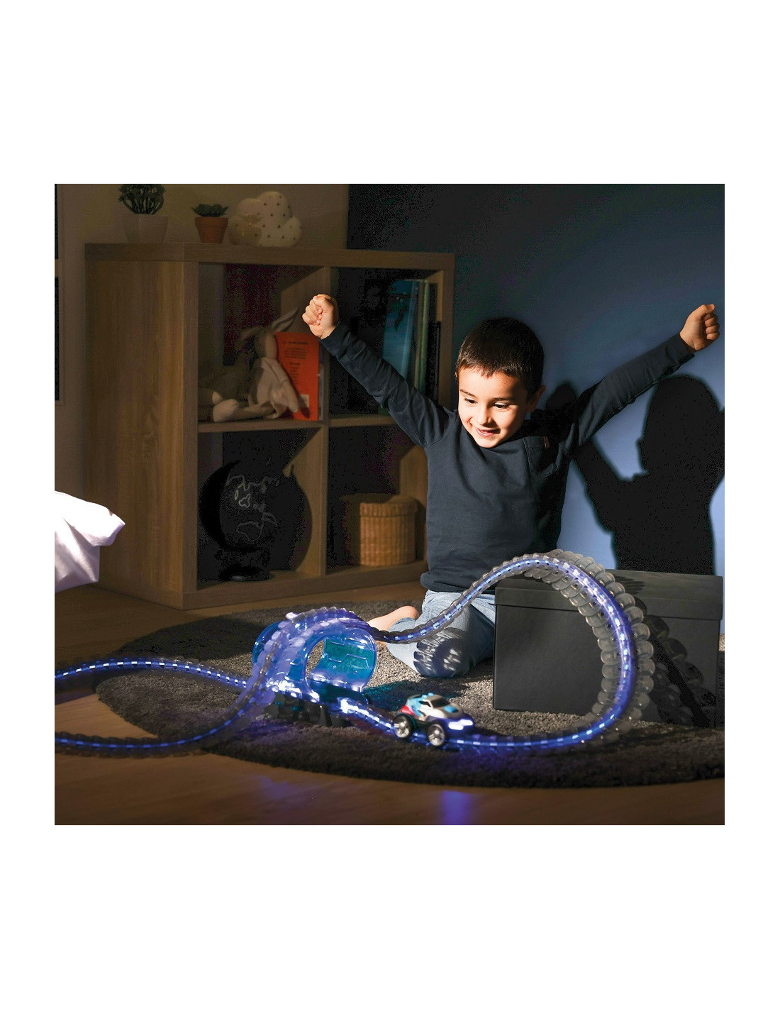 - - Dołączona jest lista LED, na której buduje się tor, dzięki czemu świeci po całej długości utworzonej trasy i tunel z modułem elektrycznym.