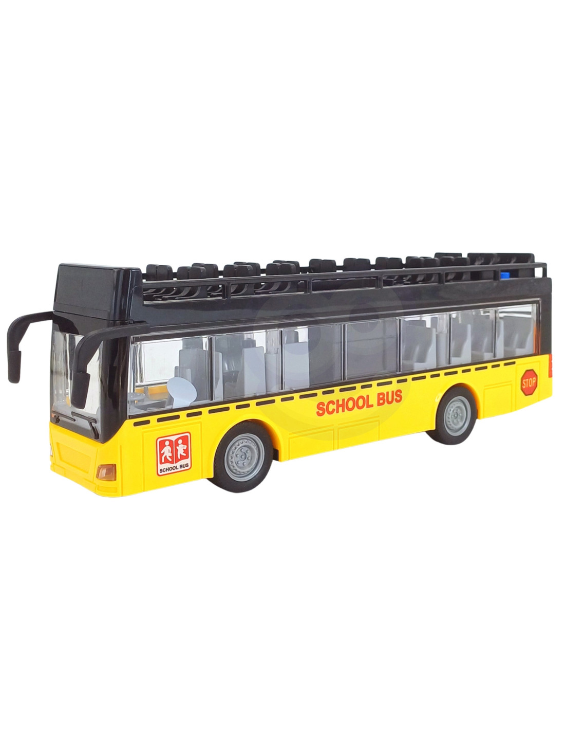 Autobus ze Światłami i Otwieranymi Drzwiami od marki WOOPIE z jednej strony posiada dwie pary otwieranych drzwi, dodatkowo pojazd wyposażony jest w napęd friction, wystarczy pchnąć je do przodu, aby samo pojechało. Zabawka wydaje dźwięki oraz zapala się niebieskie światło w środku pojazdu. Jest idealna dla dziecka, które lubi bawić się przeróżnymi pojazdami.