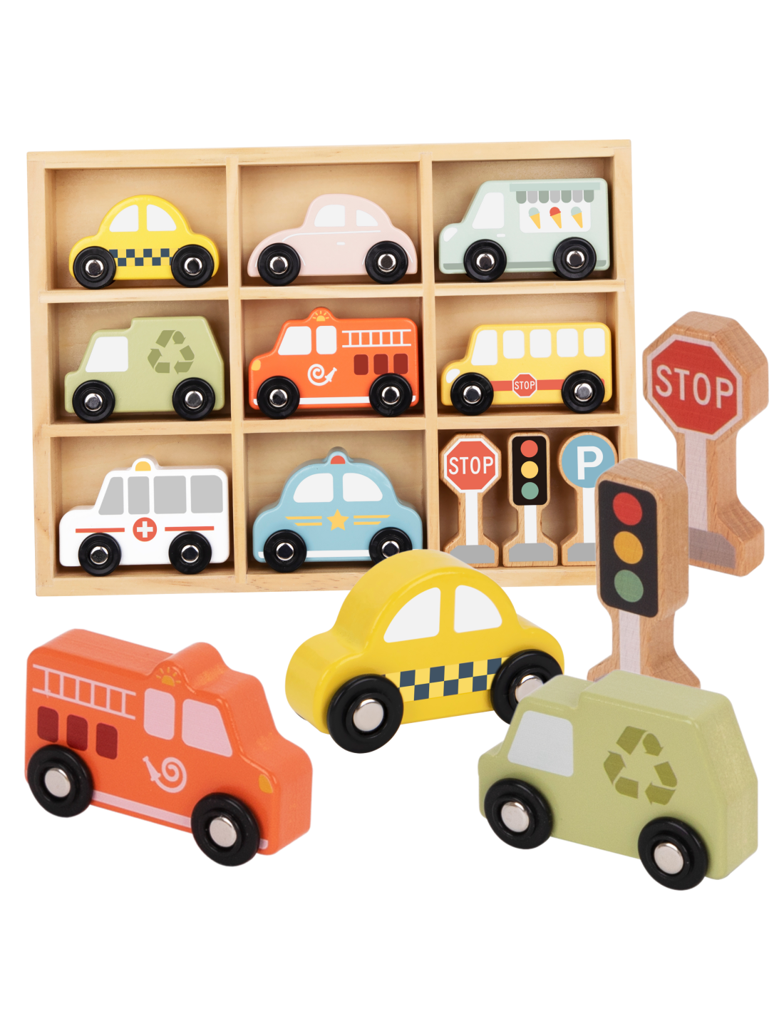 Zestaw Pojazdów i Znaków Drogowych od Tooky Toy to idealny sposób na naukę zasad poruszania się po drodze. Zestaw zawiera 8 różnych pojazdów oraz 3 znaki drogowe w pięknych pastelowych kolorach. Poprzez zabawę dziecko uczy się znaków drogowych, a kolorowe pojazdy umilą mu zabawę. Całość wykonana z najwyższej jakości materiałów i pomalowana nietoksycznymi farbami bezpiecznymi dla dzieci i środowiska.