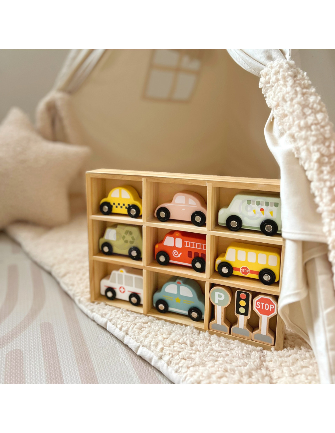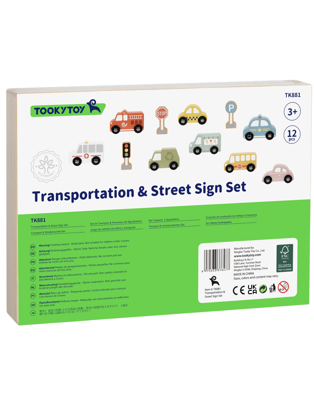 TOOKY TOY Zestaw Drewnianych Pojazdów i Znaków Drogowych w Pudełku