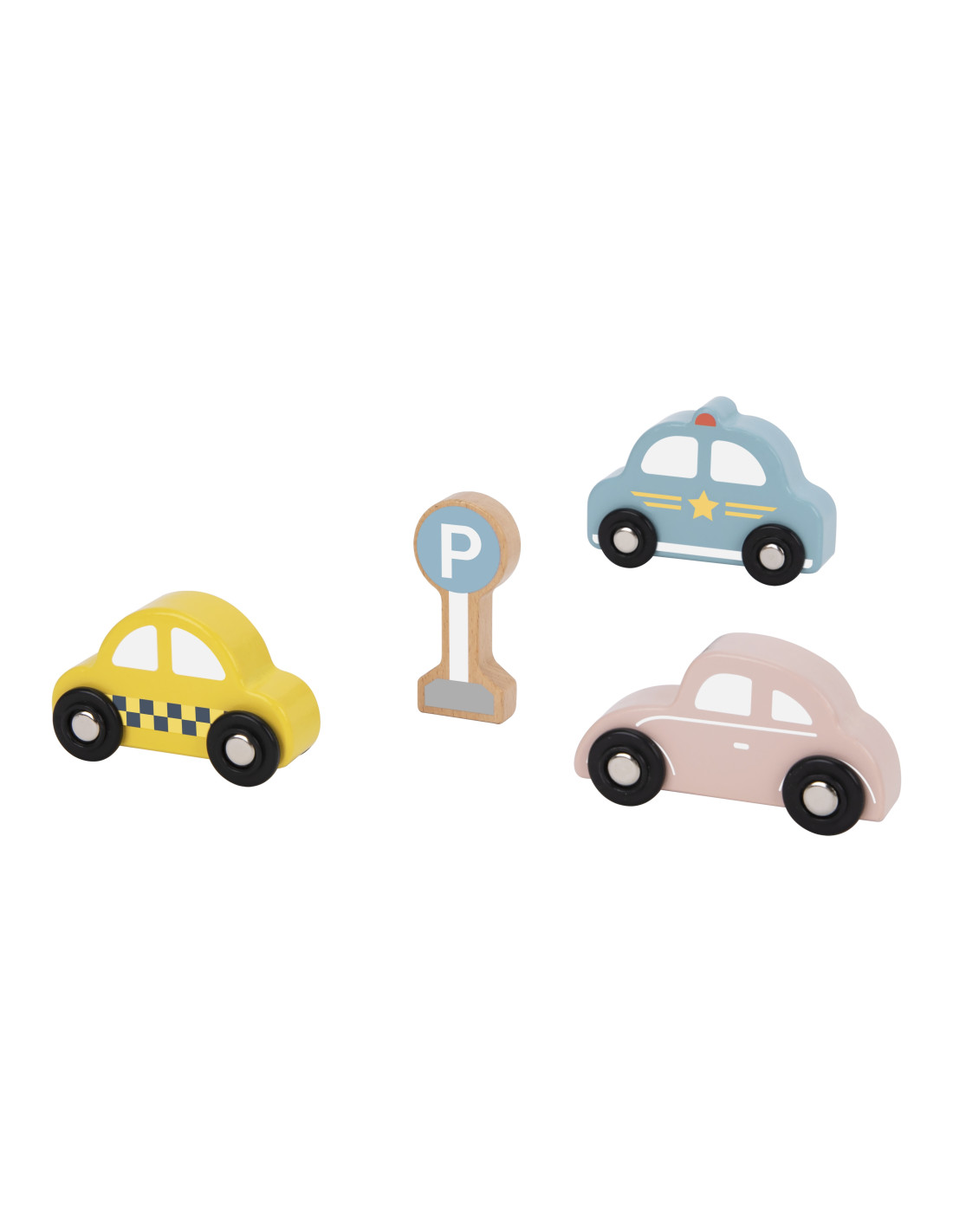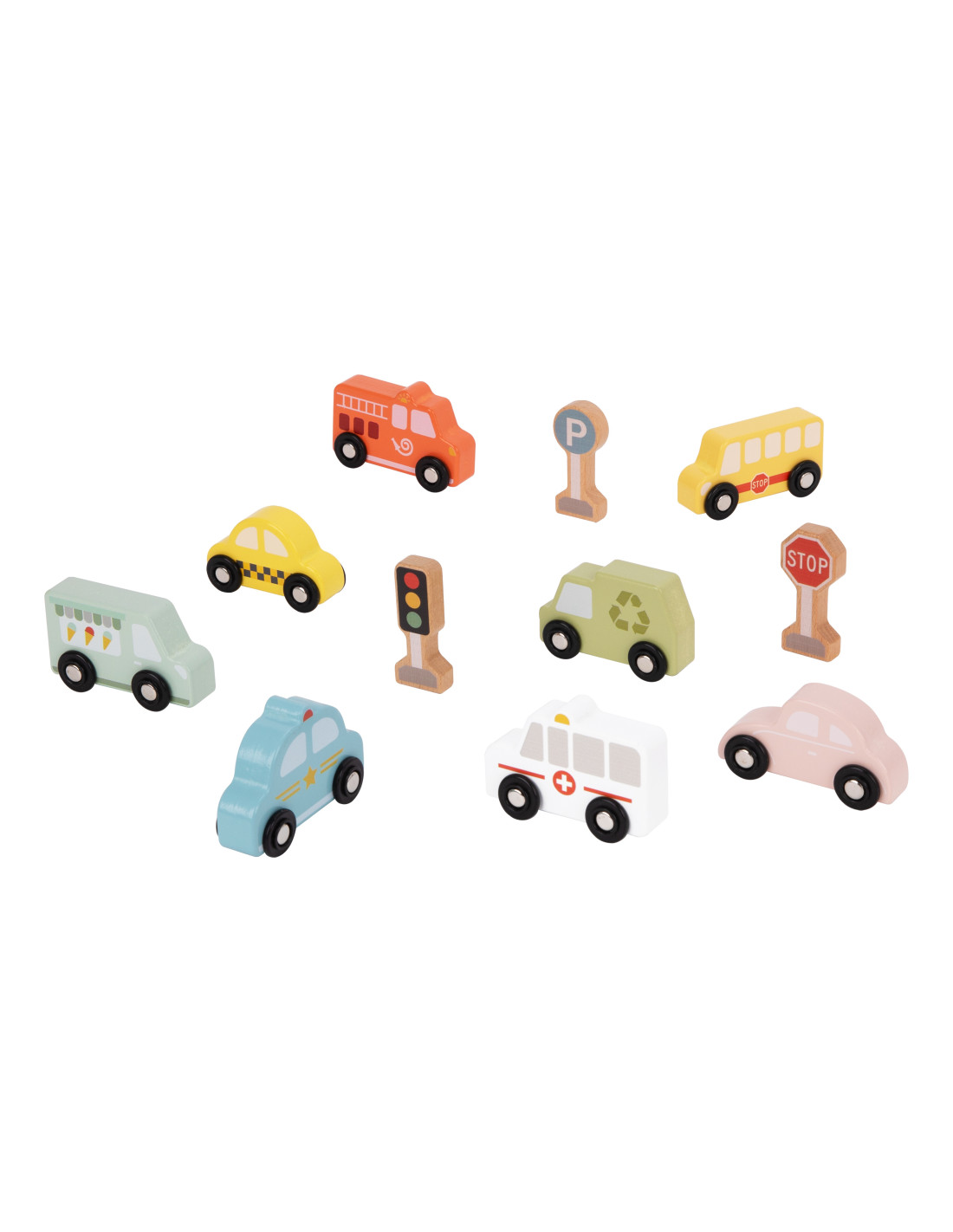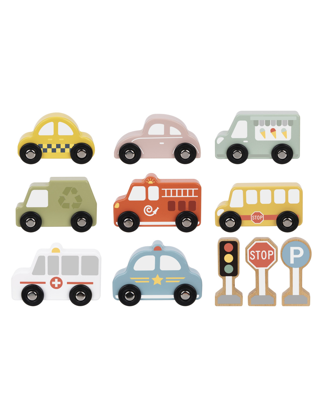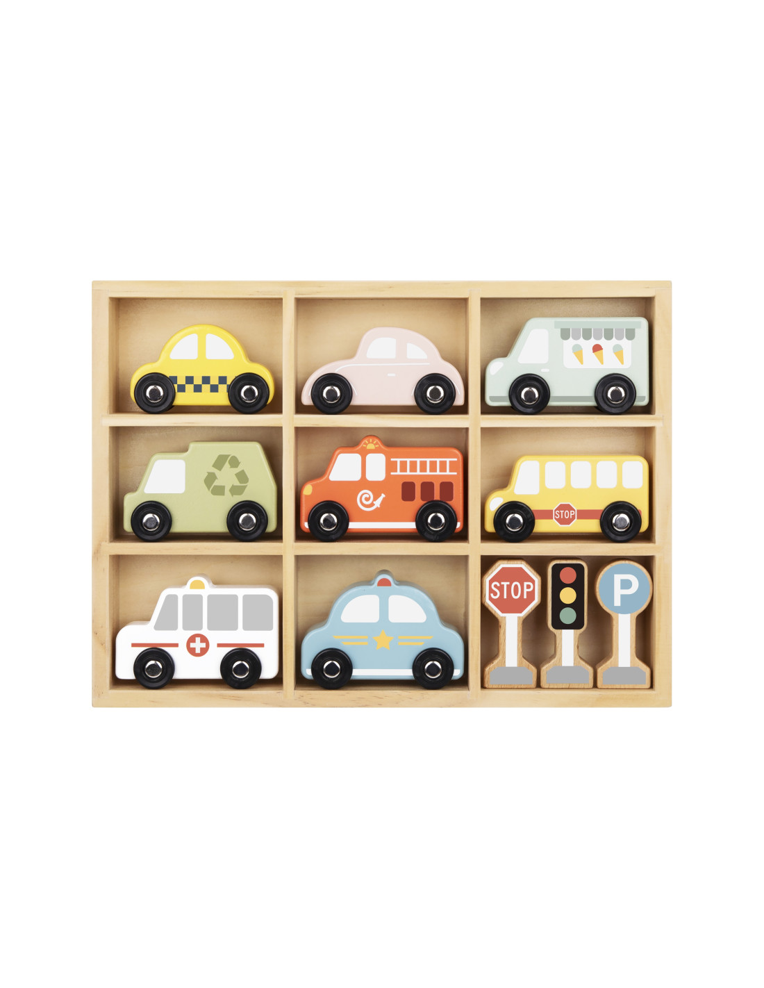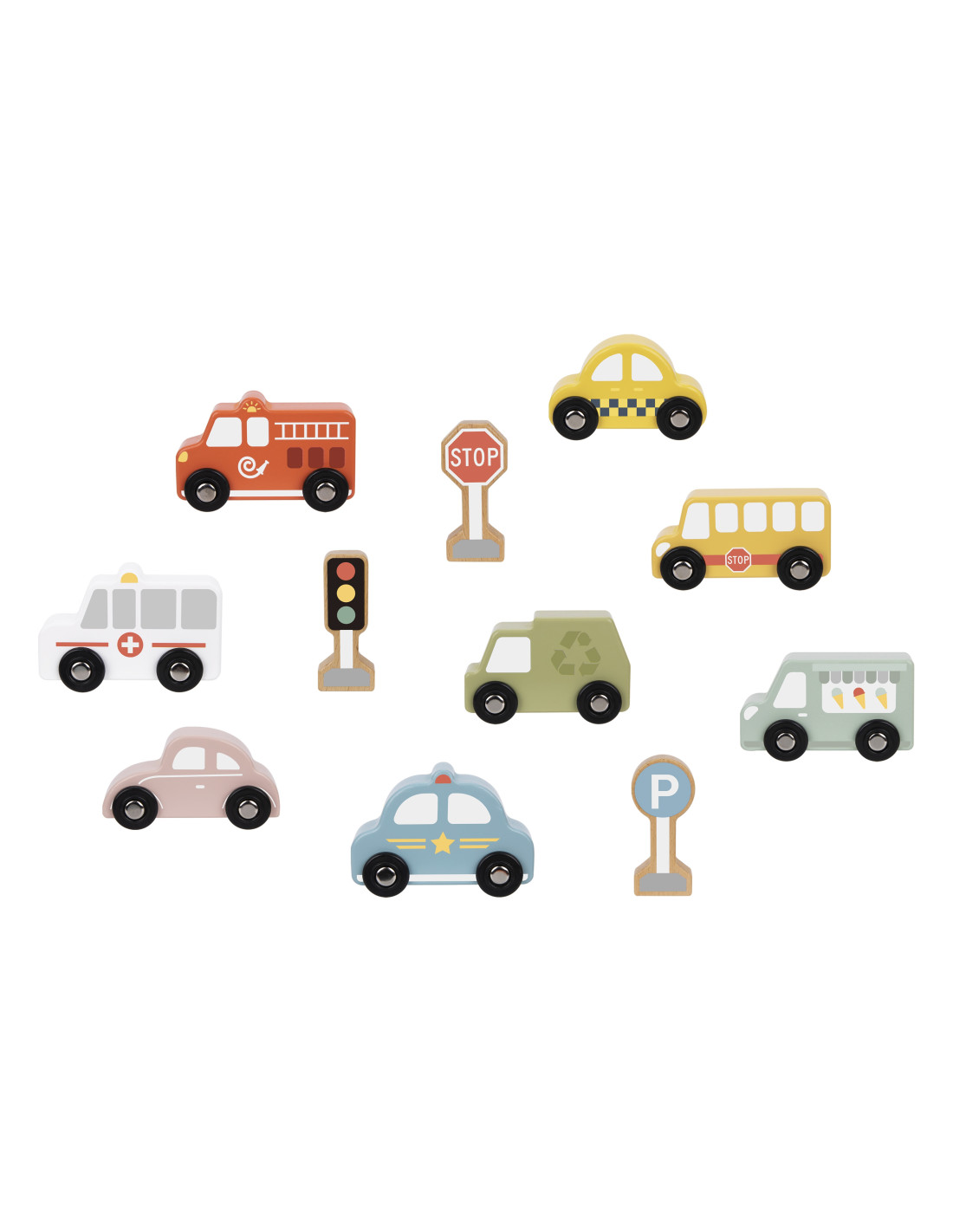 - - W pudełku znajduje się 8 pojazdów: taxi, samochód osobowy, food truck, śmieciarka, straż pożarna, autobus szkolny, karetka, samochód policyjny,
