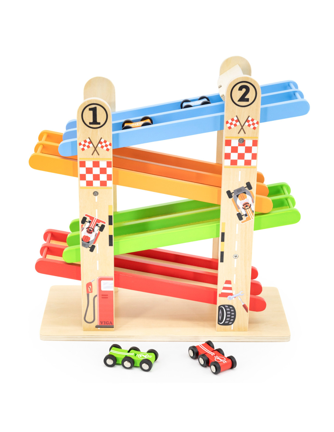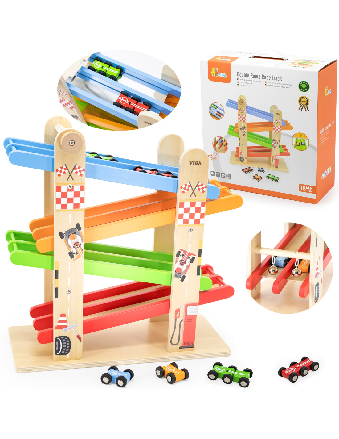 Tor wyścigowy to świetna zabawka dla każdego małego amatora wyścigów. Niepowtarzalny design oraz trwałość wykonania. To idealne uzupełnienie każdego dziecięcego pokoju. Dwa tory to jeszcze więcej zabawy w tej popularnej zabawce - dzieci mogą się bawić się ze sobą robiąc wyścigi dwóch samochodzików naraz! Na mecie czekają dzwoneczki, które zadzwonią wraz z dotarciem pojazdów na końcu toru. W zestawie znajdziemy dwa rodzaje czterech samochodzików: dwa czterokołowe oraz dwa sześciokołowe urozmaicą zabawę i przedstawią w formie zabawy zasady działania praw fizyki. Produkt został wykonany z myślą o małych rączkach dziecka. Brak ostrych krawędzi sprawia, ze jest bezpieczny dla malucha. Kolory przyciągną wzrok każdego dziecka i sprawią, że zabawy nie będzie końca. Gotowi? Start! Ciekawe kto wygra ten wyścig.