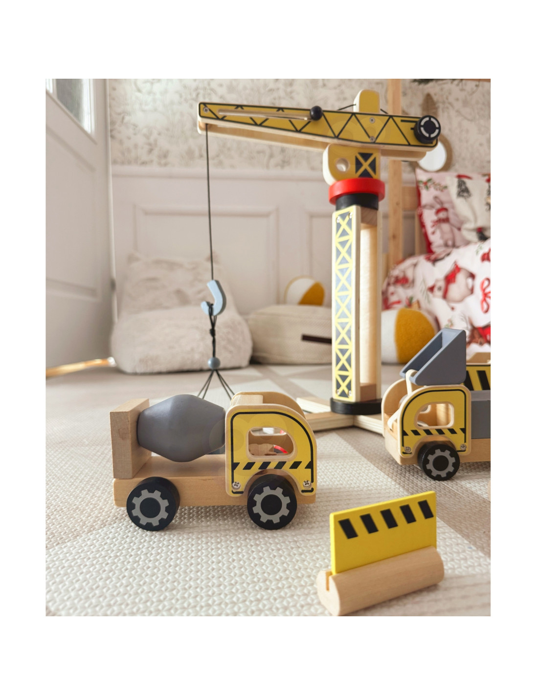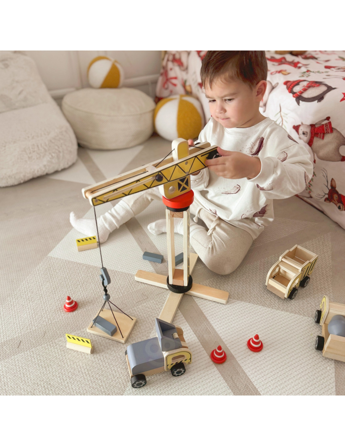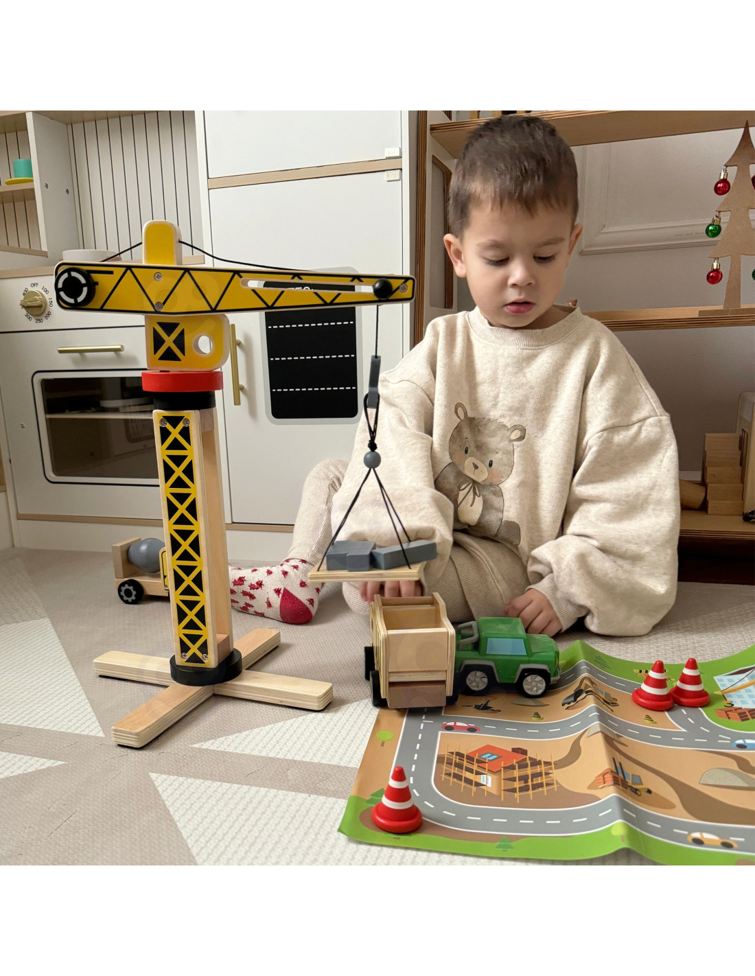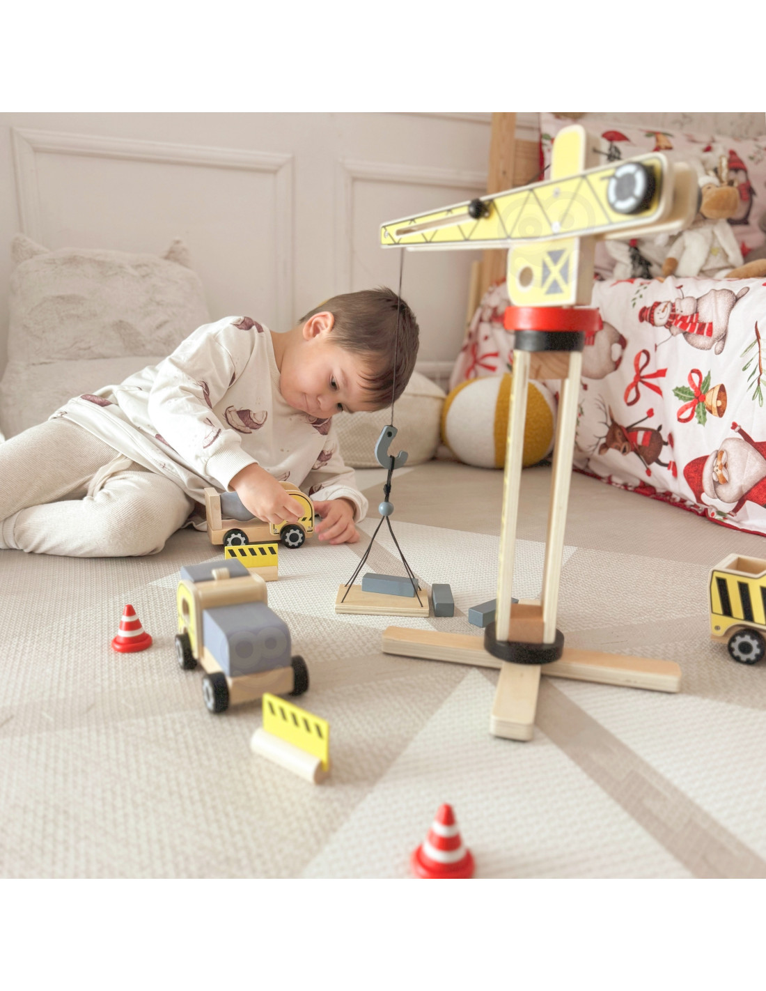 Ogromny Plac Budowy 5w1 od marki WOOPIE GREEN to marzenie każdego małego budowniczego! Ten rozbudowany zestaw pozwala dzieciom wcielić się w rolę inżyniera i przeprowadzić prawdziwą mini-budowę – od transportu materiałów po pracę dźwigiem i koparką. To nie tylko zabawa, ale również rozwój zdolności motorycznych, logicznego myślenia i wyobraźni. W zestawie znajdziesz gigantyczny dźwig o wysokości aż 42 cm, trzy pojazdy budowlane, matę z ilustracją placu budowy oraz inne realistyczne akcesoria. Wszystkie elementy zostały wykonane z solidnego drewna jałowca i pomalowane bezpiecznymi farbami.