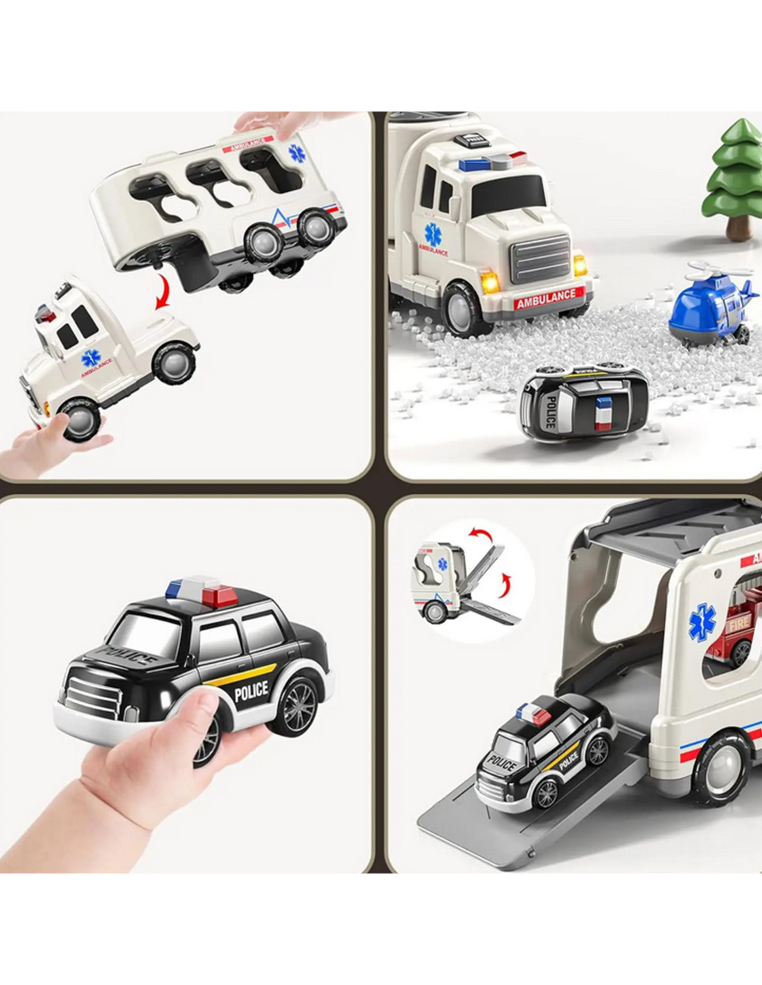 Duży Zestaw Ratunkowy Ciężarówka+4 Auta od Marki Woopie Zaprojektowana z myślą o małych pasjonatach straży pożarnej, policji,pogotowia ta zabawka 5 w 1 to idealny zestaw dla każdego małego ratownika! Naciśnij przycisk na górze kabiny ciężarówki, aby zobaczyć jasne migające światła i usłyszeć realistyczne syreny, bardzo atrakcyjne dla dzieci. Zestaw zawiera dużą ciężarówkę transportową oraz cztery pojazdy ratunkowe: samochód strażacki, radiowóz, helikopter policyjny, karete. Każdy z pojazdów ma ruchome elementy, które pozwolą Twojemu dziecku poczuć się jak prawdziwy bohater podczas akcji ratunkowych! Zestaw jest świetnym pomysłem na prezent urodzinowy, świąteczny czy na inne okazje.