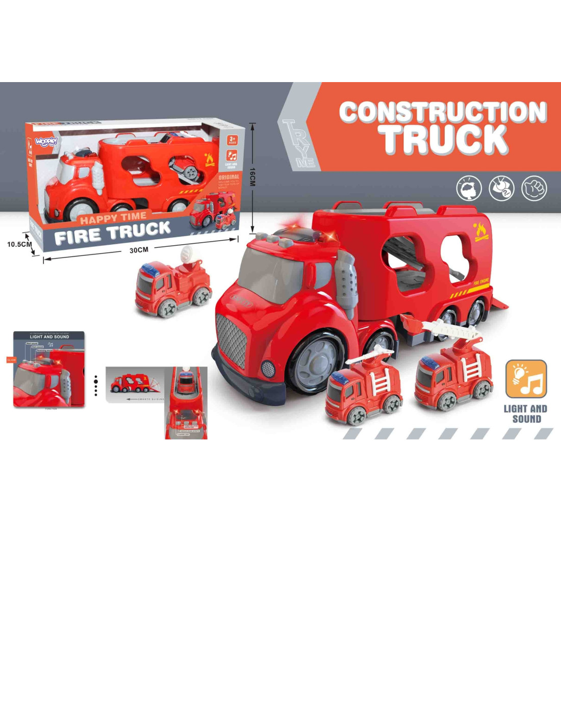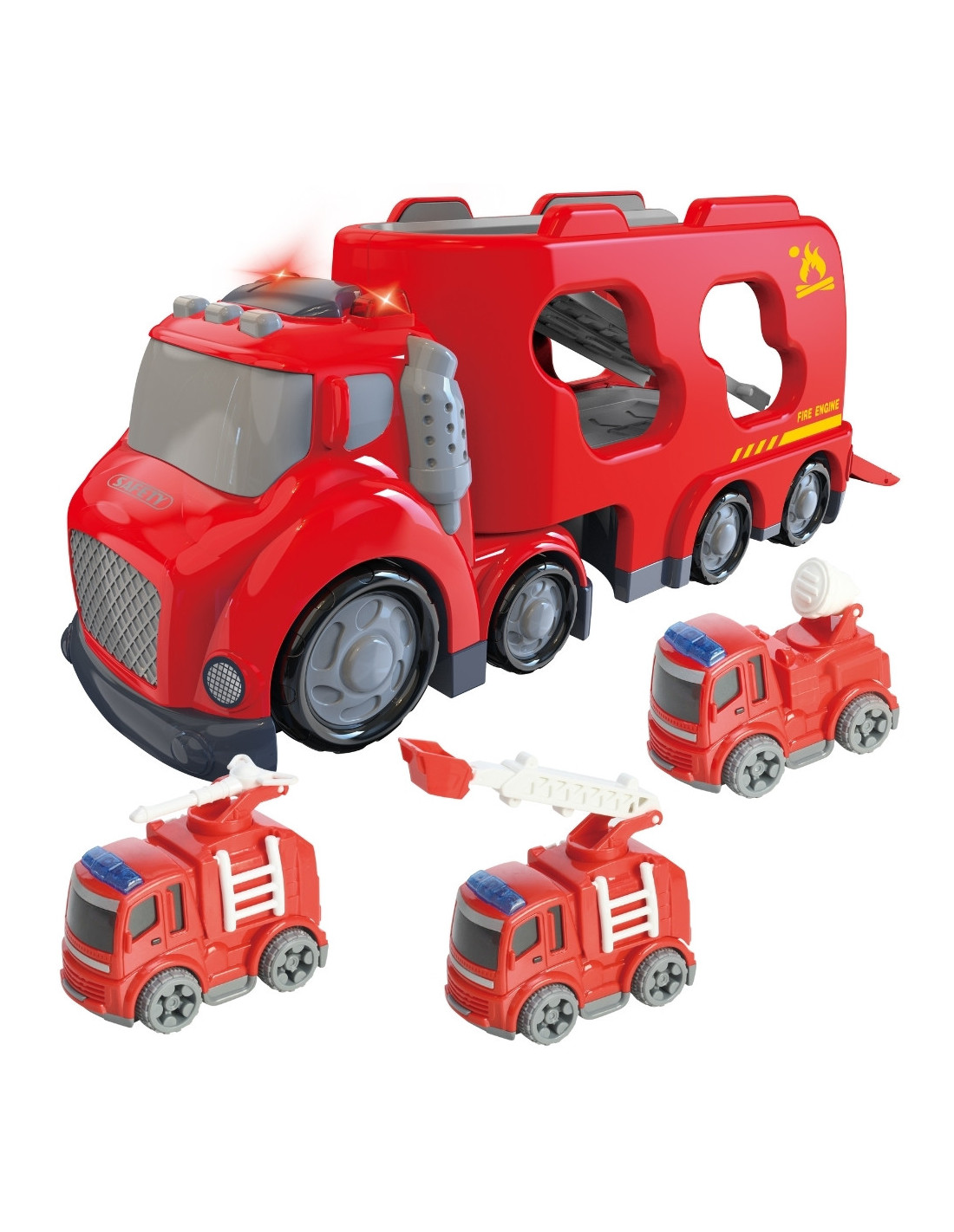 Laweta Fire Truck z serii CITY TRUCK to idealna zabawka dla każdego małego fana motoryzacji i miejskich pojazdów specjalnych. W skład zestawu wchodzi czerwona laweta przewożąca małe pojazdy strażackie. Zabawka została wykonana z trwałego tworzywa sztucznego, wyposażona w efekty świetlne i dźwiękowe, które aktywują się po naciśnięciu przycisku na dachu pojazdu.
