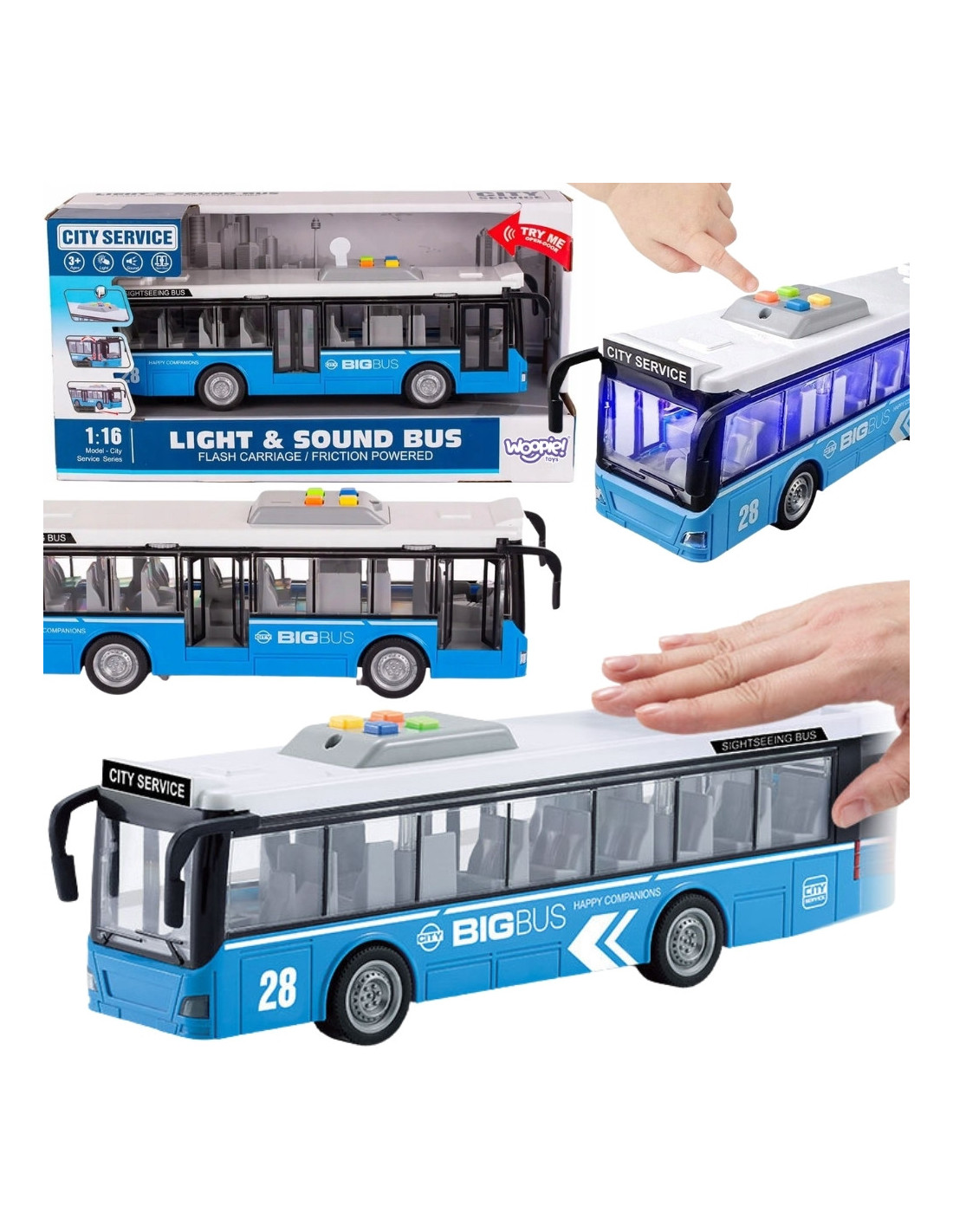 Wielka frajda dla małych miłośników komunikacji miejskiej! Zabawkowy autobus miejski WOOPIE to idealna propozycja dla małych miłośników motoryzacji i transportu miejskiego. Realistyczne detale, dźwięki, światła oraz możliwość otwierania drzwi zapewniają mnóstwo frajdy i wspierają rozwój wyobraźni dziecka. Pojazd posiada wiele wbudowanych funkcji, które nie pozwolą się nudzić. Wyposażony jest w różne efekty dźwiękowe, podświetlenie wnętrza oraz otwierane drzwi przednie i tylne. Zabawka posiada cztery gumowe koła oraz napęd frykcyjny. Wystarczy ją pchnąć do przodu lub do tyłu i sama przejedzie nawet klika metrów.