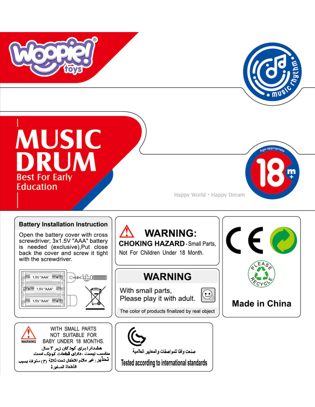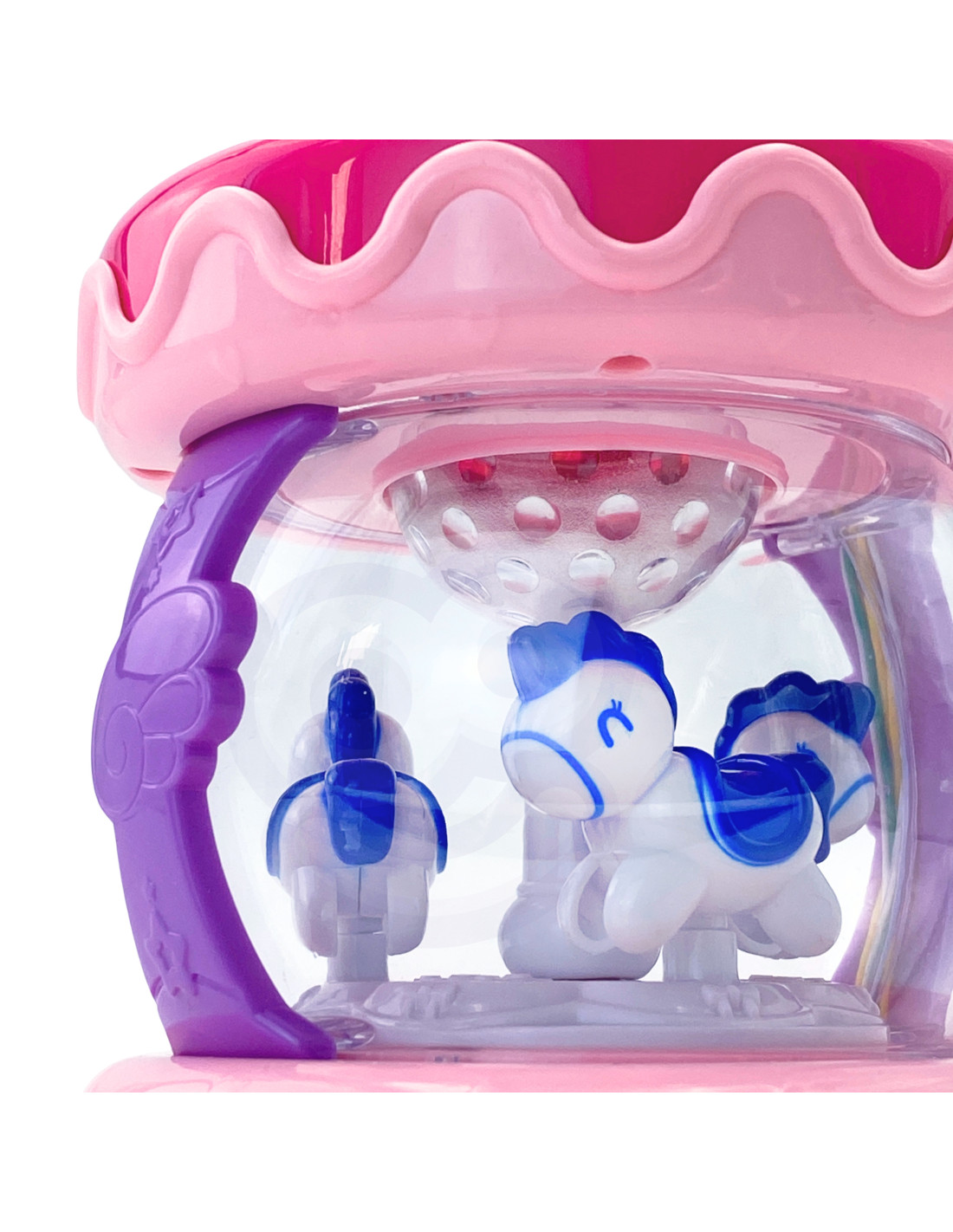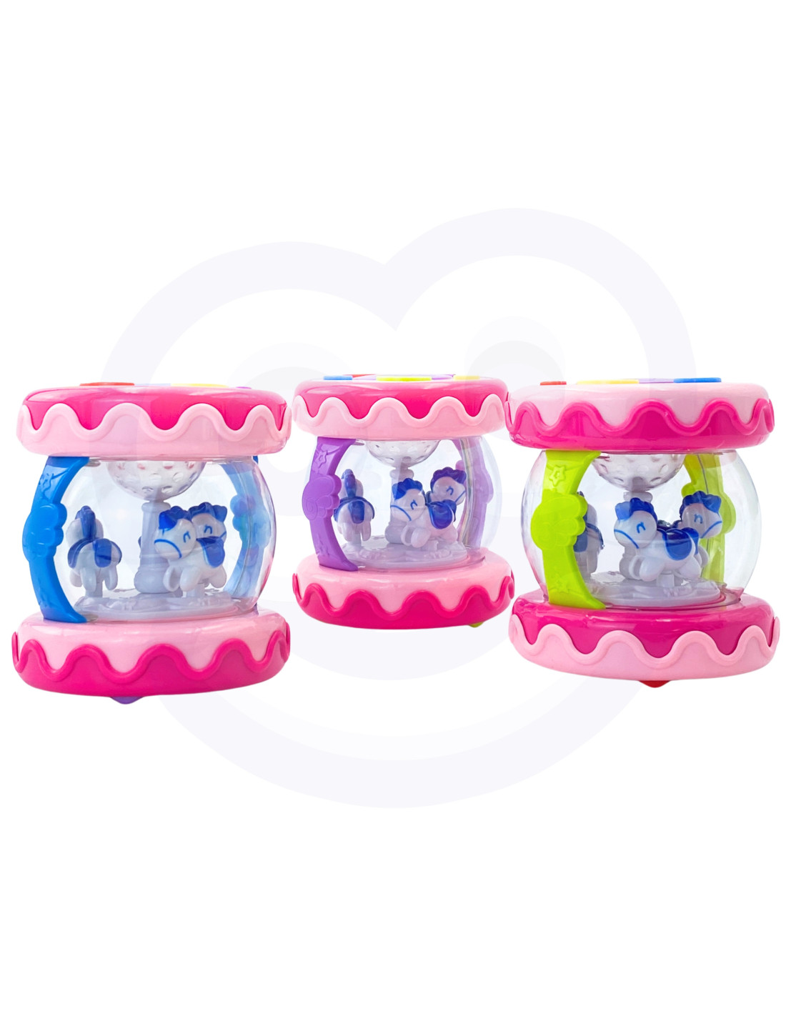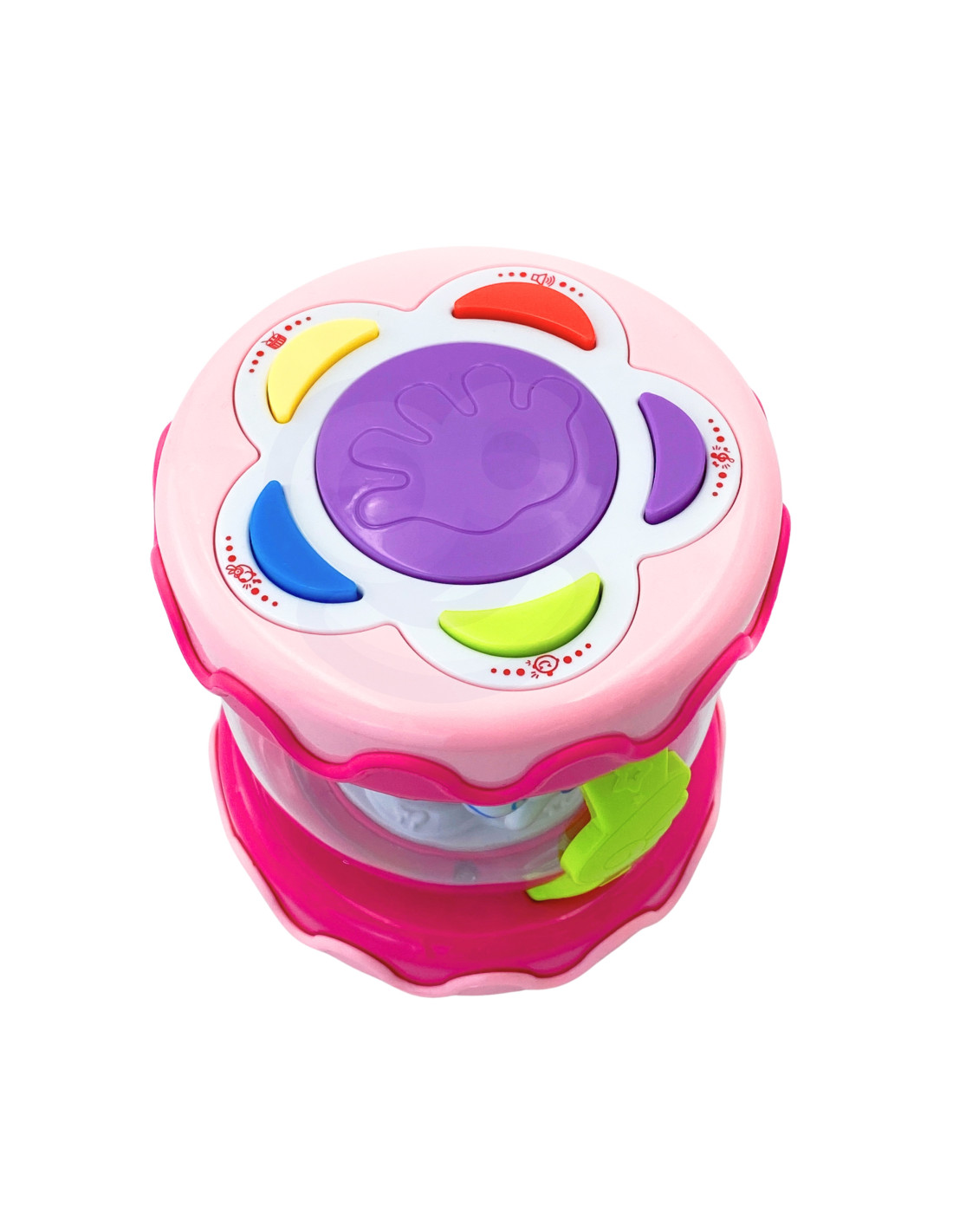 Muzyczny Bębenek Pozytywka od marki WOOPIE to zabawka potrzebna każdemu dziecku. Zabawka ma na celu głównie rozwijania zmysłów, a także ma pomóc przy usypianiu dziecka. Zabawka działa, również jako pozytywka z kręcącymi się konikami w środku. Posiada 6 guzików dźwiękowych w tym duży bębenek. Podczas grania melodyjek światełka migają. W nocy zabawka pełni funkcje projektora - światełka świecą i imitują gwiazdy. Zabawka posiada tryb czuwania po 60 sekundach bez używania dźwięków. Zabawka wysoce rozwija zmysły dziecka i pomaga dziecku skoncentrować się na długi czas.