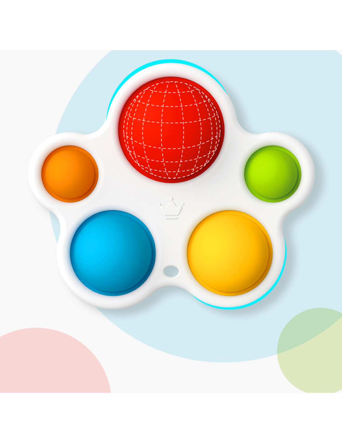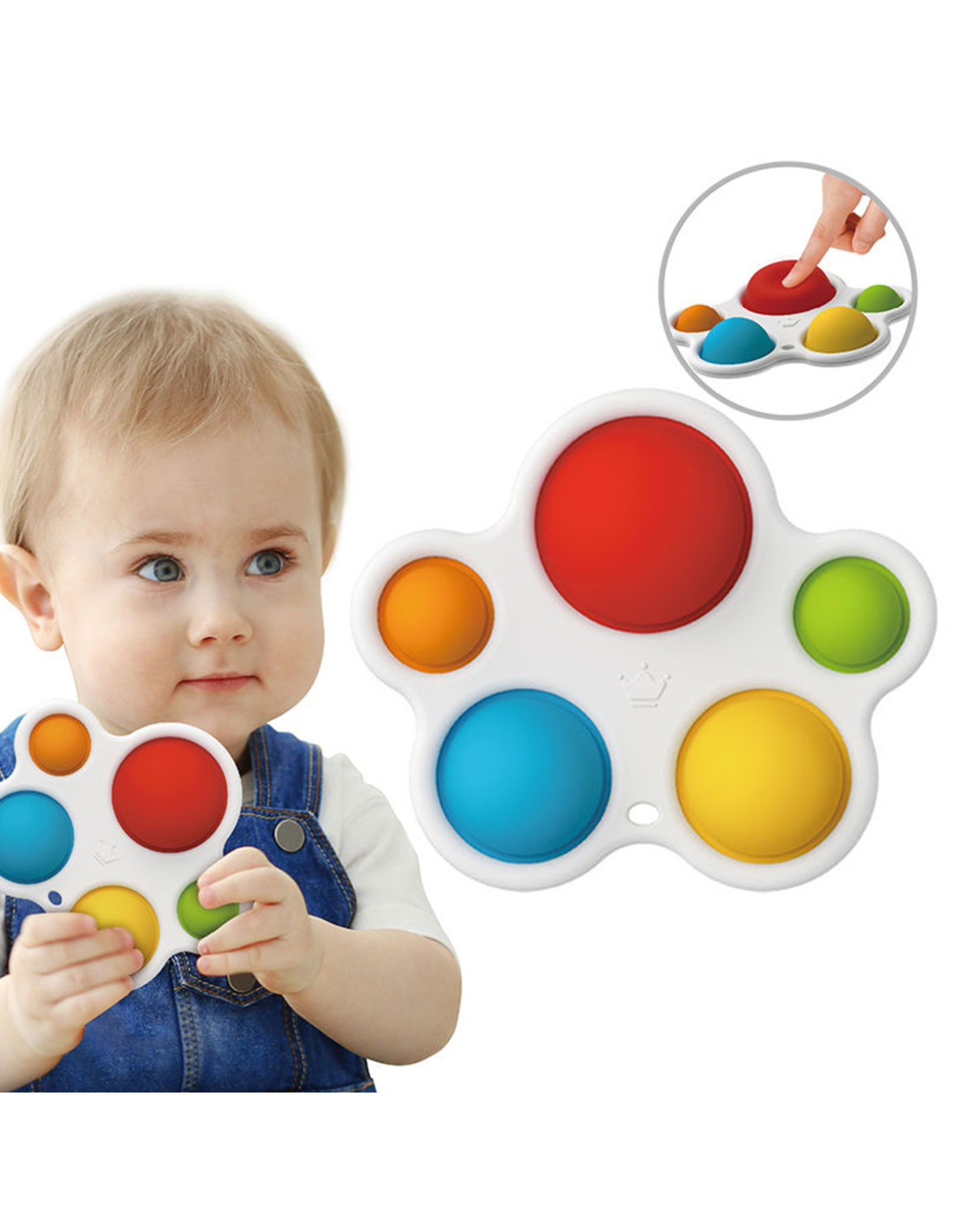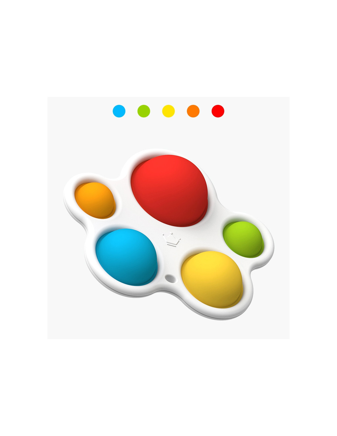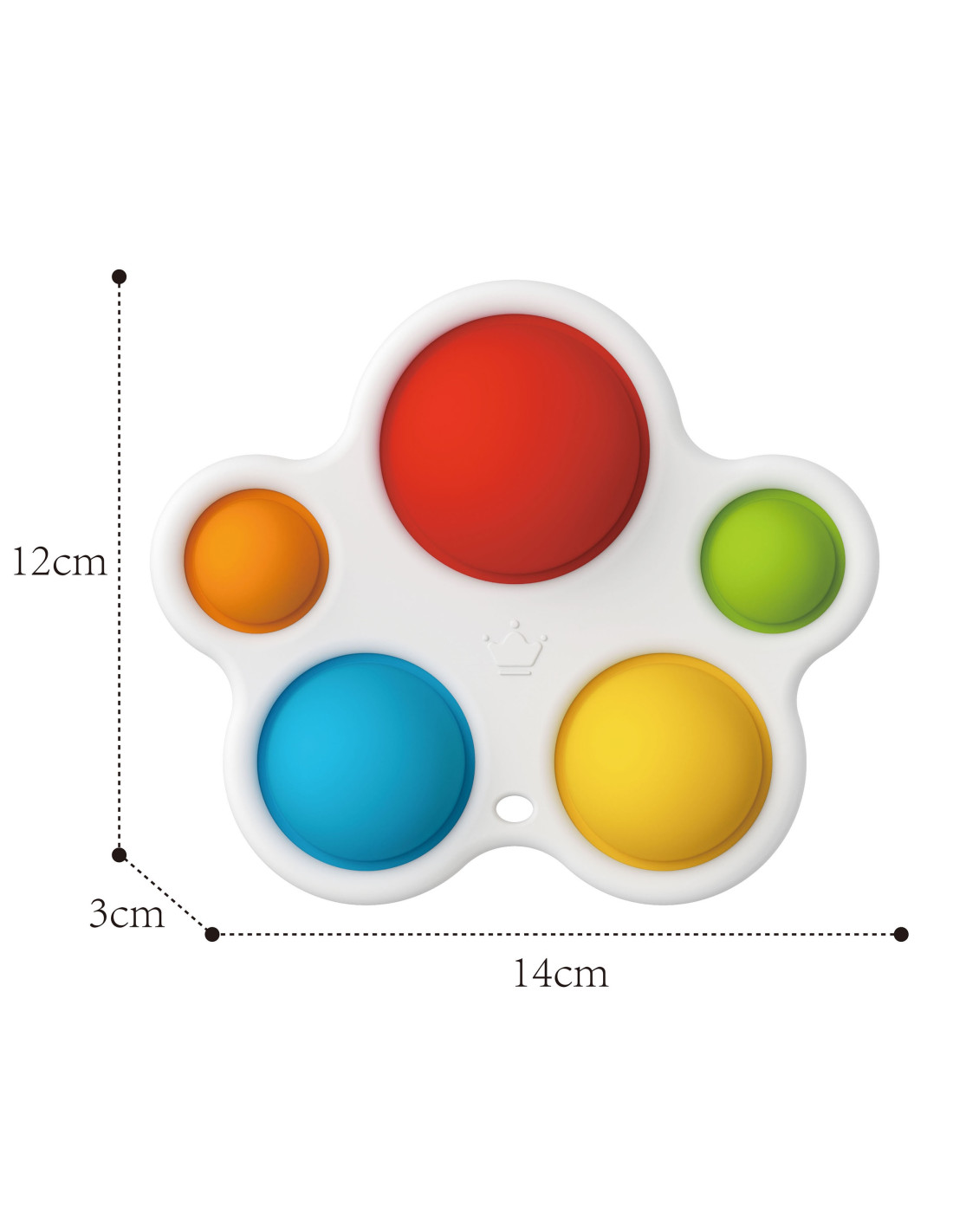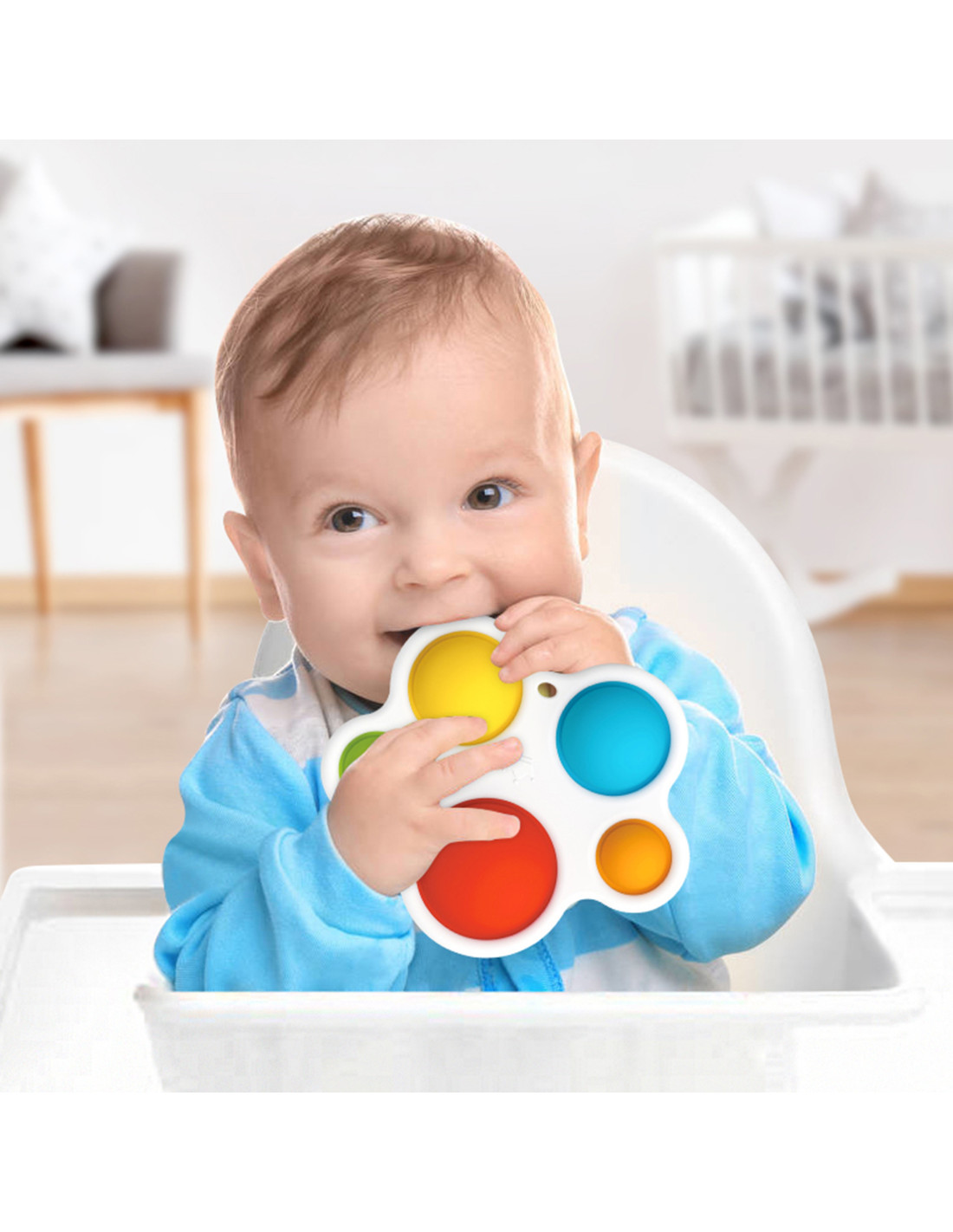 Zabawka sensoryczna POP IT od marki WOOPIE jest kolorową, innowacyjną w swojej prostocie zabawką z nowoczesnym designem, która stymuluje zmysły dziecka i jednocześnie działa antystresowo. W plastikowej ramie umieszczonych jest 5 kolorowych, silikonowych baniek o różnych kolorach i wielkościach, które można wciskać i wypychać. Przy ściskaniu silikonowych piłeczek zabawka wydaje z siebie dźwięki, które dodatkowo przyciągają uwagę dziecka. Może posłużyć jako ciekawie wyglądający gryzaczek dla dziecka.