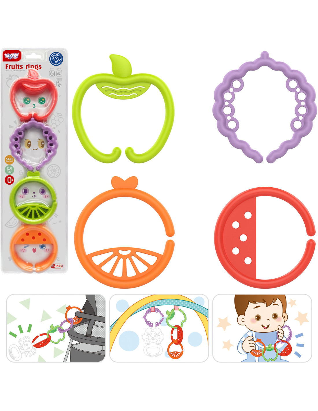 Zawieszki Zwierzątka Łańcuszek 4 el od marki WOOPIE są to kolorowe zawieszki w kształtach zwierzątek, które w bardzo łatwy sposób dziecko może łączyć ze sobą tworząc przeróżne kombinacje. Zawieszki mogą być wykorzystywane na bardzo wiele sposobów, zaczynając od tworzenia łańcuszka wykorzystując je jako ogniwa, poprzez przymocowanie za ich pomocą ulubionych swoich zabawek, kończąc na wykorzystywaniu ich do innych zabaw w formie płaskich figurek zwierząt. Mogą być zamocowane do pałąka fotelika, wózka dziecięcego czy fotelików samochodowych, a ich wykorzystanie zależy od naszej kreatywności, którą doskonale rozwijają. W zestawie znajdują się 4 sztuki zawieszek o 4 różnych kształtach.