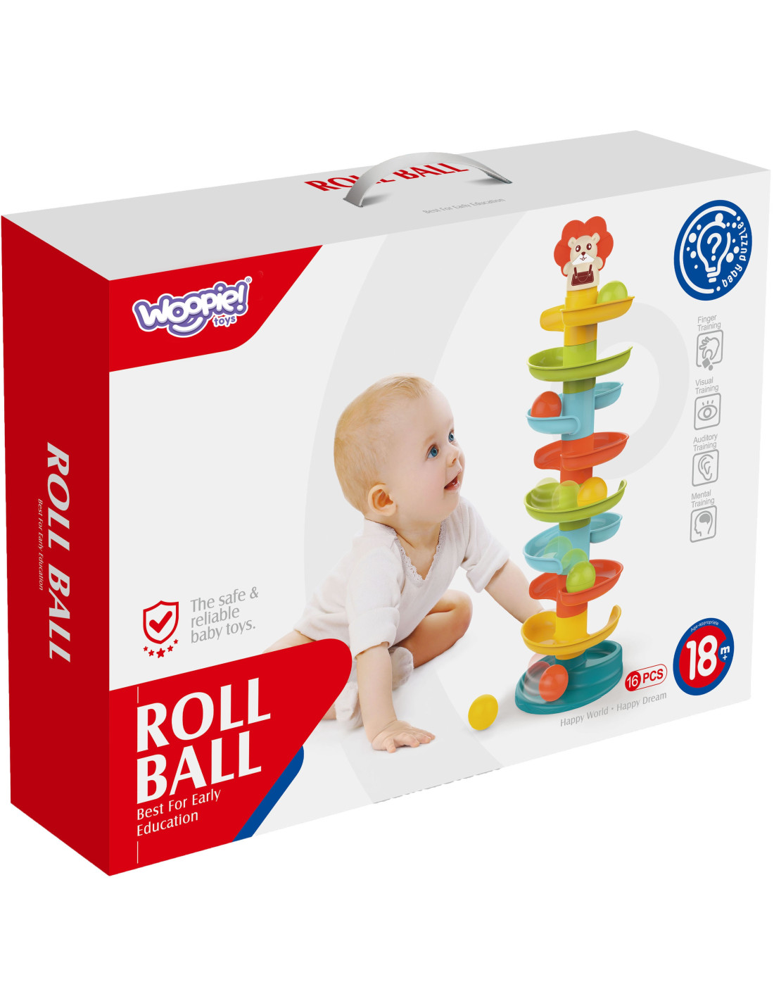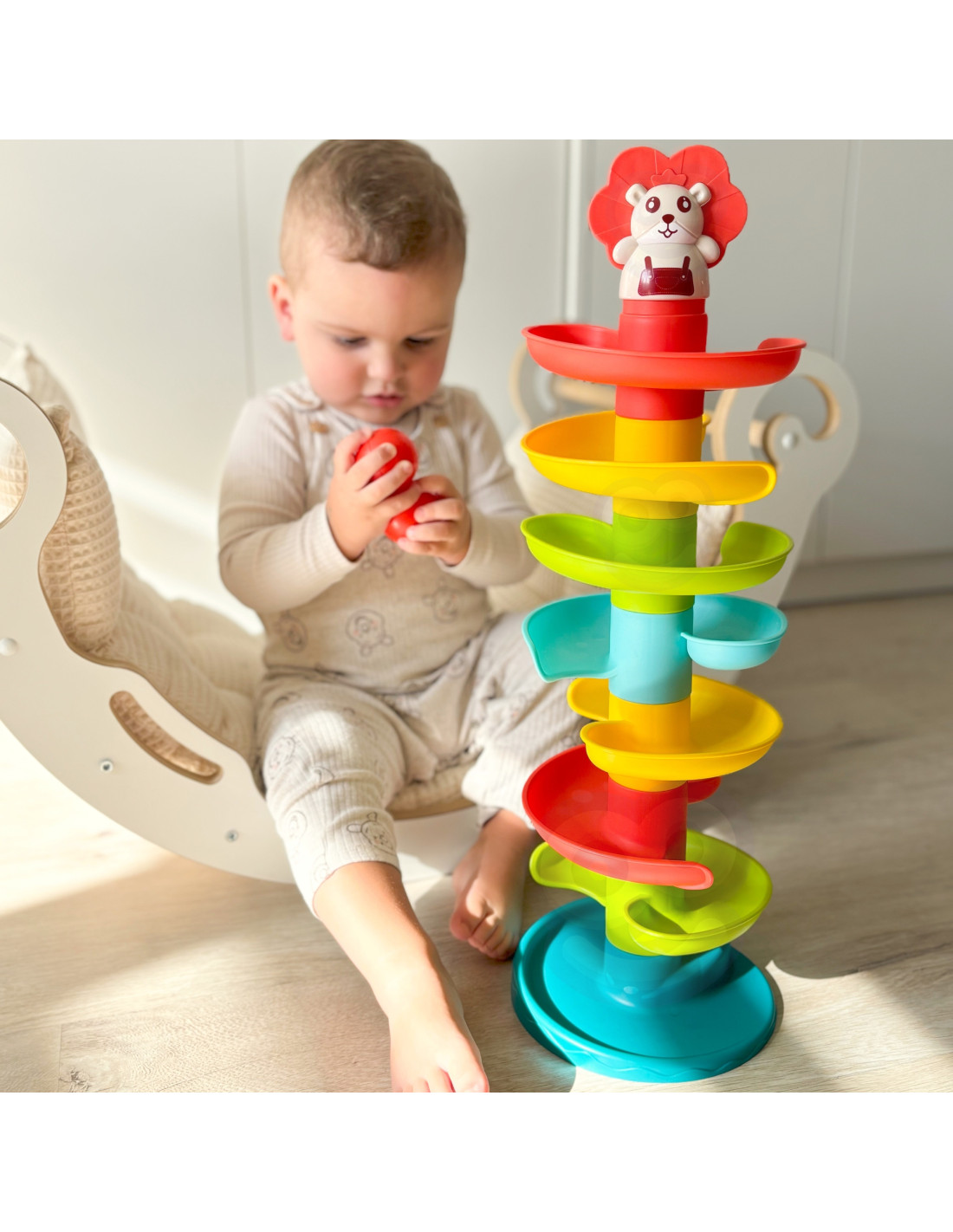 Kulodrom od WOOPIE to spiralna wieża zapewniająca niekończącą się zabawę. Ten kolorowy zestaw składa się z 10 kolorowych części , które maluch może z łatwością układać jedna na drugiej. Puszczaj kulki pojedynczo z najwyższego poziomu i obserwuj, jak toczą się i huśtają jedna po drugiej. Kulodrom wyposażony jest w 6 lekkich i łatwych do uchwycenia kulek w różnych kolorach, które podczas poruszania wydają dźwięk. Rozmiar jest odpowiedni dla małych rączek i pomaga rozwijać koordynację wzrokowo-ruchową.