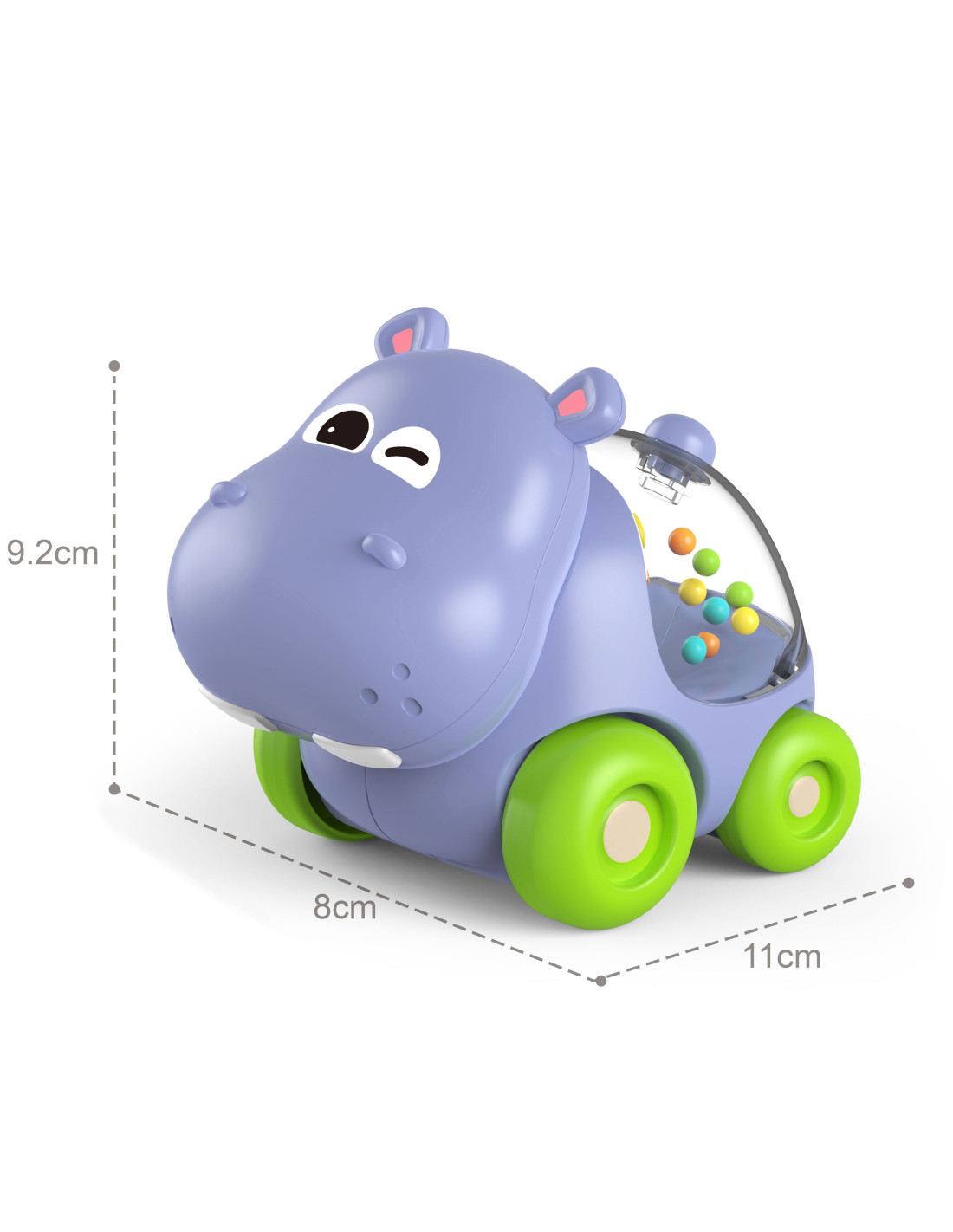 Grzechotka - Autko w kształcie uroczego hipopotama od marki WOOPIE! Ta niezwykła zabawka to doskonały sposób na pobudzenie dziecka do aktywności, rozwijając jednocześnie jego zmysły. Gdy maluch porusza grzechotką, w brzuszku zwierzaczka kolorowe kuleczki zaczynają szeleścić i obracać się, dostarczając zarówno bodźców dźwiękowych, jak i wzrokowych. Dziecko może z łatwością popychać zabawkę, dzięki czemu jest mobilizowane do raczkowania lub chodzenia.