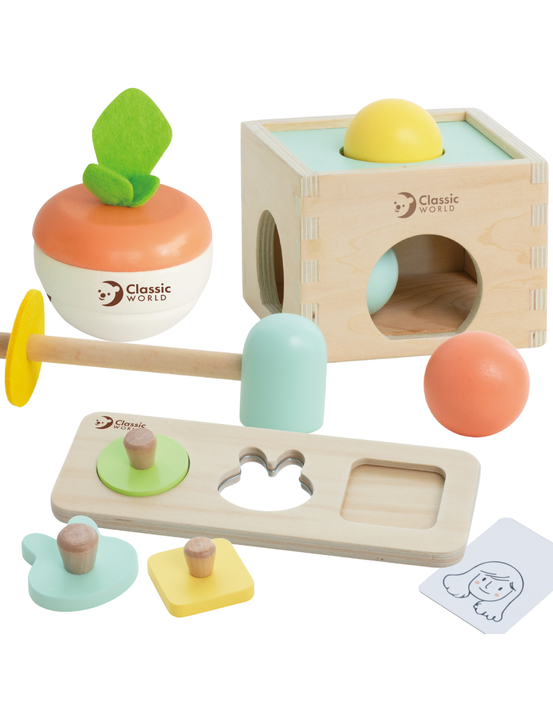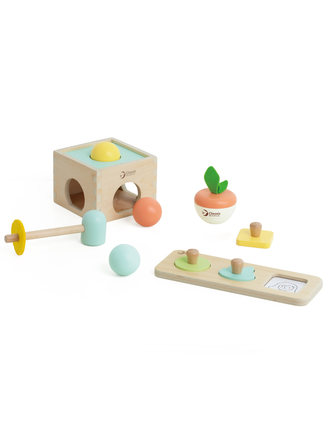 Pastelowy Zestaw Edukacyjny od marki CLASSIC WORLD to produkt upominkowy dla dzieci w wieku od 6 do 12 miesięcy, który stawia przed maluchami nowe wyzwanie w zakresie dopasowywania kształtów i aspektów matematycznych. Są gotowi wykonać zadanie obiema rękami. Zestaw buduje i kieruje ich zdolnościami w sposób zrównoważony. Zestaw zawiera wszystkie potrzebne zabawki, aby zabawić i rozwinąć dziecko.