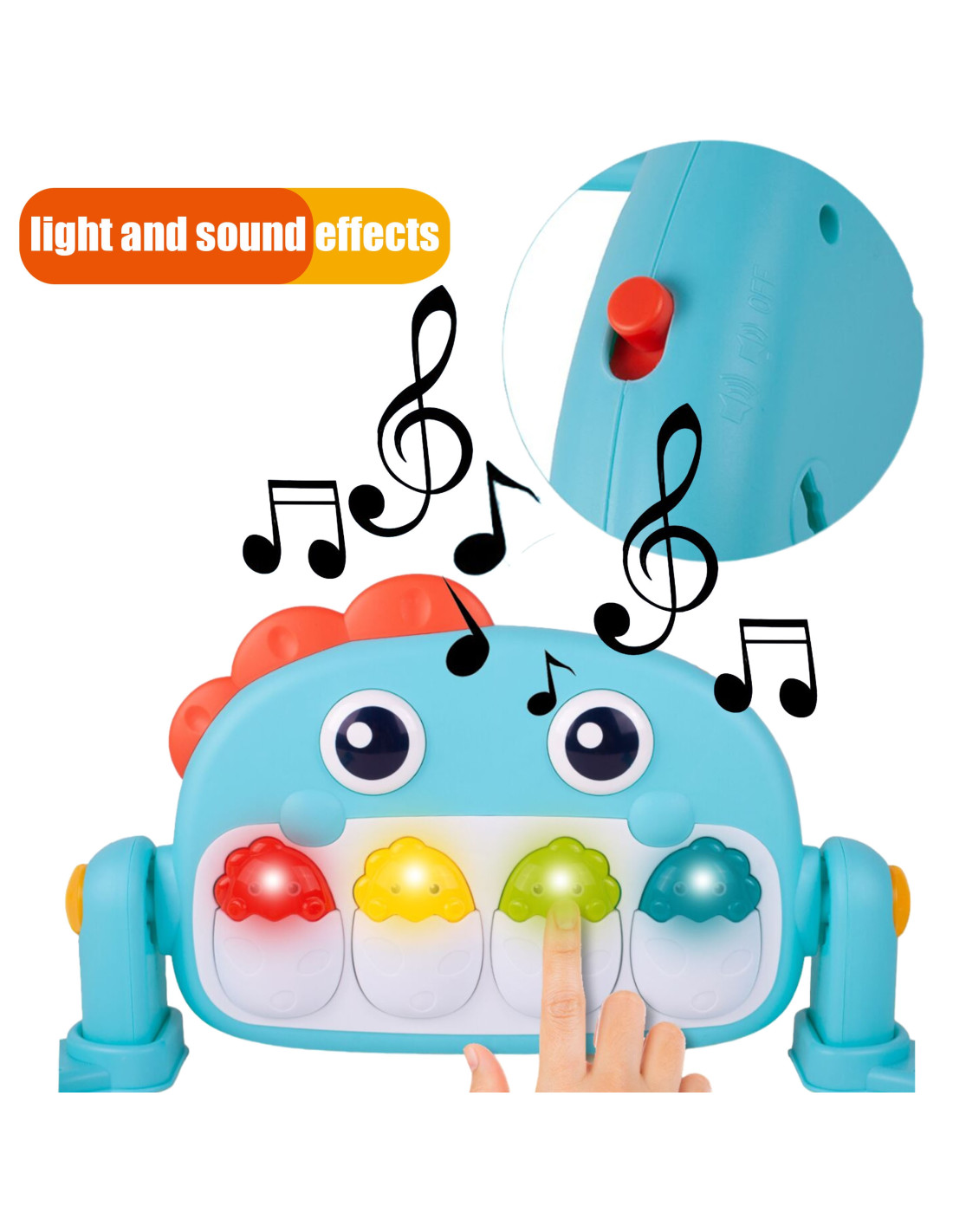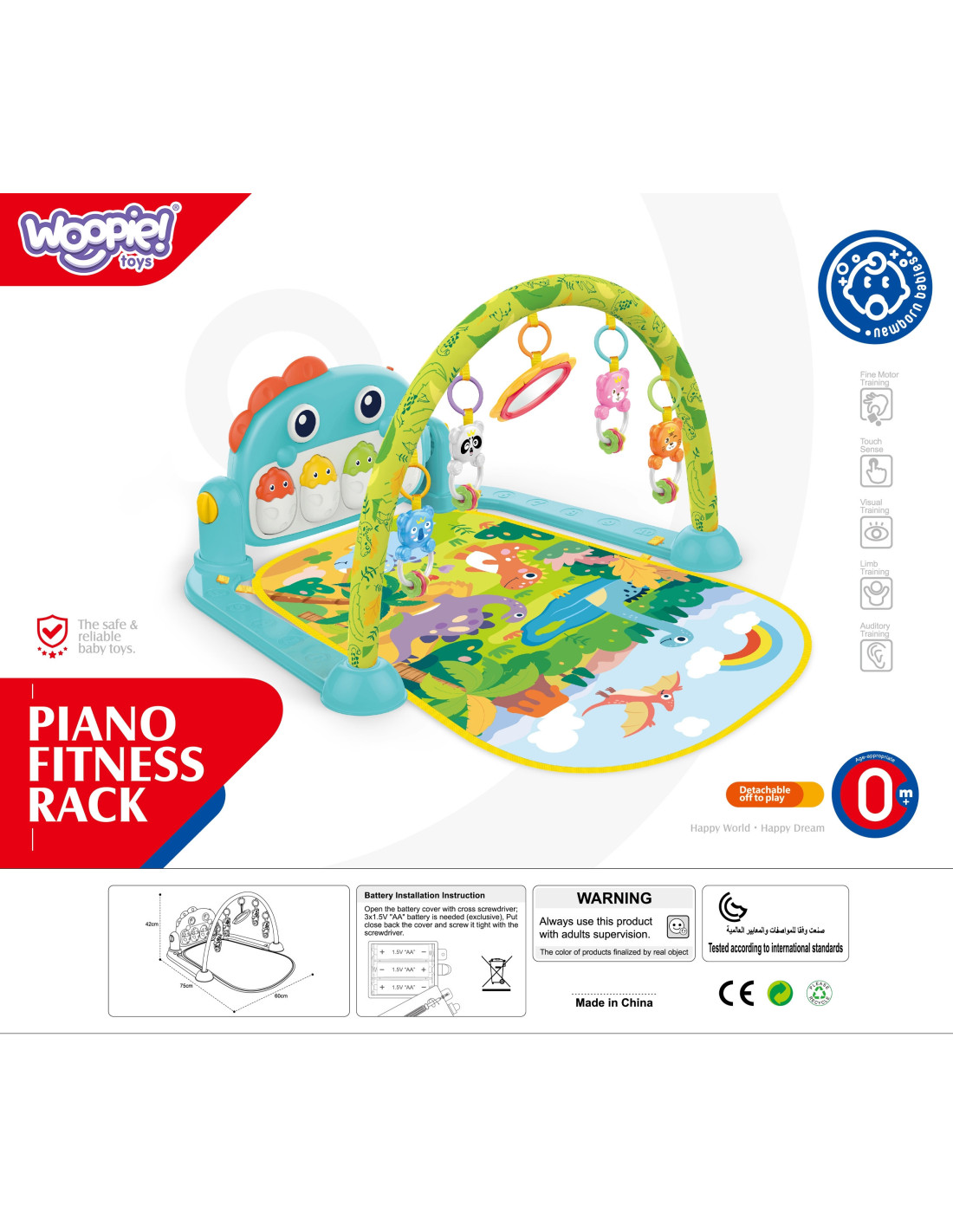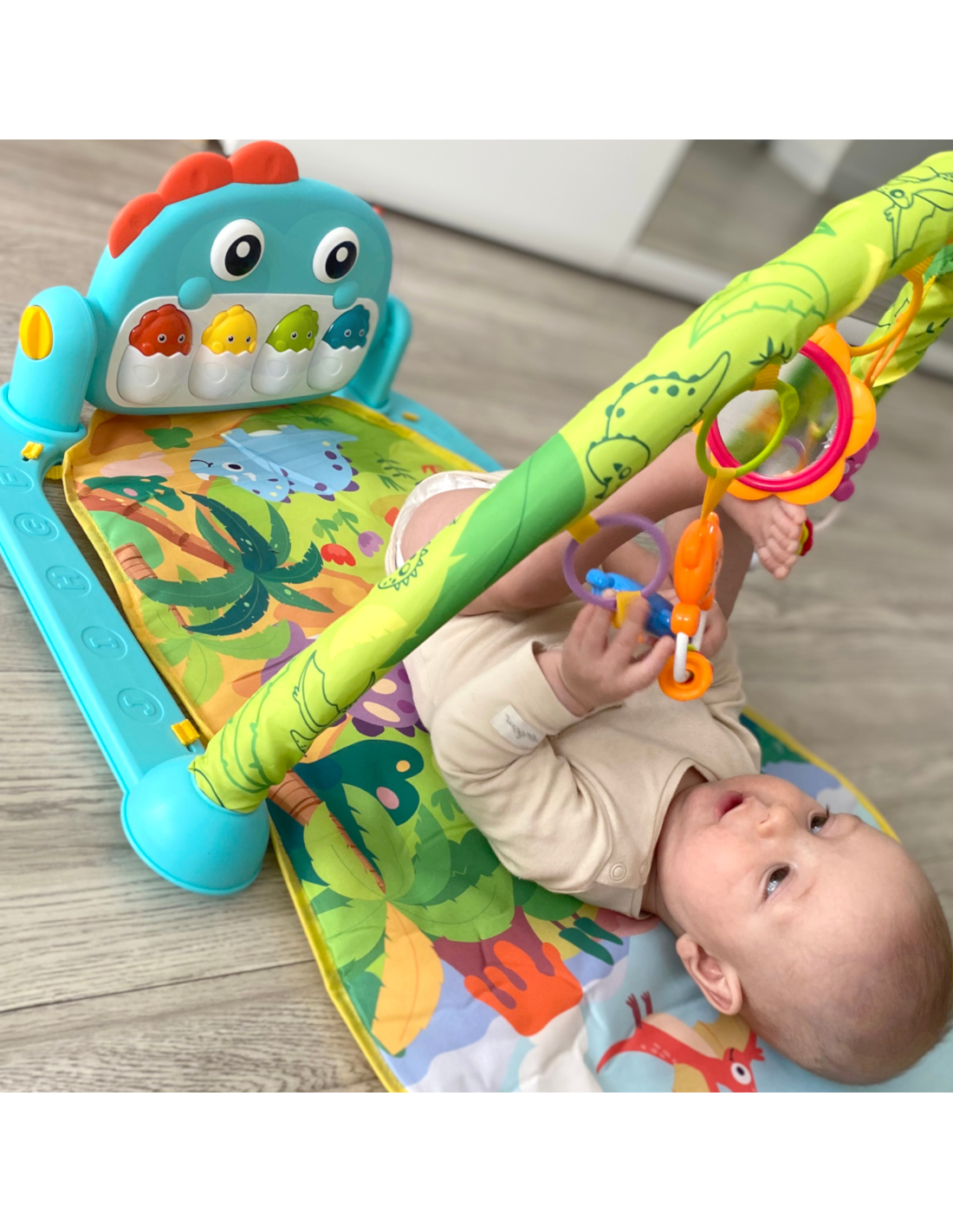 Mata z Pałąkiem Dino od marki Woopie to zabawka przeznaczona dla dzieci od urodzenia. Mata posiada pałąk z kolorowymi zawieszkami w kształcie zwierzątek i lusterkiem oraz przesuwne kółeczka, wpływa pozytywnie na rozwój wszystkich zmysłów u niemowlaka. Nasza mata to świetne miejsce na relaks, zabawę i odkrywanie świata. Panel z grającymi jajkami dinozaurów wyposażony w przyjemne melodie umila zabawę.