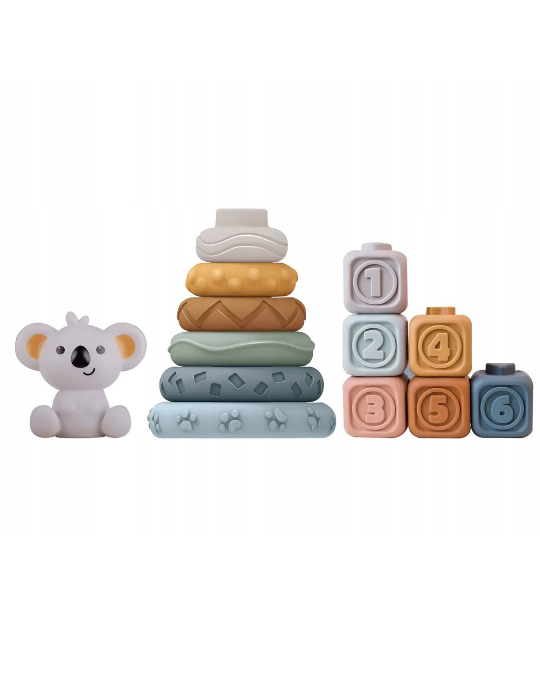Uroczy zestaw edukacyjny od marki WOOPIE to idealny wybór na bezpieczny i rozwijający prezent dla każdego malucha. Zabawka wykonana z elastycznego, nietoksycznego materiału może służyć również jako gryzak, przynosząc ulgę podczas ząbkowania. Zestaw składa się z piramidki i klocków, które oferują szerokie możliwości edukacyjne i sensoryczne. Piramidka złożona z sześciu kółek o różnych rozmiarach, zakończona uroczą figurką koali, oraz sześć klocków z wypukłymi liczbami tworzą wszechstronną zabawkę stymulującą rozwój dziecka na wielu płaszczyznach.