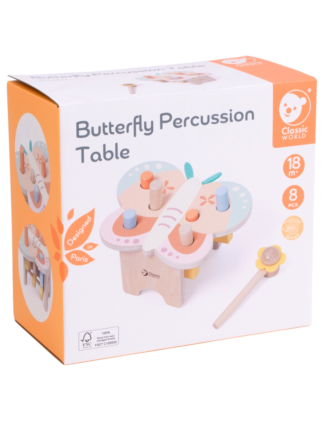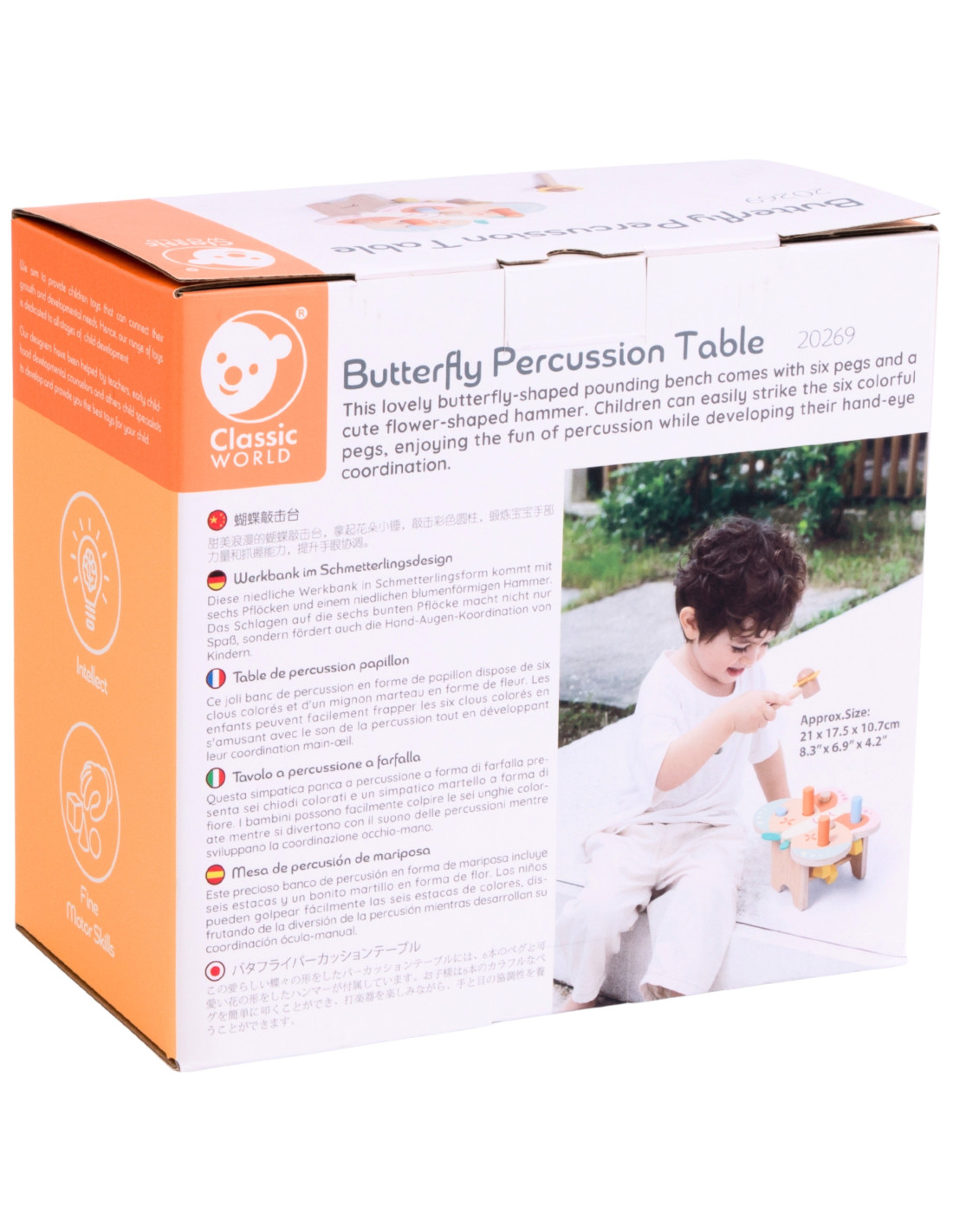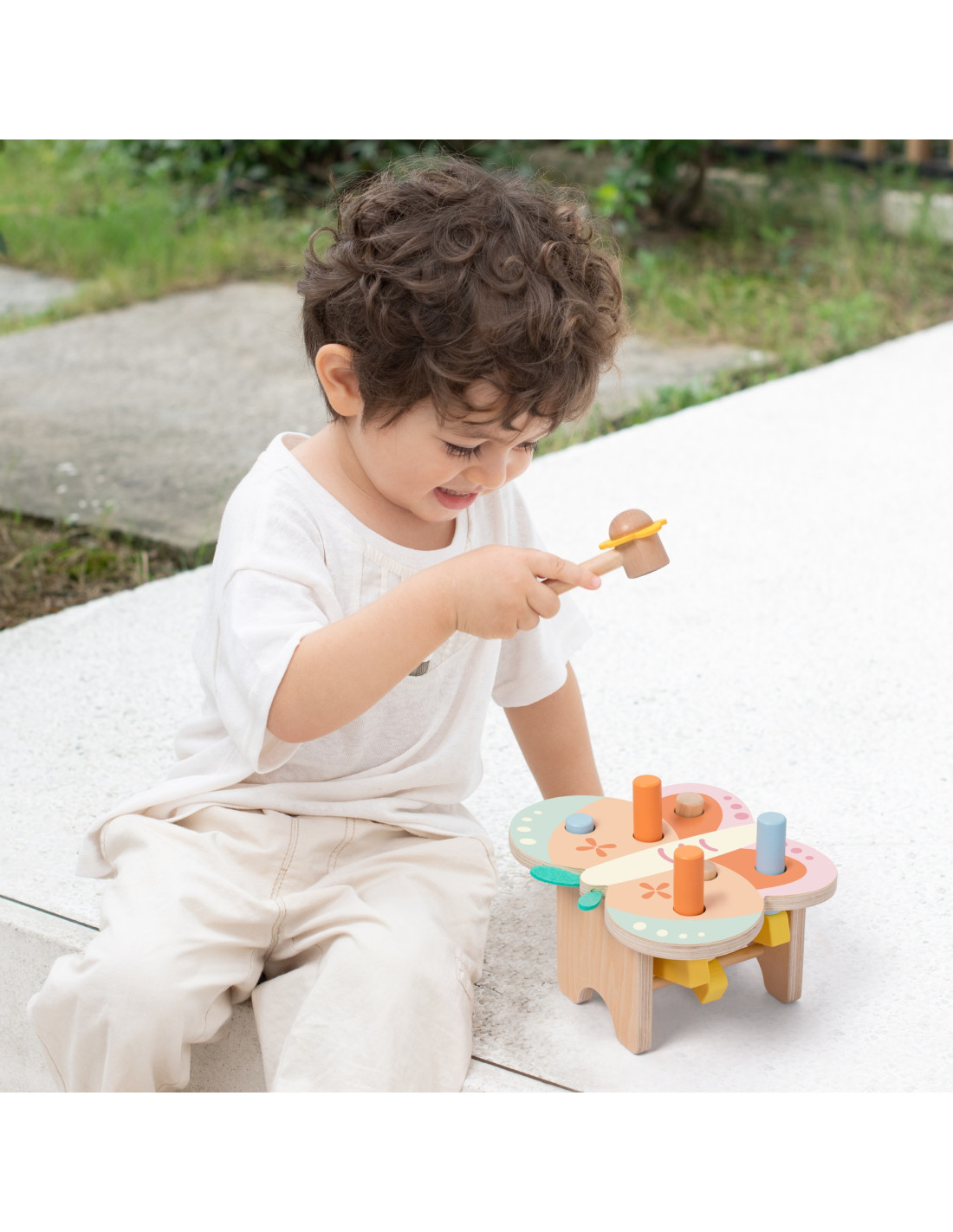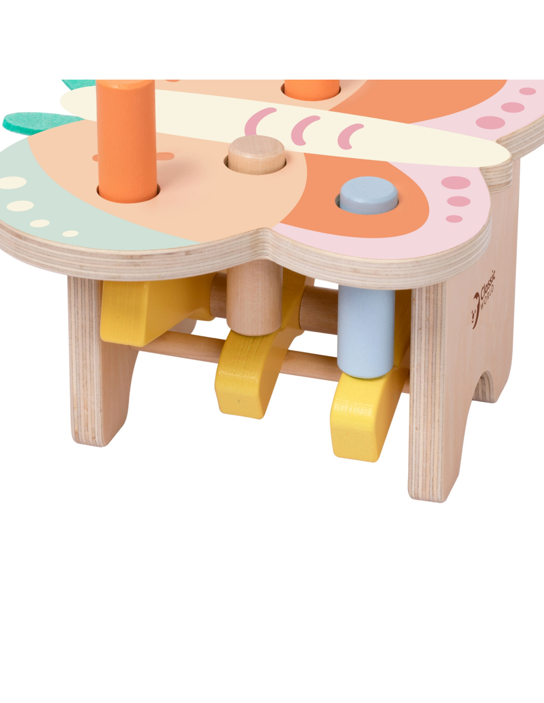 Oto idealna zabawka dla maluchów, które uwielbiają uderzać, stukać i odkrywać dźwięki! Drewniany stolik w kształcie motyla to kolorowa i angażująca forma zabawy, która wspiera rozwój motoryczny i koordynację ręka-oko. W zestawie znajduje się młoteczek w kształcie kwiatka, który dodaje uroku i zachęca dzieci do aktywnej zabawy.