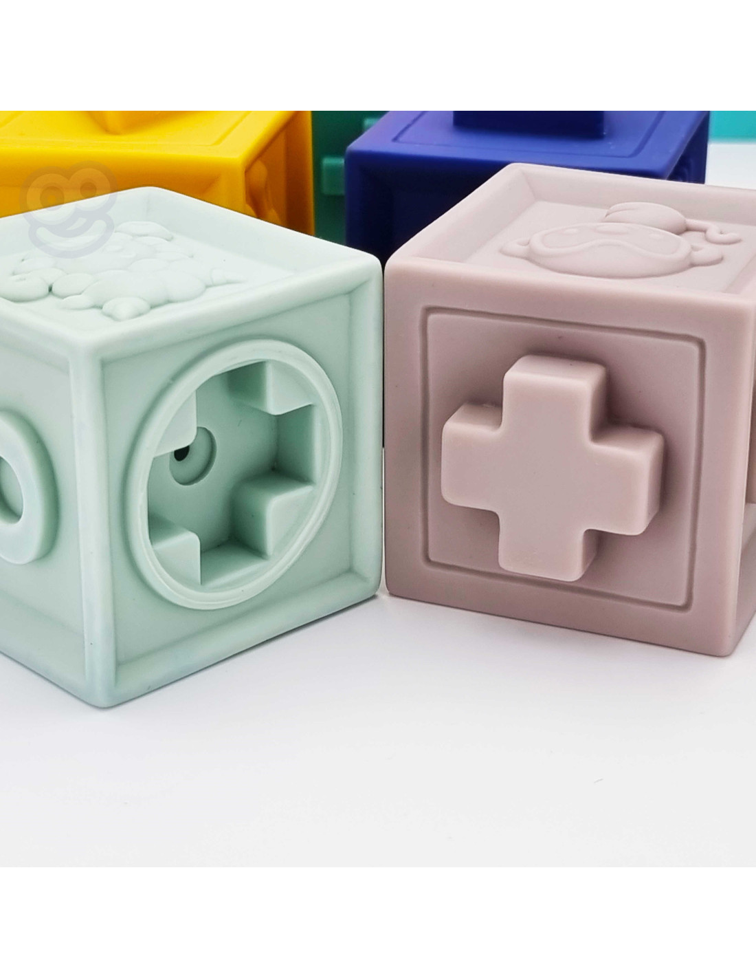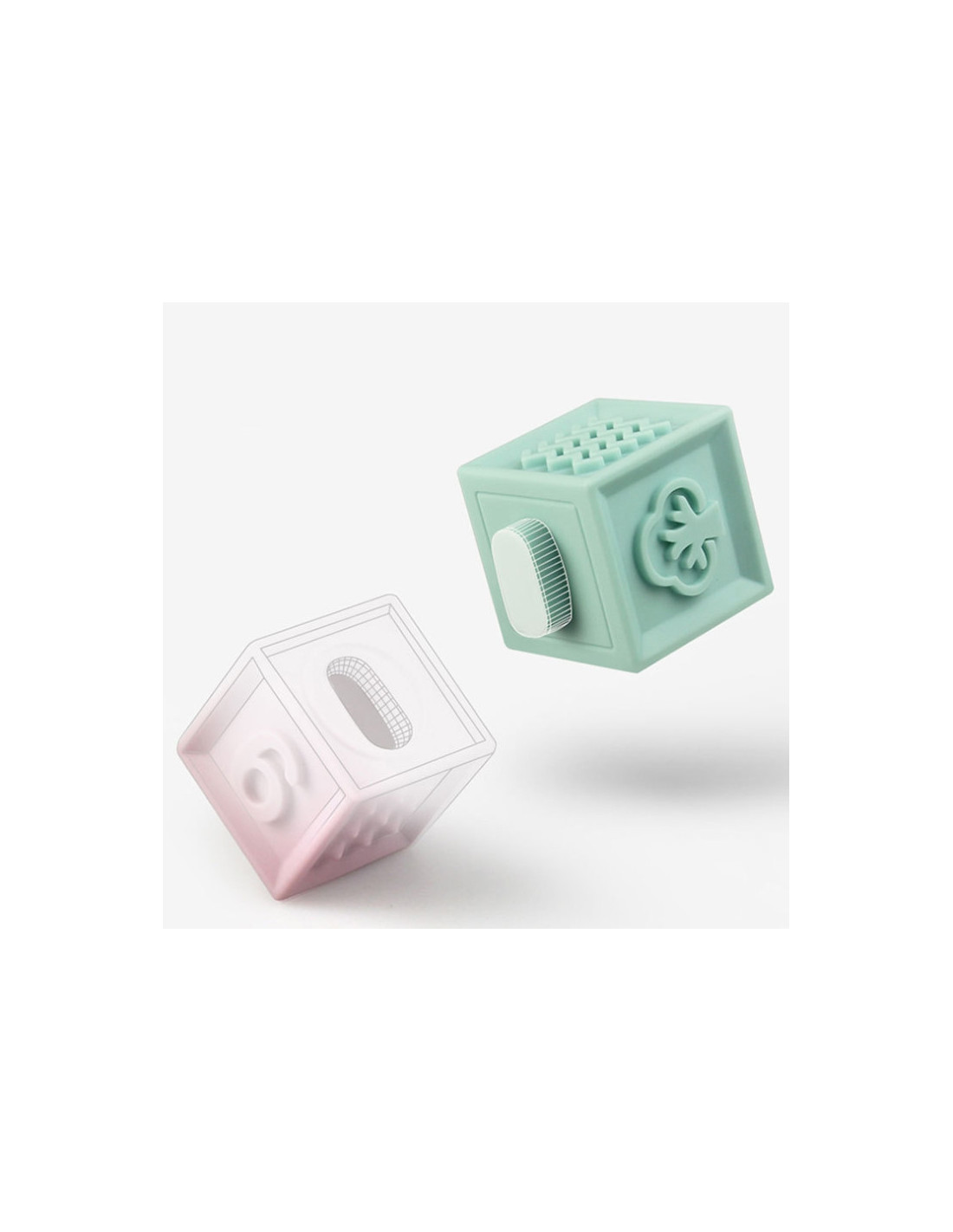 WOOPIE Układanka Klocki Sensoryczne zaciekawią każdego malucha. Dzięki ciekawym kształtom, kolorom i możliwości wydawania dźwięku przez ściśnięcie doskonale stymulują rozwój koordynacji wzrokowo-słuchowej i motorycznej dziecka. Klocki posiadają wypukłe kształty, które pozwalają na dopasowywanie ich do siebie i łączenie. Każdy bok klocka jest inny. Znajdują się na nich wypukłe kształty, zwierzątka i cyferki do nauki dla starszych dzieci. Klocki wydają dźwięki podczas ściskania. Dzięki swojej budowie sprawdzą się również doskonale jako gryzak. Produkt w stonowanej kolorystyce przeznaczony dla dzieci od 6 miesiąca życia.