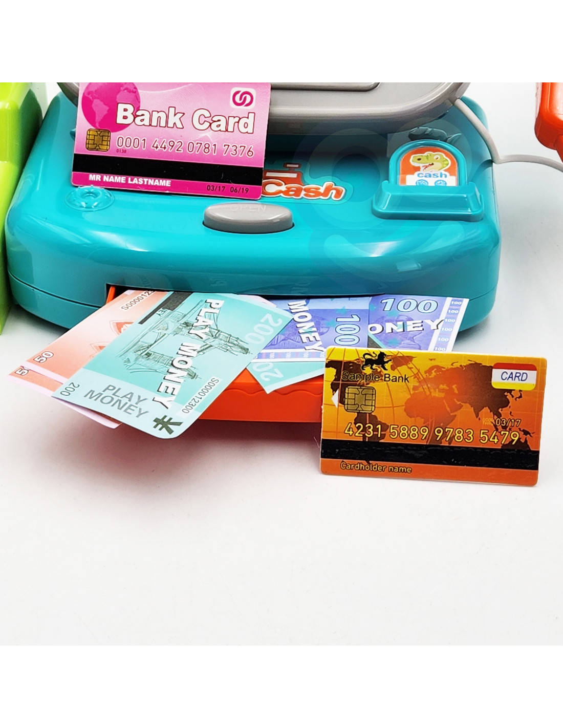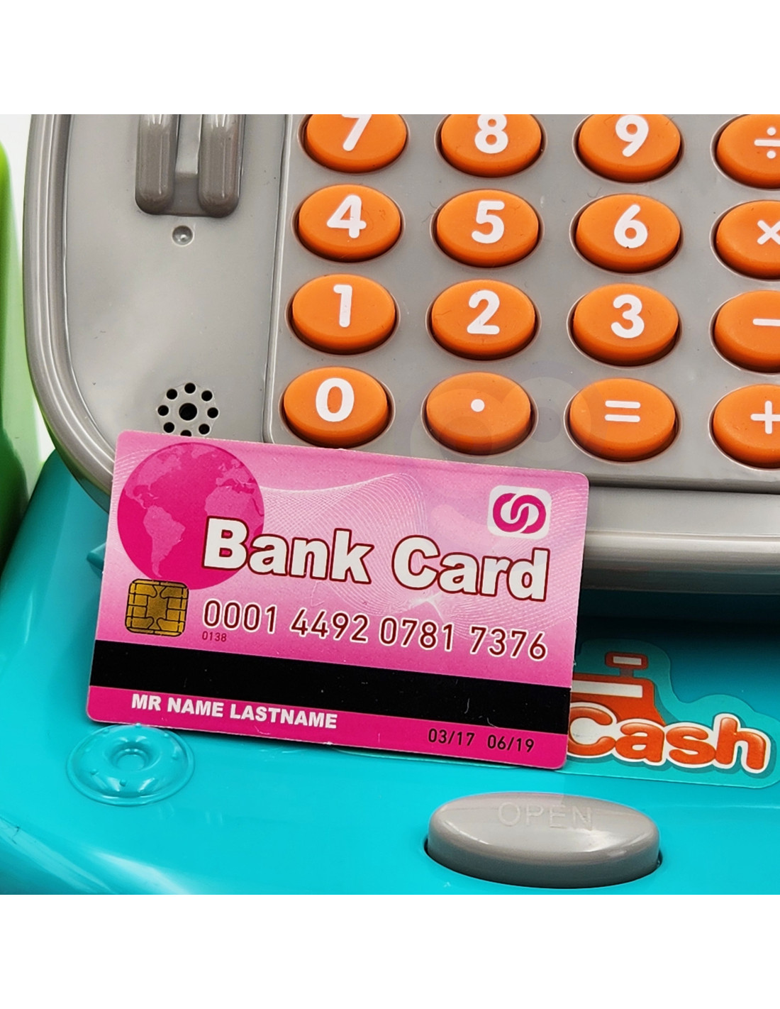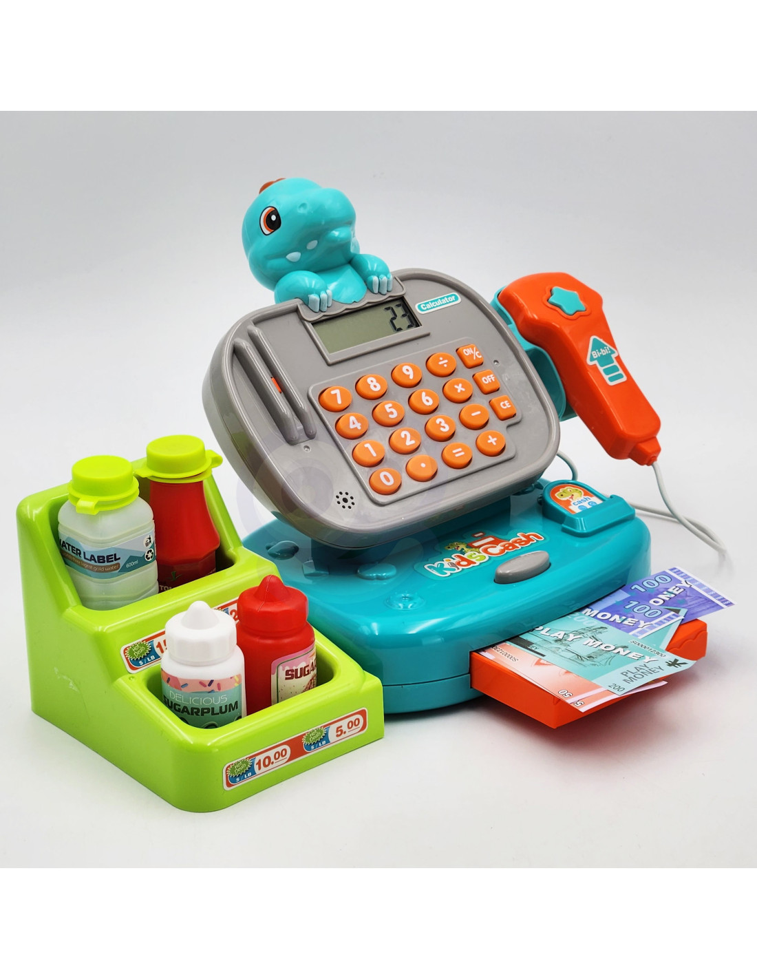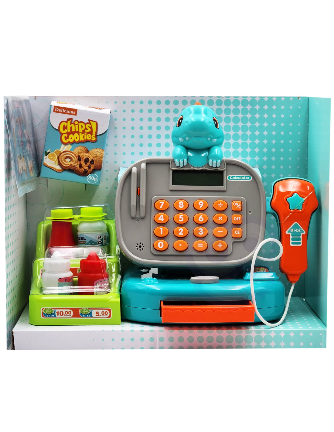 - - kasę sklepową z kalkulatorem i otwieraną kasetka na przechowywanie pieniążków,