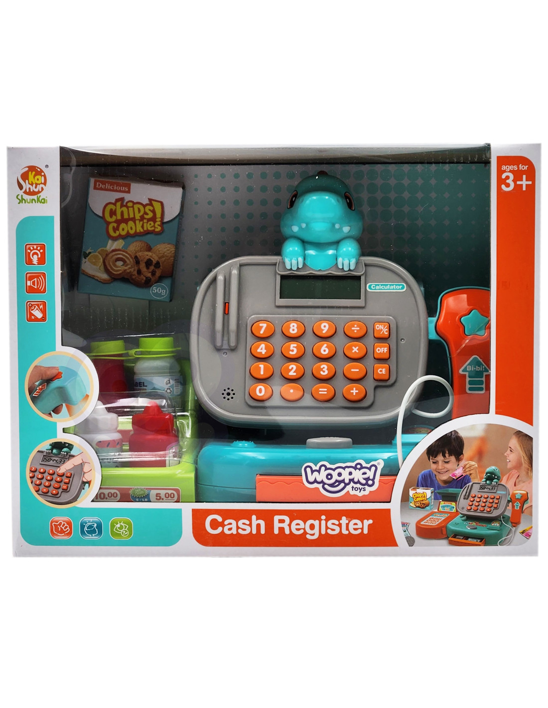 Kasa sklepowa Dino z Półką od marki WOOPIE to idealna propozycja zabaw. Dzieci mogą wybrać produkty, które chcą kupić, a następnie nabić je na kasę. Przy pomocy czytnika zeskanują ciasteczka i inne produkty. Następnie kupujący może zapłacić pieniążkami lub kartą płatniczą.
