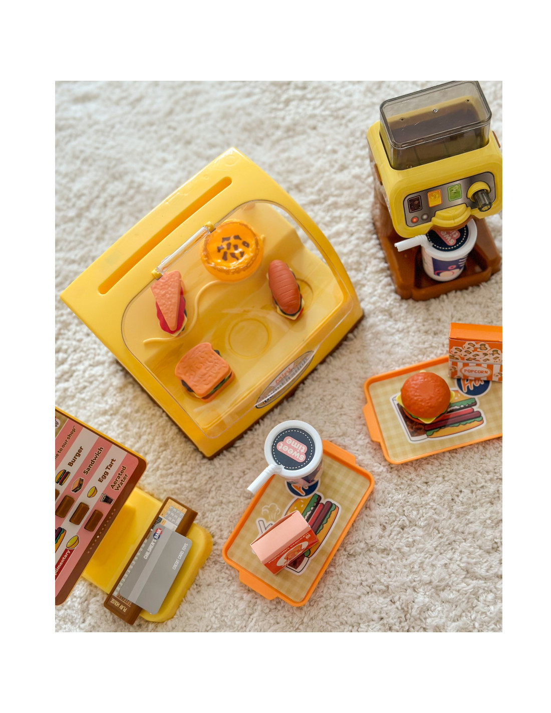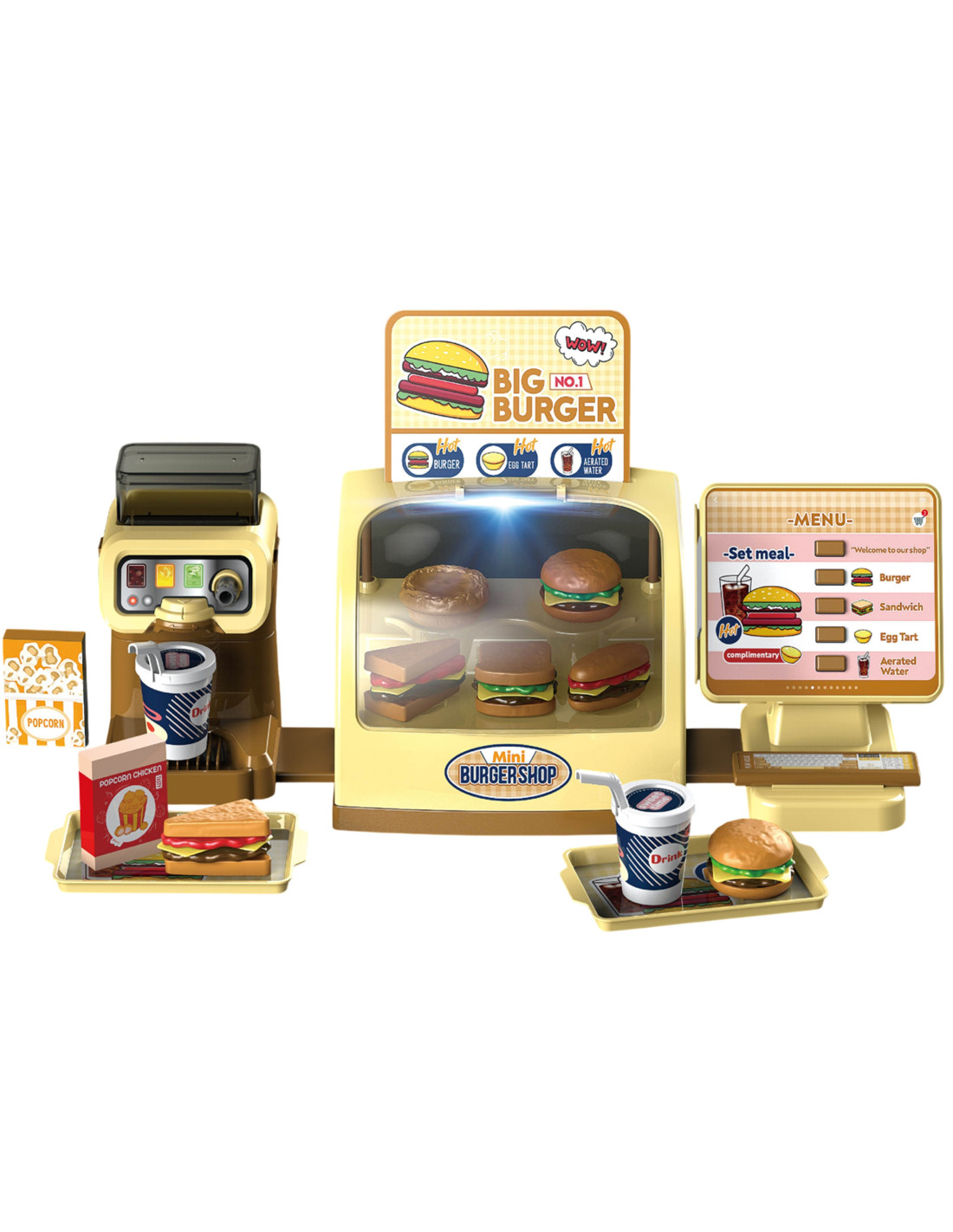 Mini Burger Shop "BIG BURGER" od marki WOOPIE to wspaniały zestaw do zabawy. Możemy obsługiwać Klientów, którzy wybierają dania prosto z oświetlonej lady! Posiada ekran z przyciskami po naciśnięciu których sklep oferuje nam efekty dźwiękowe! Możemy wlać wodę do dystrybutora, i nalewać ją do specjalnie przeznaczonych do tego kubków ze słomką. Zestaw rozwija zdolności manualne, wyobraźnię, kreatywność oraz zdolności samodzielnego myślenia.