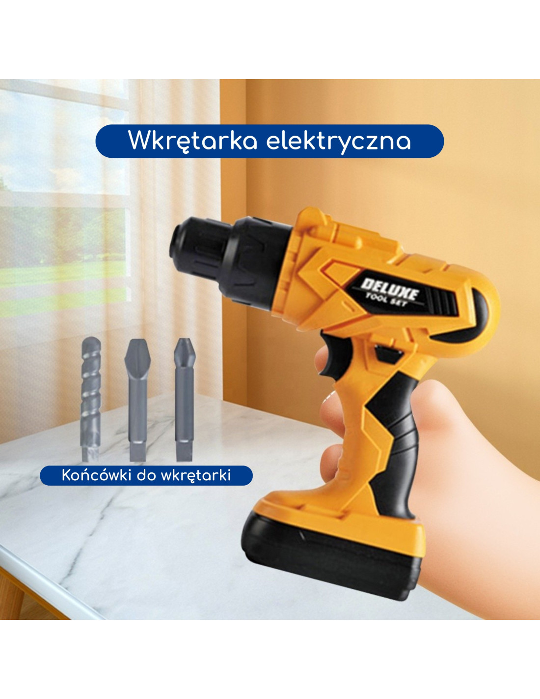 - - Cechy: Zestaw zawiera wkrętarkę elektryczną z wymiennymi końcówkami, akcesoria jak gogle i maska ochronna, oraz skrzynkę narzędziową do przechowywania