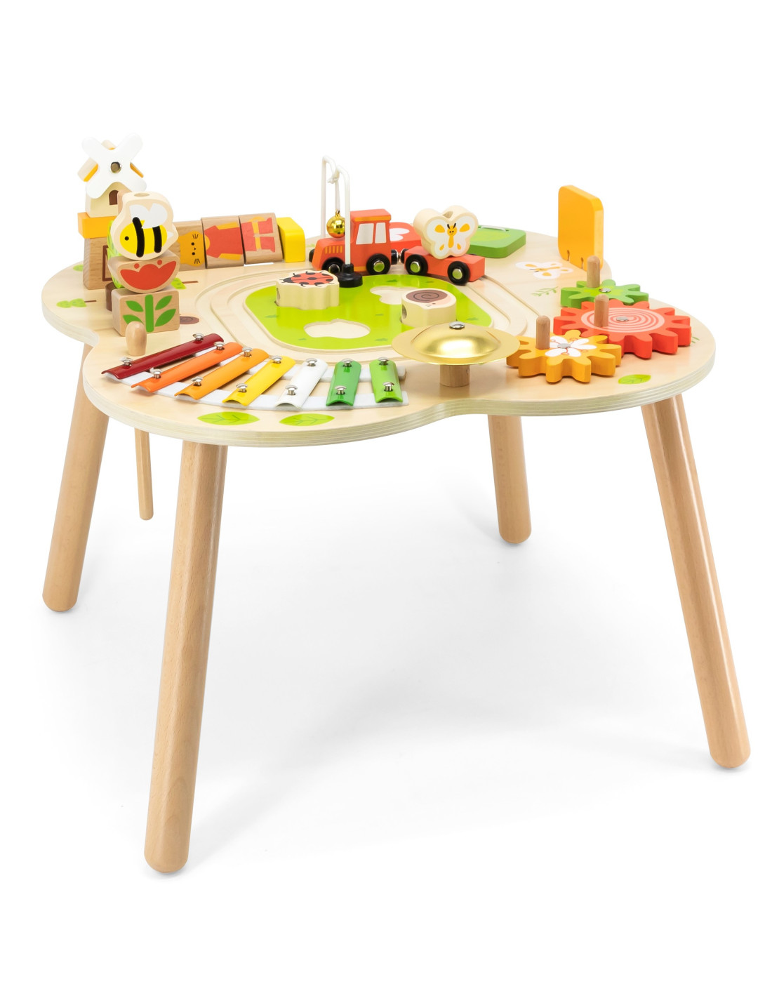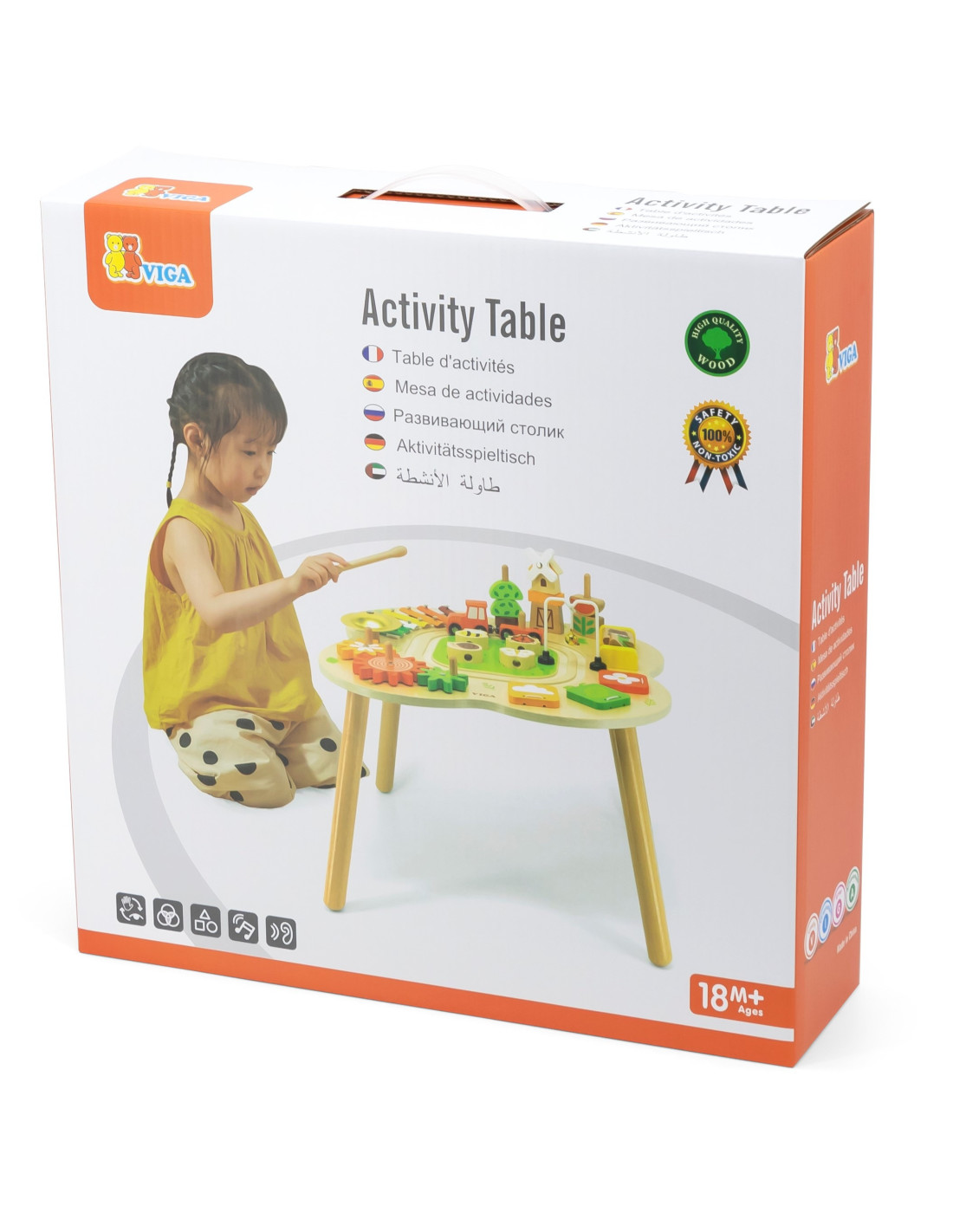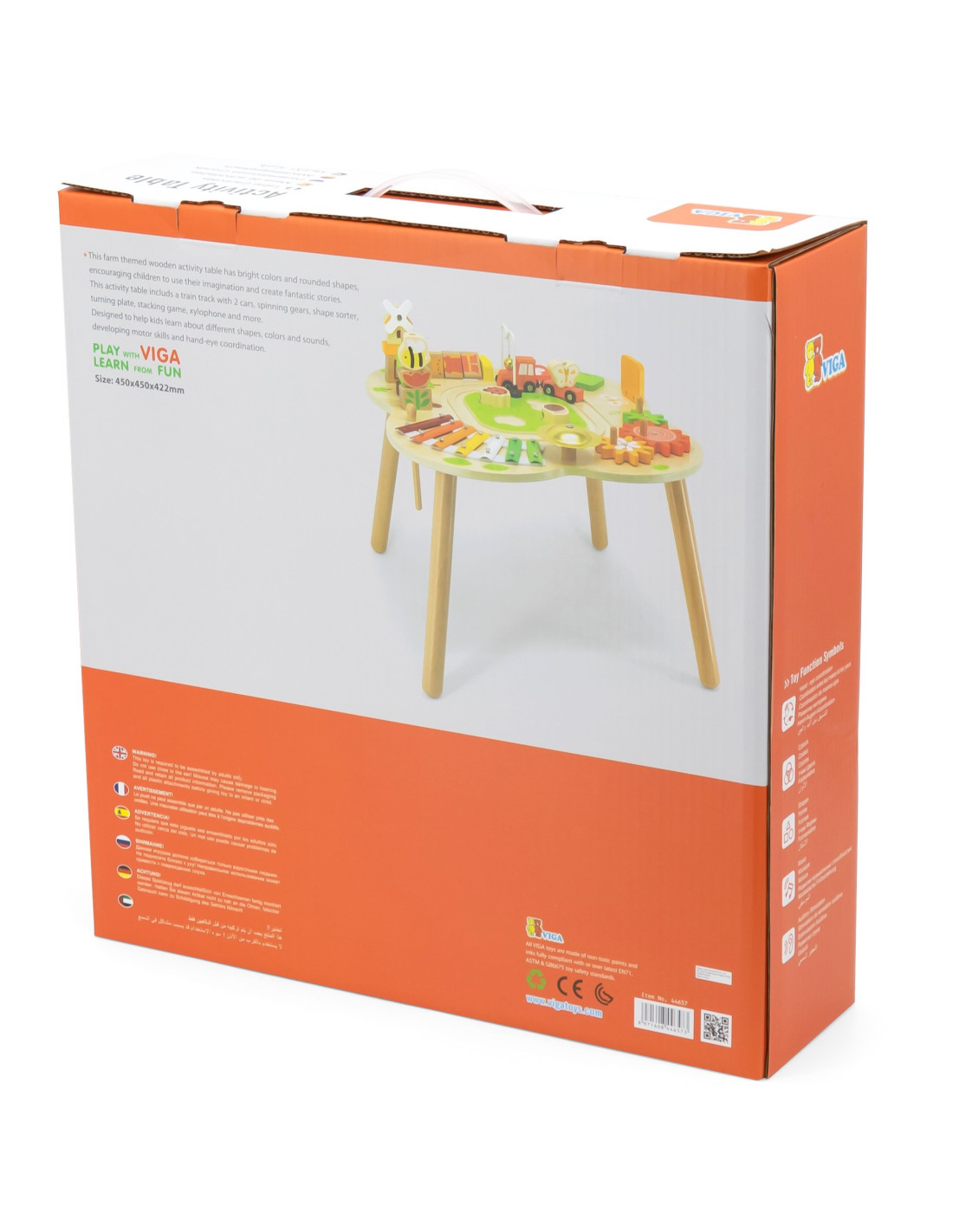 Drewniany stolik edukacyjny od firmy Viga to jedna z czołowych zabawek, która będzie służyła długo i zapewni Twojemu dziecku wiele lat ciekawej i kreatywnej zabawy. Stolik jest wystarczająco duży, aby kilkoro dzieci mogło bawić się jednocześnie. Kolorowy stół edukacyjny cieszy oko i zachęca do zabawy. Na stole zamontowane są koła zębate, cymbałki, dzwoneczek, piramidki, tor kolejowy oraz układanki. Całość została polakierowana i pomalowana bezpiecznymi dla dziecka farbami w żywe barwy, które zadowolą każdego użytkownika i dadzą mnóstwo radości z zabawy.