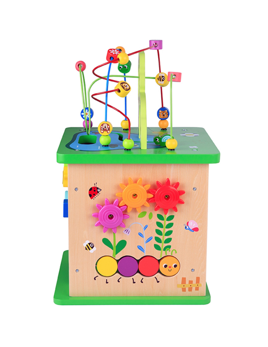 - - zabawka składa się z 5 różnych form aktywności: pętlę motoryczną, sorter, obracane klocki ze zwierzątkami w labiryncie , koła zębate i labirynt ze zwierzątkami i odpowiednią drogą do dopasowania względem kolorów,