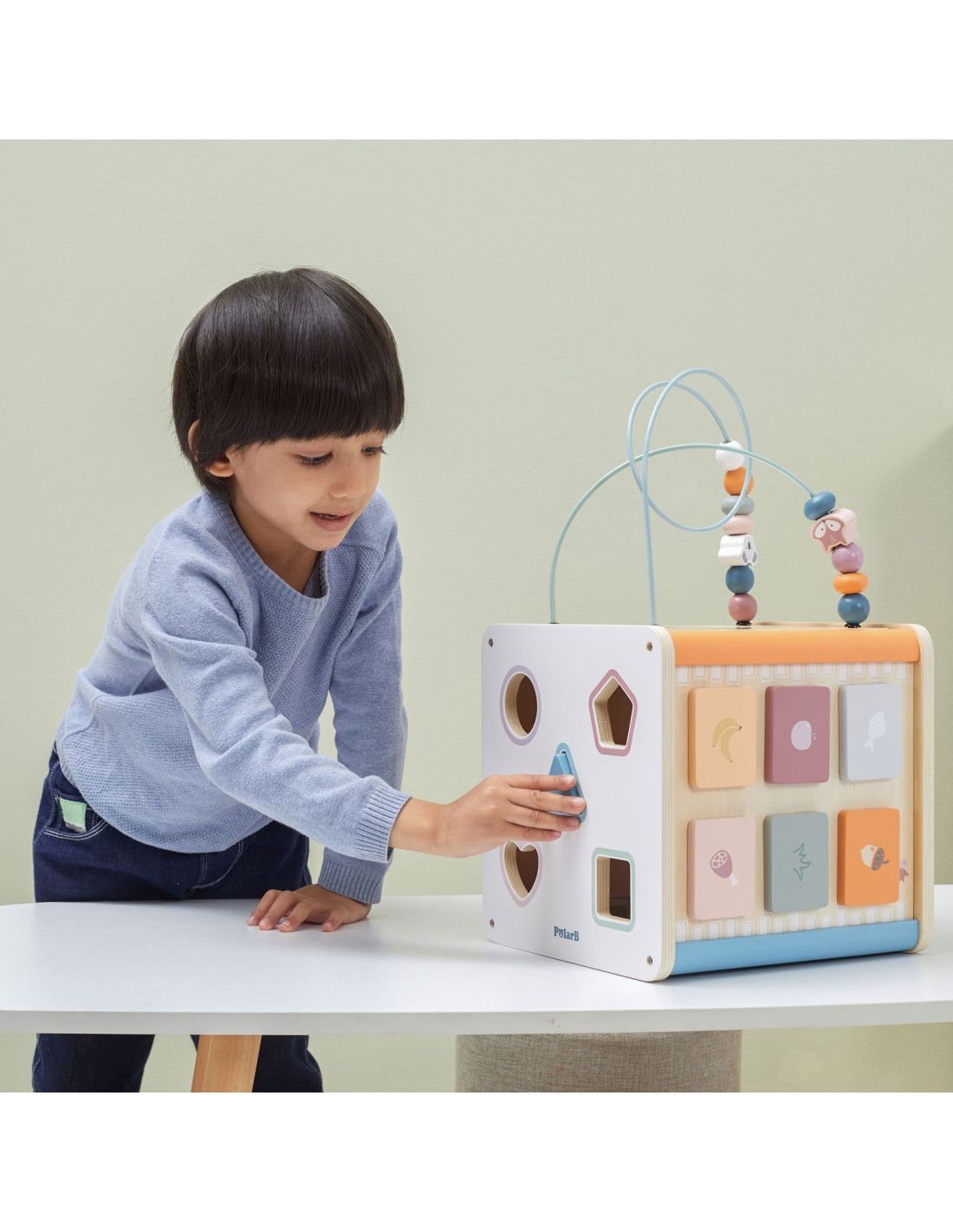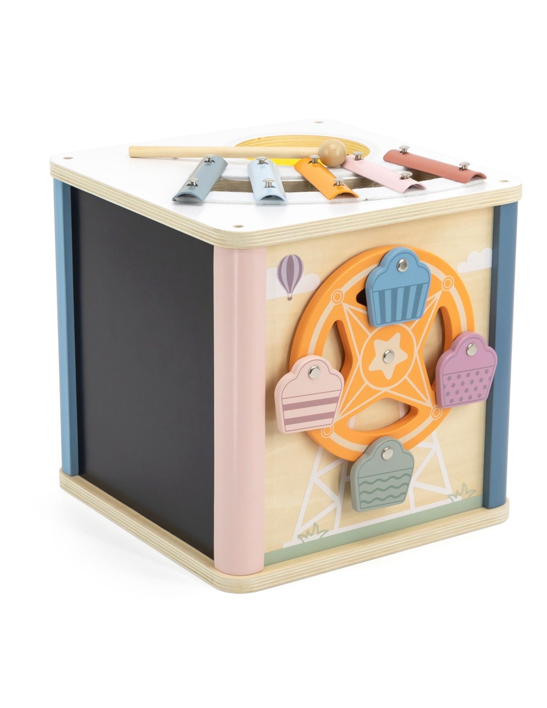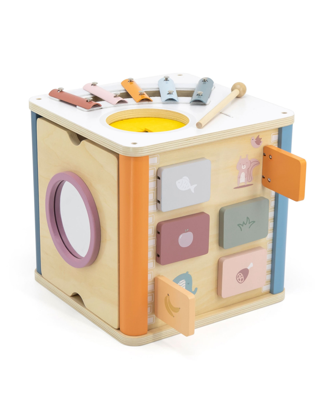Ta kostka edukacyjna posiada 8 różnych aktywności, które mają na celu zaspokoić różne aspekty rozwoju dziecka i wzbogacić naukę. Sorter kształtów, pętla motoryczna i obracające się koło pozwalają na ćwiczenie koordynacji wzrokowo-ruchowej, małej motoryki i rozumienia przestrzennego. Ksylofon i tablica kredowa rozwijają kreatywność, a lusterko i przesłona do wyciągania klocków wspierają rozwój umiejętności poznawczych. Ósmą i ostatnią aktywnością jest ścianka z ukrytymi zwierzątkami za klapkami odpowiadającymi ich pożywieniu.