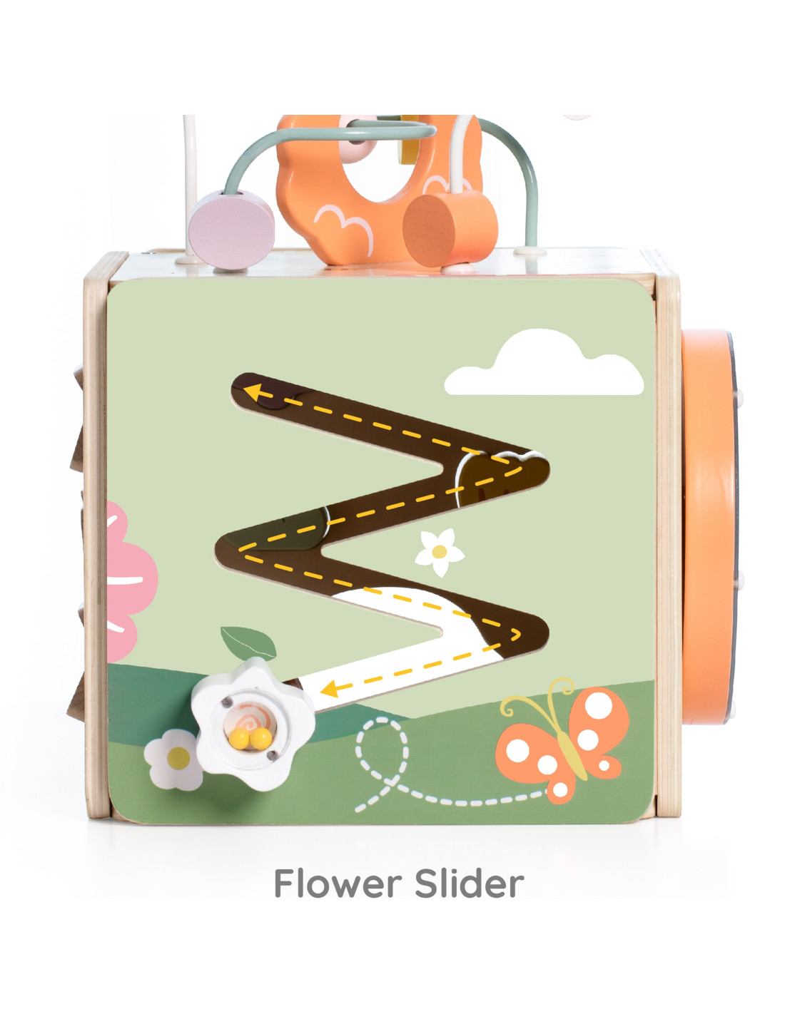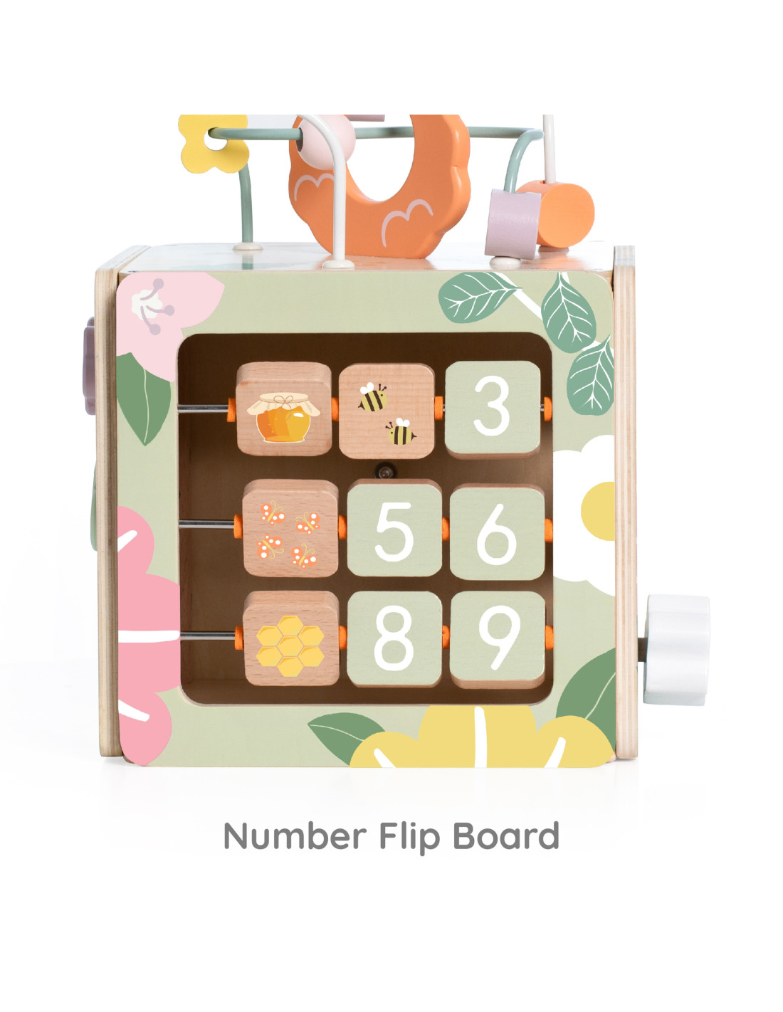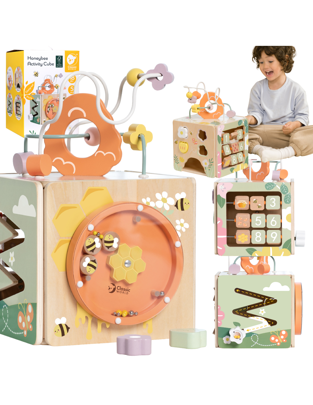 Pudełko aktywności 5w1 od marki CLASSIC WORLD to kolorowy artystyczny sześcian składający się z obracających się klocków z liczbami i obrazkami, labiryntu koralików, suwaków, geometrycznych kształtów czy koła z pszczółkami. Dzieci będą odkrywać mnogość kolorów, kształtów i nowych odkryć. Ciekawy wygląd oraz wielofunkcyjność zabawki zapewni dziecku długie godziny zabawy oraz nauki. Zabawka pobudzi kreatywność oraz rozwinie zdolności manualne malucha.