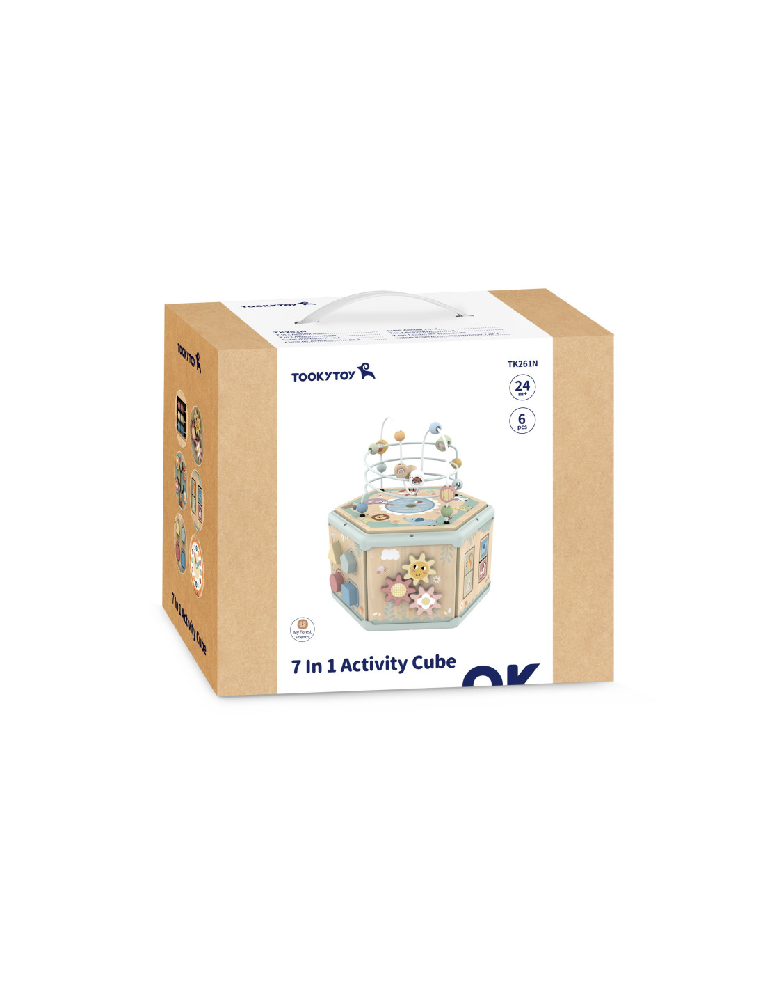 Drewniany multifunkcyjny sześciokąt z 7 aktywnościami od marki TOOKY TOY to interaktywna zabawka edukacyjna, która oferuje wiele różnych rodzajów zabawy na każdej ze swoich siedmiu stron. Dzieci mogą przesuwać koraliki w labiryntach, obracać koła zębate, dopasowywać kształty lub uczyć się zegara. Zabawka jest starannie wykonana przez co zachęca dzieci do zabawy. Dodatkowo górna ścianka jest otwierana co pozwala na przechowywanie zabawek naszego malucha.