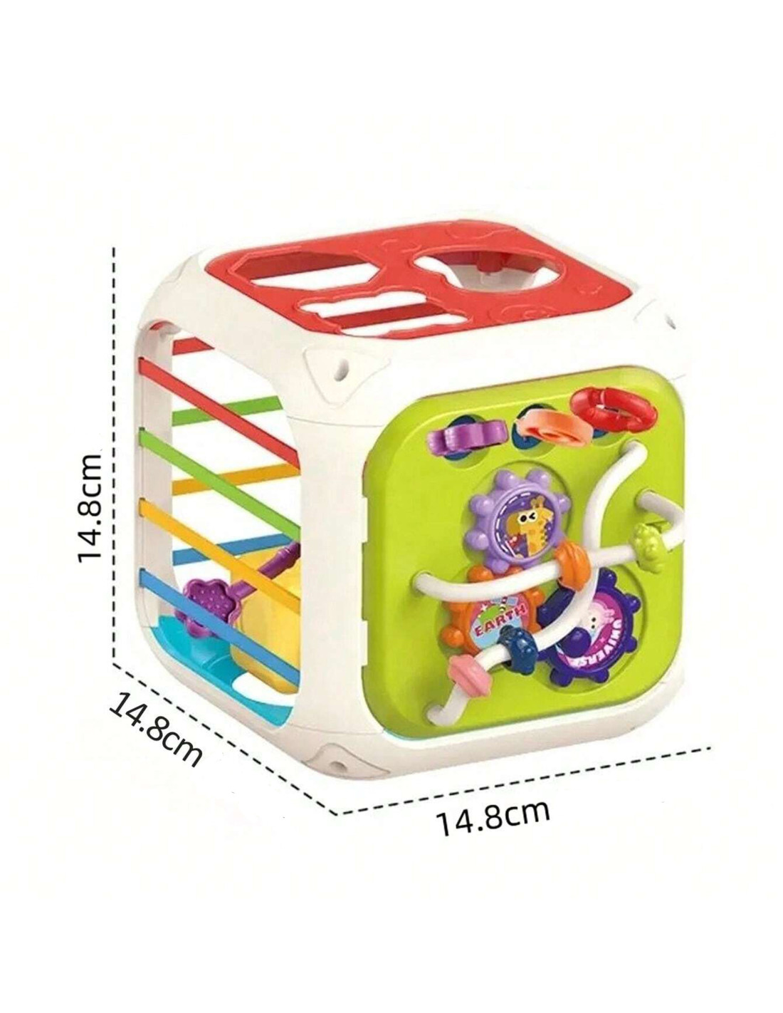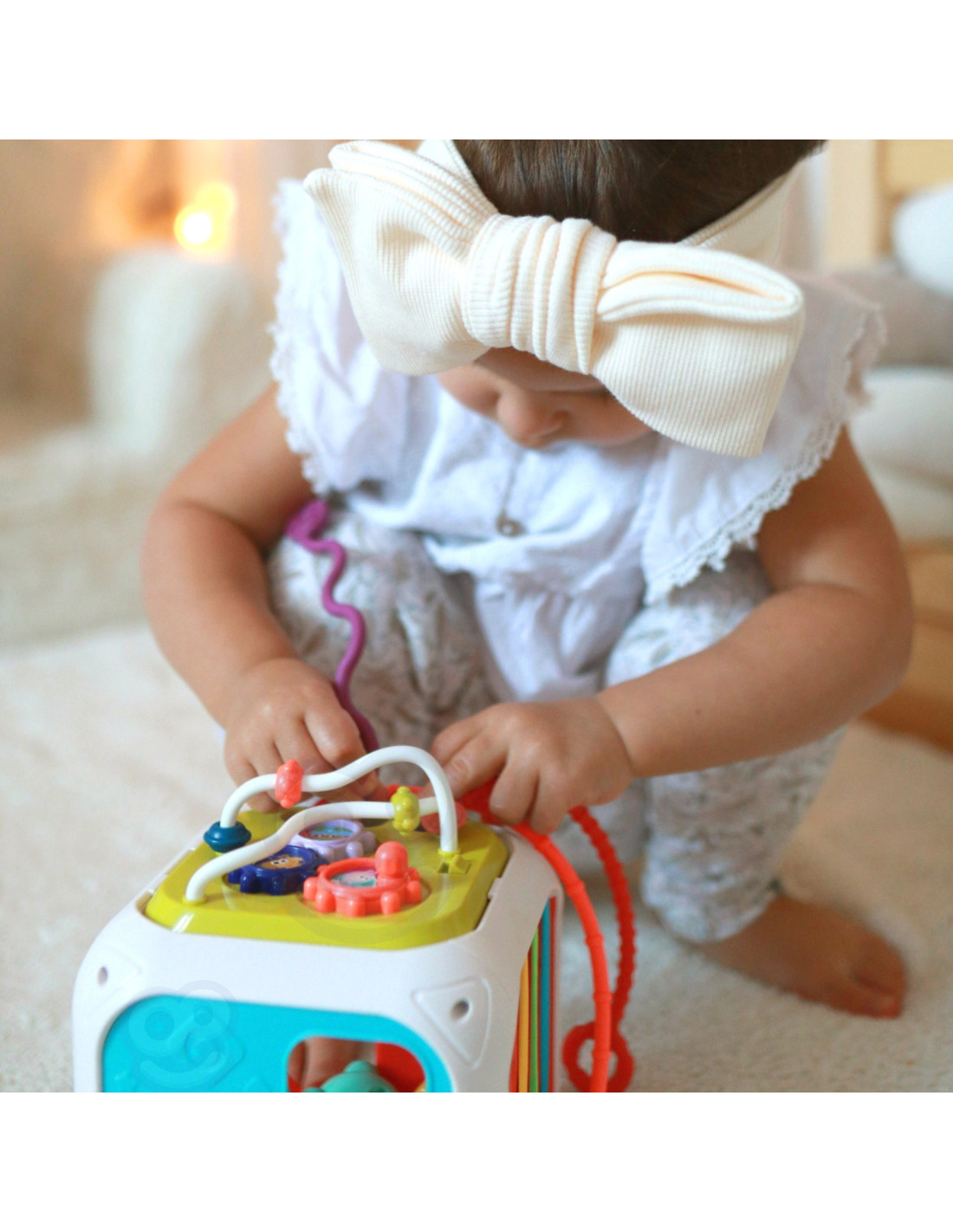 - - Każdy bok kostki to inna układanka kształtów, wzbogacona elastycznymi, kolorowymi wstążkami oraz sześcioma blokami do sortowania i układania, w których kryją się dzwoneczki.
