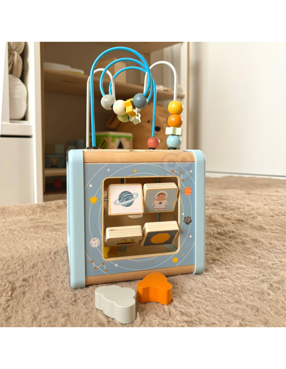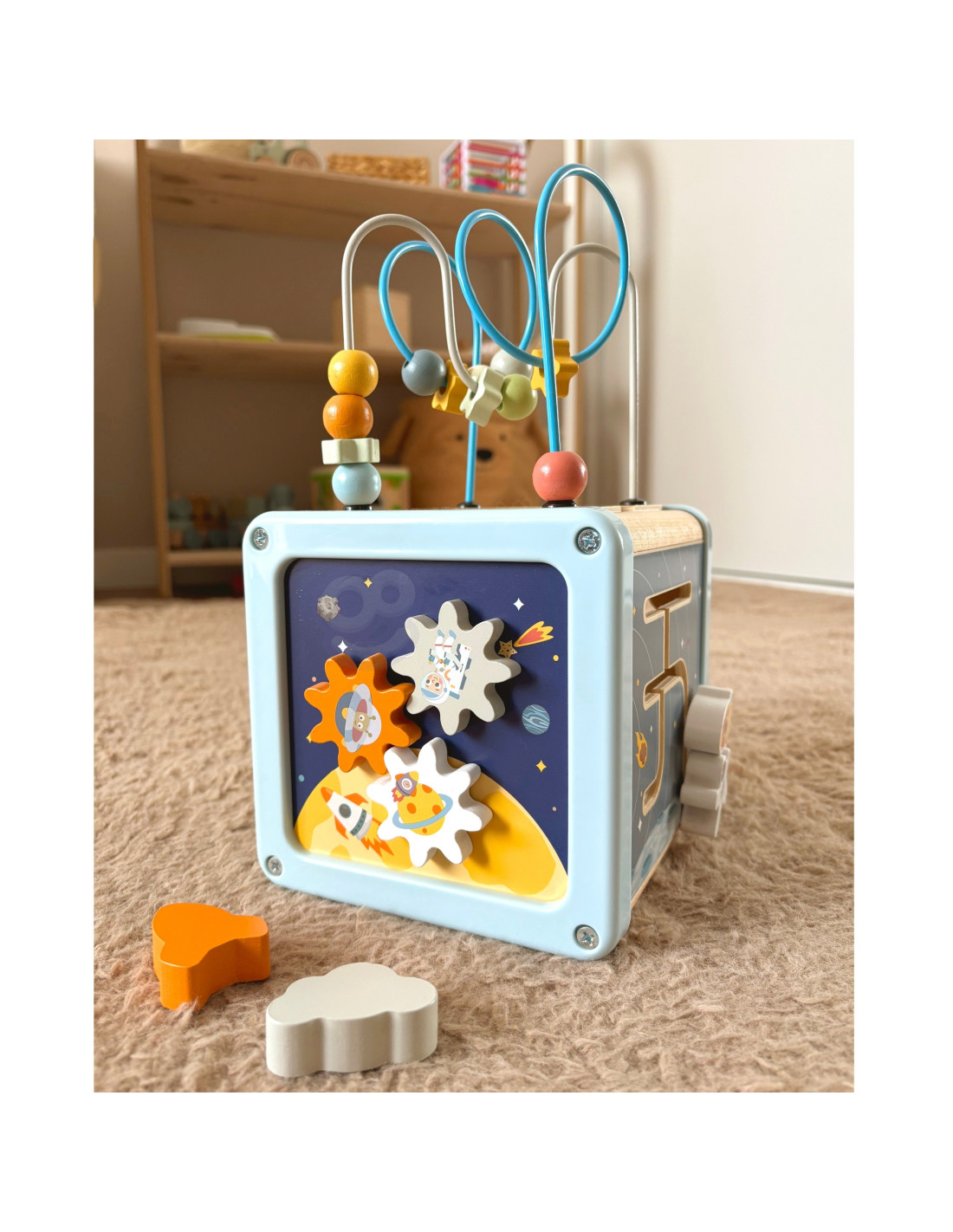 - Otwory w kształcie planety, gwiazdki, rakiety i chmurki stworzone specjalnie do sortowania klocków. Dziecko może bawić się kształtami, doskonaląc jednocześnie umiejętności logicznego myślenia.
