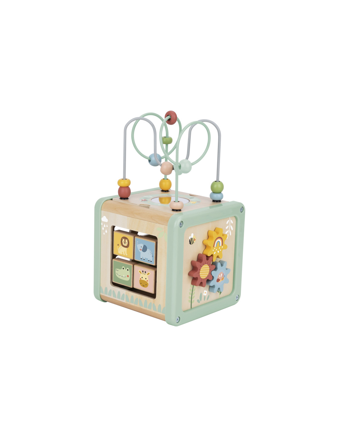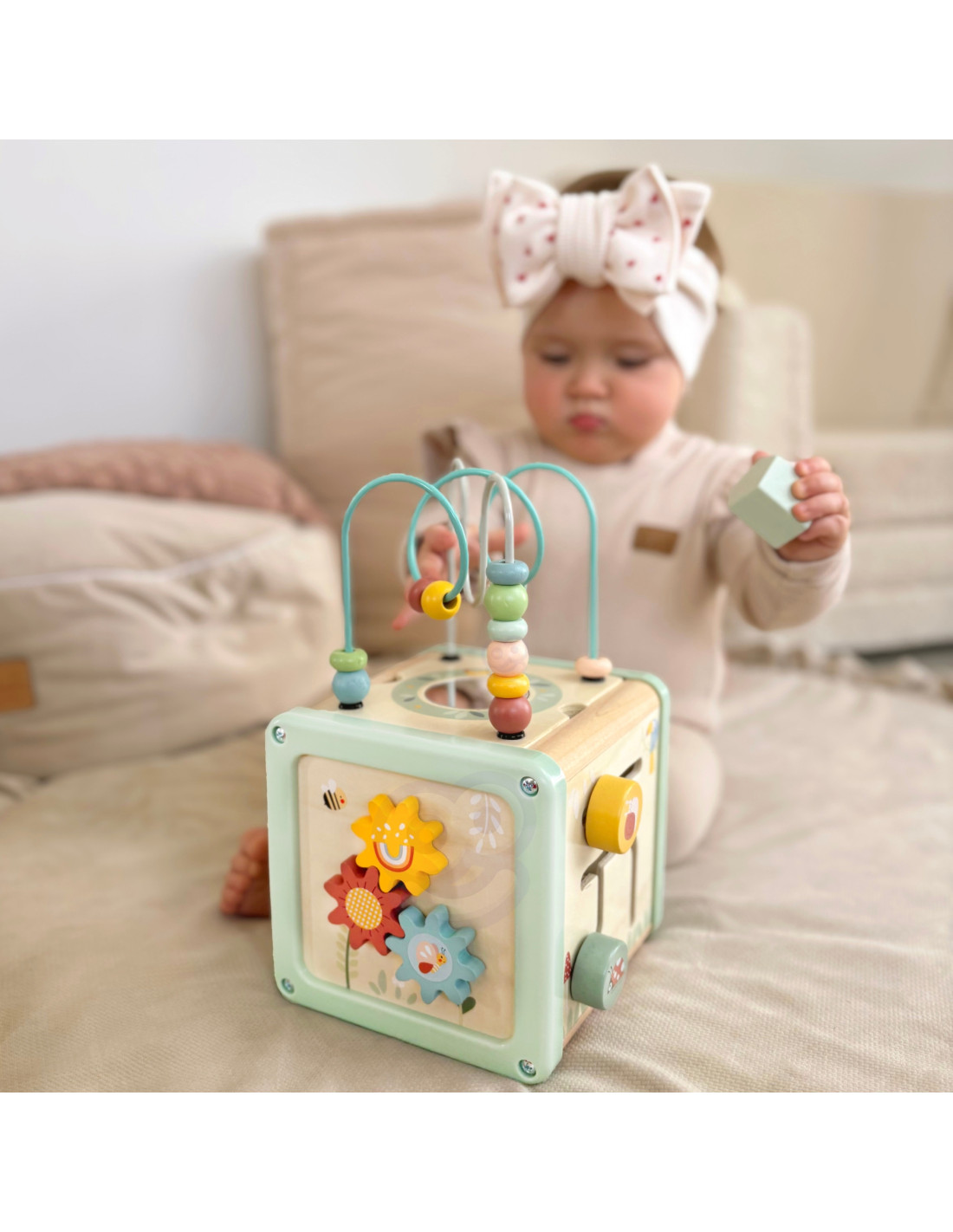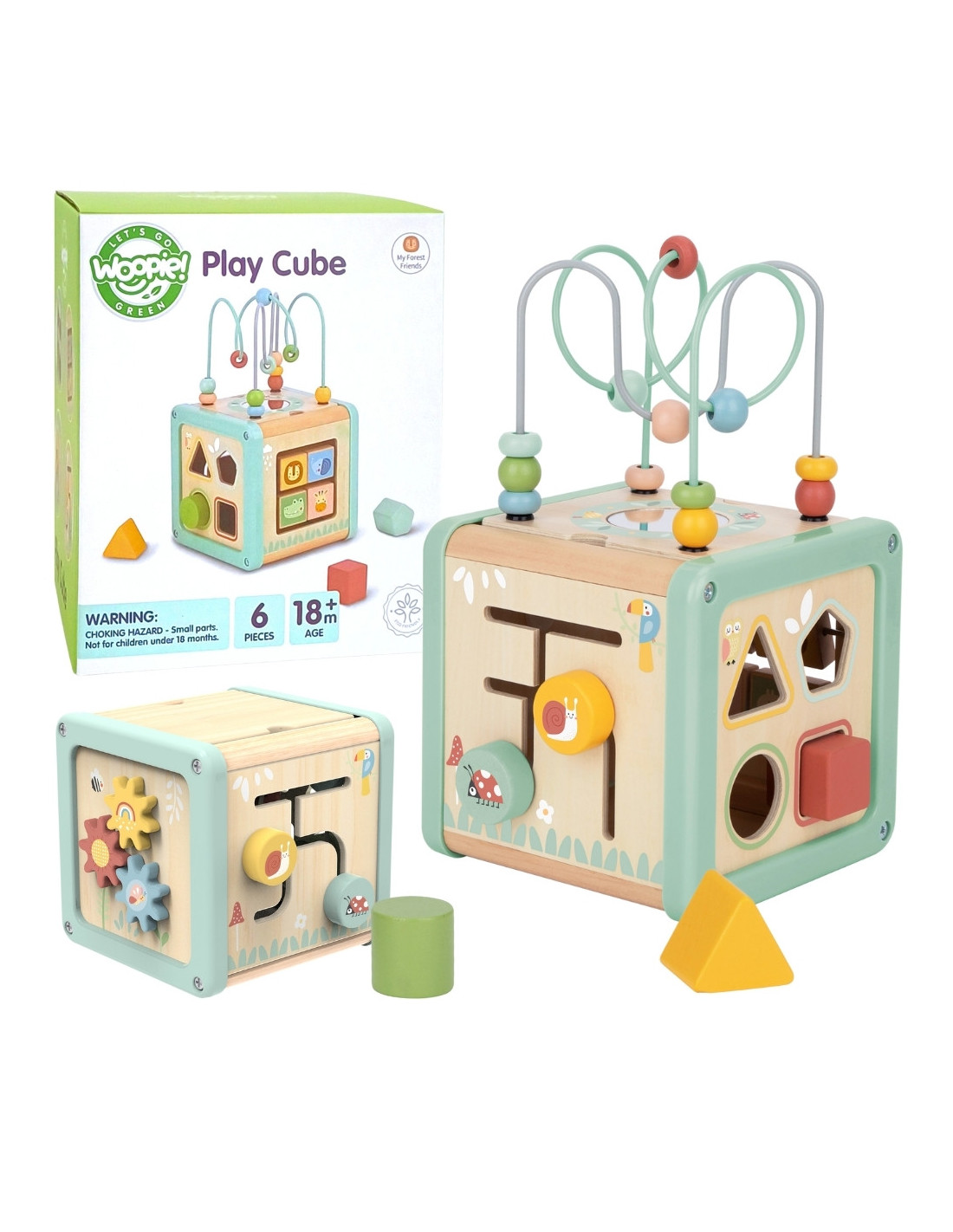 Drewniana Kostka Aktywności od marki WOOPIE GREEN to fantastyczny zestaw edukacyjny, który rozweseli malucha i pomoże w nauce podstawowych umiejętności. Dzięki wielostronnym panelom, które oferują różnorodne zabawy, dziecko będzie mogło odkrywać zębatki, klocki, sortery, suwaki, a także labirynt z koralikami. Wszystko to w delikatnych pastelowych kolorach, które przyciągają wzrok i zachęcają do zabawy.